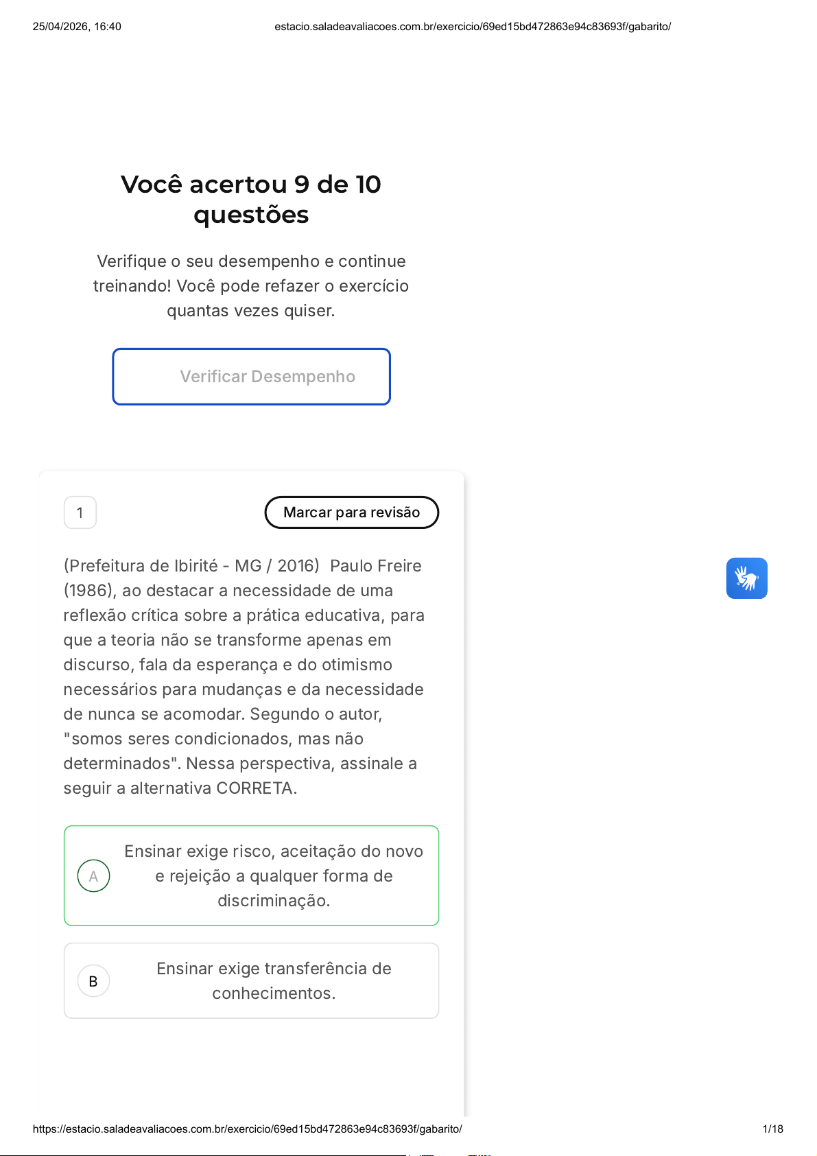 Você acertou 9 de 10 questões Verifique o seu desempenho e continue treinando! Você pode refazer o exercício quantas vezes quiser. Verificar Desempenho A B 1 Marcar para revisão (Prefeitura de Ibirité - MG / 2016) Paulo Freire (1986), ao destacar a necessidade de uma reflexão crítica sobre a prática educativa, para que a teoria não se transforme apenas em discurso, fala da esperança e do otimismo necessários para mudanças e da necessidade de nunca se acomodar. Segundo o autor, "somos seres condicionados, mas não determinados". Nessa perspectiva, assinale a seguir a alternativa CORRETA. Ensinar exige risco, aceitação do novo e rejeição a qualquer forma de discriminação. Ensinar exige transferência de conhecimentos. 25/04/2026, 16:40 estacio.saladeavaliacoes.com.br/exercicio/69ed15bd472863e94c83693f/gabarito/ https://estacio.saladeavaliacoes.com.br/exercicio/69ed15bd472863e94c83693f/gabarito/ 1/18 C D E Ensinar exige a desmistificação das palavras pelo exemplo. Ensinar exige o reconhecimento e a assunção da identidade cultural. Ensinar exige lidar com as condições econômicas e preparar o proletariado para a revolução. Resposta correta Parabéns, você selecionou a alternativa correta. Confira o gabarito comentado! Gabarito Comentado A alternativa correta é "Ensinar exige risco, aceitação do novo e rejeição a qualquer forma de discriminação". Esta afirmação está alinhada com o pensamento de Paulo Freire, que enfatiza a necessidade de uma abordagem educacional crítica e reflexiva. Freire acreditava que a educação deve ser um processo de libertação, que envolve riscos, aceitação de novas ideias e a rejeição de qualquer forma de discriminação. Portanto, a educação não é apenas uma transferência de conhecimentos, mas um processo complexo que exige coragem, abertura para o novo e um compromisso com a igualdade e a justiça social. 2 Marcar para revisão 25/04/2026, 16:40 estacio.saladeavaliacoes.com.br/exercicio/69ed15bd472863e94c83693f/gabarito/ https://estacio.saladeavaliacoes.com.br/exercicio/69ed15bd472863e94c83693f/gabarito/ 2/18 A B C "Mudar a cara da escola pública implica também ouvir meninos e meninas, sociedades de bairro, pais, mães. Diretoras, delegados de ensino, professoras, supervisoras, comunidade científica, zeladores, merendeiras (...). É claro que não é fácil! Há obstáculos de toda ordem retardando a ação transformadora. O amontoado de papéis tomando o nosso tempo, os mecanismos administrativos emperrando a marcha dos projetos, os prazos para isto, para aquilo, um deus-nos-acuda" (...). (FREIRE, Paulo. A educação na cidade. São Paulo: Cortez, 1991 p.35). Assinale a alternativa que corresponde, corretamente, ao pensamento defendido por Freire para transformar a educação. A organização burocrática e a defesa de uma racionalidade técnico- instrumental devem ser mais eficientes. Deve ser estimulada uma participação fictícia e heterônoma, atrelada à Educação Bancária. É necessário garantir a dominação das elites e a utilização da racionalidade técnico-burocrática sejam mais atuantes. 25/04/2026, 16:40 estacio.saladeavaliacoes.com.br/exercicio/69ed15bd472863e94c83693f/gabarito/ https://estacio.saladeavaliacoes.com.br/exercicio/69ed15bd472863e94c83693f/gabarito/ 3/18 D E As práticas reflexivas e emancipatórias precisam ser adotadas numa perspectiva dialética de organização educativa e cultural. Devem ser determinados objetivos consensuais, mensuráveis e comparáveis presentes na administração pública que busquem, essencialmente, resultados. Resposta correta Parabéns, você selecionou a alternativa correta. Confira o gabarito comentado! Gabarito Comentado Paulo Freire, em suas reflexões sobre as políticas públicas de educação, enfatiza a necessidade de democratização da escola pública e a formação contínua de seus educadores, incluindo todos os profissionais envolvidos no ambiente escolar. Ele defende que as escolas públicas devem ser inclusivas, transformadoras e emancipatórias. Nesse contexto, a alternativa D é a que melhor representa o pensamento de Freire, pois sugere a adoção de práticas reflexivas e emancipatórias numa perspectiva dialética de organização educativa e cultural, o que está em consonância com a visão de Freire sobre a transformação da educação. 3 Marcar para revisão 25/04/2026, 16:40 estacio.saladeavaliacoes.com.br/exercicio/69ed15bd472863e94c83693f/gabarito/ https://estacio.saladeavaliacoes.com.br/exercicio/69ed15bd472863e94c83693f/gabarito/ 4/18 A B Nas últimas décadas, mais adultos buscaram o retorno aos bancos escolares, seja por necessidade de alfabetização, seja com fins laborais. E, mais recentemente, a EJA também tem recebido muitos jovens que abandonaram as classes regulares. Nesse sentido, é fundamental um referencial pedagógico que faça frente a esse desafio, já que a cidadania é consolidada a partir de um "espaço de construção" que vai além dos muros da escola. Segundo Freire (1989, p. 6), a liberdade é "a matriz que atribui sentido a uma prática educativa que só pode alcançar efetividade e eficácia na medida da participação livre e crítica dos educados". Com base nesse pressuposto, a educação libertadora tem entre seus princípios a dialogicidade, a problematização e a reflexão crítica. GONÇALVES, F. C. L.; DAL-FARRA, R. A. A educação libertadora de Paulo Freire e o teatro na educação em saúde: experiências em uma escola pública no Brasil. Pro-Posições, v. 29, n. 3, p. 401-422, set. 2018. Com adaptações. São princípios da educação libertadora: I. Acreditar na igualdade fundamental entre os seres humanos. II. Buscar a transformação social como meio de contribuir para a justiça social. III. Organizar-se como um processo em que as pessoas sejam sujeitos de sua própria formação. IV. A educação libertadora tem como princípio fundamental a educação bancária. É correto o q