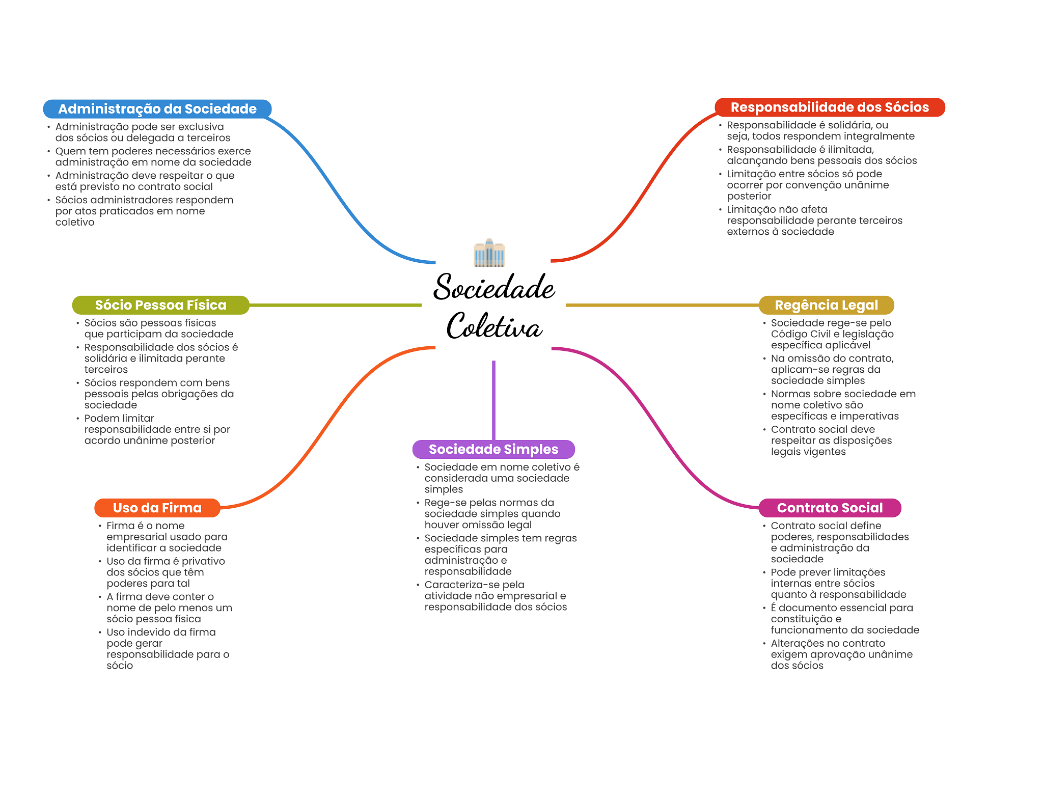 Administração da Sociedade Responsabilidade dos Sócios Administração pode ser exclusiva Responsabilidade é solidária, ou dos sócios ou delegada a terceiros seja, todos respondem integralmente Quem tem poderes necessários exerce Responsabilidade é ilimitada, administração em nome da sociedade alcançando bens pessoais dos sócios Administração deve respeitar que Limitação entre sócios só pode está previsto no contrato social ocorrer por convenção unânime Sócios administradores respondem posterior por atos praticados em nome Limitação não afeta coletivo responsabilidade perante terceiros externos à sociedade Sociedade Sócio Pessoa Física Regência Legal Sócios são pessoas físicas Coletiva Sociedade rege-se pelo que participam da sociedade Código Civil e legislação Responsabilidade dos sócios é específica aplicável solidária e ilimitada perante Na omissão do contrato, terceiros aplicam-se regras da Sócios respondem com bens sociedade simples pessoais pelas obrigações da Normas sobre sociedade em sociedade nome coletivo são Podem limitar específicas e imperativas responsabilidade entre si por Contrato social deve acordo unânime posterior respeitar as disposições Sociedade Simples legais vigentes Sociedade em nome coletivo é considerada uma sociedade simples Uso da Firma Rege-se pelas normas da Contrato Social sociedade simples quando Firma é O nome houver omissão legal Contrato social define empresarial usado para Sociedade simples tem regras poderes, responsabilidades identificar a sociedade específicas para e administração da Uso da firma é privativo administração e sociedade dos sócios que têm responsabilidade Pode prever limitações poderes para tal Caracteriza-se pela internas entre sócios A firma deve conter atividade não empresarial e quanto à responsabilidade nome de pelo menos um responsabilidade dos sócios É documento essencial para sócio pessoa física constituição e Uso indevido da firma funcionamento da sociedade pode gerar Alterações no contrato responsabilidade para exigem aprovação unânime sócio dos sócios