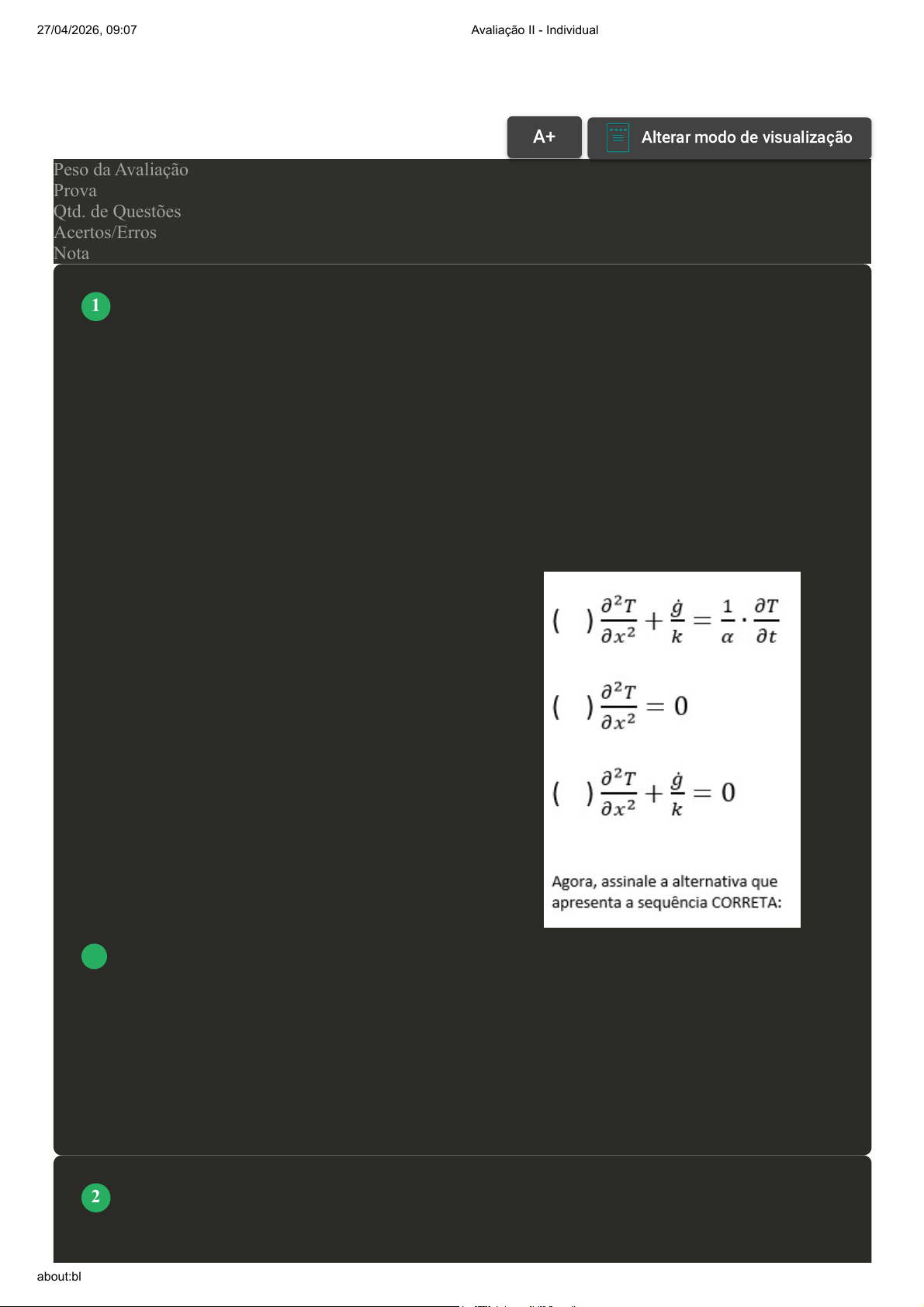 Prova Impressa GABARITO | Avaliação II - Individual (Cod.:1528169) Peso da Avaliação 2,00 Prova 110210050 Qtd. de Questões 10 Acertos/Erros 10/0 Nota 10,00 A condução de calor unidimensional em determinada geometria significa que a condução de calor é predominantemente em uma direção, sendo desprezível nas outras. Aplicando o balanço de energia no elemento fino de uma parede plana durante um pequeno intervalo de tempo, deduzimos várias equações oriundas da equação de Fourier-Biot, que podem ser aplicadas para fenômenos de condução de calor unidimensional, com ou sem geração de calor interna, condutividade térmica (k) constante e no estado transiente e estado permanente. Com base nestas possibilidades, faça uma análise das equações apresentadas e associe os itens, utilizando o código a seguir: I- Equação de Poisson, aplicada à condução de calor unidimensional, com geração de calor interna, condutividade térmica constante em estado permanente. II- Equação de Laplace, aplicada à condução de calor unidimensional, sem geração de calor interna, condutividade térmica constante em estado permanente. III- Equação de Fourier-Biot, aplicada à condução de calor unidimensional, com geração de calor interna, condutividade térmica constante em estado transiente. A III - II - I. B I - II - III. C III - I - II. D II - III - I. A difusividade térmica é uma razão entre a condutividade térmica do material e a sua capacidade térmica por volume (produto da densidade e o calor específico do material). Considere dois materiais diferentes, "A" e "B". A razão das condutividades térmicas, densidades e calores específicos dos VOLTAR A+Aumentar, FonteAlterar modo de visualização 1 2 27/04/2026, 09:07 Avaliação II - Individual about:blank 1/6 materiais está indicada na figura a seguir. Com base nestas informações, qual é a razão entre as difusividades térmicas dos materiais "A" e "B"? A 0,06. B 6,32. C 0,03. D 8,89. Durante o movimento de um fluido, quando ele escoa sobre uma superfície sólida, a camada de fluido adjacente à superfície tem uma velocidade menor do que a camada mais afastada. Sobre como esse fenômeno é conhecido, assinale a alternativa CORRETA: A Aletas de transferência de calor. B Radiação térmica. C Convecção forçada. D Convecção natural. A equação geral da condução de calor desenvolvida a partir do balanço de energia do elemento diferencial no volume não leva em consideração as condições térmicas nas fronteiras ou contorno das superfícies do elemento de volume. Portanto, precisamos inserir informações adicionais chamadas de condições de contorno e condição inicial. Com base neste conceito, classifique V para as sentenças 3 4 27/04/2026, 09:07 Avaliação II - Individual about:blank 2/6 verdadeiras e F para as falsas: ( ) Informações relacionadas a condições de contorno na superfície do problema podem ser temperatura conhecida ou fluxo de calor conhecido. ( ) Condições de contorno são expressões matemáticas que estabelecem as condições térmicas nas fronteiras do sistema em análise. ( ) O processo de integração da equação geral da condução de calor unidimensional em estado (regime) permanente gera apenas uma constante de integração (C1). Assinale a alternativa que apresenta a sequência CORRETA: A F - V - V. B F - F - V. C V - F - F. D V - V - F. A equação geral da condução de calor é baseada em uma vasta evidência experimental e sua dedução é feita a partir de um balanço de energia em um elemento infinitesimal de volume, geralmente em coordenadas retangulares, cilíndricas e esféricas. Com base nos termos da equação geral da condução de calor, analise as sentenças a seguir: I- O termo 'alfa' da equação geral da condução de calor é a difusividade térmica. II- O termo 'g' da equação geral da condução de calor é a geração de calor interna por unidade de volume. III- O termo de geração de calor só está presente na equação geral da condução de calor quando o fenômeno ocorre em estado (regime) permanente. Assinale a alternativa CORRETA: A Somente a sentença III está correta. B As sentenças I e III estão corretas. C Somente a sentença II está correta. D As sentenças I e II estão corretas. A equação geral da condução de calor desenvolvida a partir do balanço de energia do elemento diferencial no volume não leva em consideração as condições térmicas nas fronteiras ou contorno das superfícies do elemento de volume. Portanto, precisamos inserir informações adicionais chamadas de condições de contorno e condição inicial. Com base neste conceito, classifique V para as sentenças verdadeiras e F para as falsas: ( ) As condições de contorno de 1ª espécie são as que especificam a temperatura nas fronteiras do sistema. ( ) As condições de contorno de 2ª espécie são as que envolvem a troca de calor por convecção nas fronteiras do sistema. ( ) As condições de contorno de 3ª espécie são as que especificam o fluxo de calor conhecido nas 5 6 27/04/2026, 09:07 Avaliação II - Individual about:blank 3/6 fronteiras do sistema. Assinale a alternativa que apresenta a sequência CORRETA: A V - V - F. B V - F - F. C F - F - V. D F - V - V. A equação geral da condução de calor desenvolvida a partir do balanço de energia do elemento diferencial no volume não leva em consideração as condições térmicas nas fronteiras ou contorno das superfícies do elemento de volume. Portanto, precisamos inserir informações adicionais chamadas de condições de contorno e condição inicial. Com base neste conceito, classifique V para as sentenças verdadeiras e F para as falsas: ( ) As condições de contorno são úteis para modelar matematicamente a equação que descreve a distribuição de temperatura por uma parede plana sujeita à condução de calor. ( ) Condições de contorno são expressões matemáticas que definem o