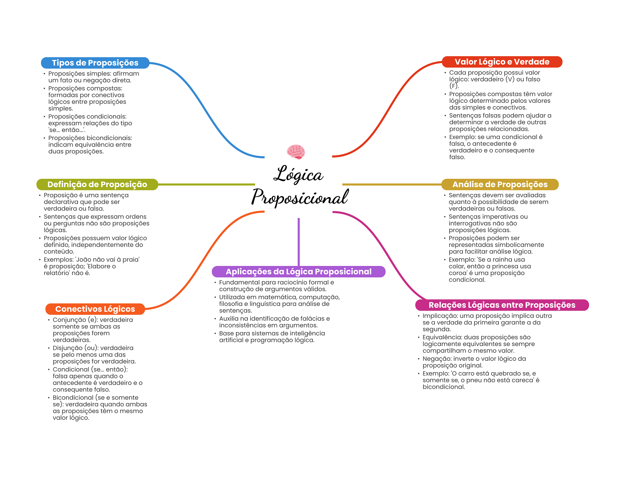 Tipos de Proposições Valor Lógico e Verdade Proposições simples: afirmam Cada proposição possui valor um fato ou negação direta. lógico: verdadeiro (v) ou falso Proposições compostas: (F). formadas por conectivos Proposições compostas têm valor lógicos entre proposições lógico determinado pelos valores simples. das simples e conectivos. Proposições condicionais: Sentenças falsas podem ajudar a expressam relações do tipo determinar a verdade de outras 'se... proposições relacionadas. Proposições bicondicionais: Exemplo: se uma condicional é indicam equivalência entre falsa, O antecedente é duas proposições. verdadeiro e consequente falso. Lógica Definição de Proposição Análise de Proposições Proposição é uma sentença declarativa que pode ser Proposicional Sentenças devem ser avaliadas quanto à possibilidade de serem verdadeira ou falsa. verdadeiras ou falsas. Sentenças que expressam ordens Sentenças imperativas ou ou perguntas não são proposições interrogativas não são lógicas. proposições lógicas. Proposições possuem valor lógico Proposições podem ser definido, independentemente do representadas simbolicamente conteúdo. para facilitar análise lógica. Exemplos: 'João não vai à praia' Exemplo: 'Se a rainha usa é proposição; 'Elabore colar, então a princesa usa não é. Aplicações da Lógica Proposicional coroa' é uma proposição Fundamental para raciocínio formal e condicional. construção de argumentos válidos. Utilizada em matemática, computação, filosofia e linguística para análise de Conectivos Lógicos Relações Lógicas entre Proposições sentenças. Conjunção (e): verdadeira Auxilia na identificação de falácias e Implicação: uma proposição implica outra somente se ambas as inconsistências em argumentos. se a verdade da primeira garante a da segunda. proposições forem Base para sistemas de inteligência verdadeiras. artificial e programação lógica. Equivalência: duas proposições são Disjunção (ou): verdadeira logicamente equivalentes se sempre compartilham mesmo valor. se pelo menos uma das proposições for verdadeira. Negação: inverte valor lógico da Condicional (se... então): proposição original. falsa apenas quando Exemplo: 'O carro está quebrado se, e antecedente é verdadeiro e somente se, pneu não está careca' é consequente falso. bicondicional. Bicondicional (se e somente se): verdadeira quando ambas as proposições têm mesmo valor lógico.