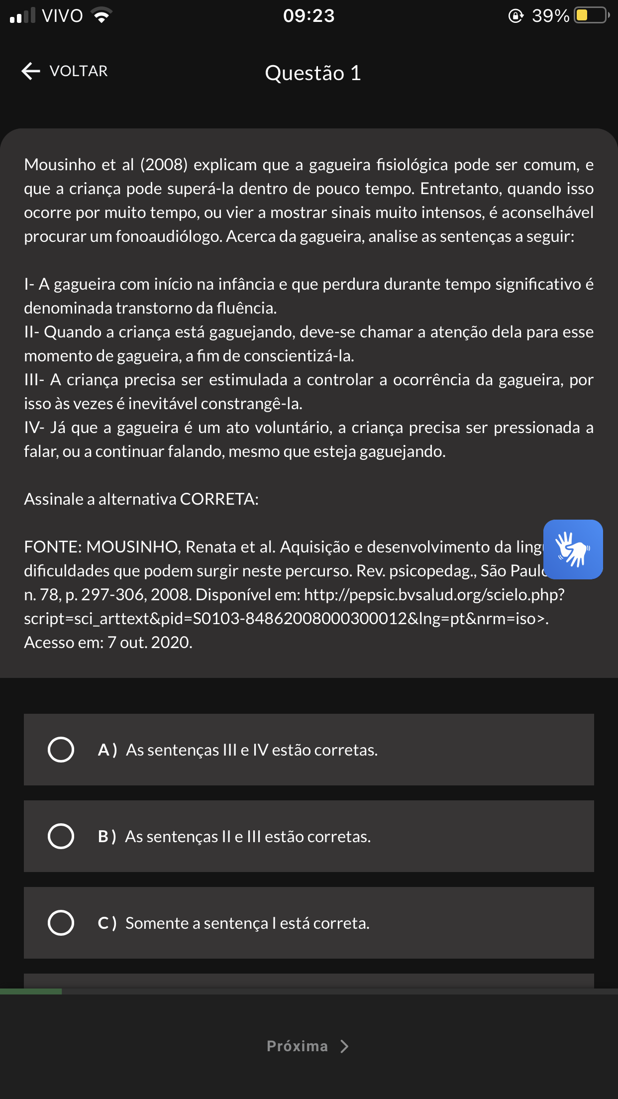 VIVO 09:23 39% VOLTAR Questão 1 Mousinho et al (2008) explicam que a gagueira fisiológica pode ser comum, e que a criança pode superá-la dentro de pouco tempo. Entretanto, quando isso ocorre por muito tempo, ou vier a mostrar sinais muito intensos, é aconselhável procurar um fonoaudiólogo. Acerca da gagueira, analise as sentenças a seguir: I- A gagueira com início na infância e que perdura durante tempo significativo é denominada transtorno da fluência. II- Quando a criança está gaguejando, deve-se chamar a atenção dela para esse momento de gagueira, a fim de conscientizá-la. III- A criança precisa ser estimulada a controlar a ocorrência da gagueira, por isso às vezes é inevitável constrangê-la. IV- Já que a gagueira é um ato voluntário, a criança precisa ser pressionada a falar, ou a continuar falando, mesmo que esteja gaguejando. Assinale a alternativa CORRETA: FONTE: MOUSINHO, Renata et al. Aquisição e desenvolvimento da ling dificuldades que podem surgir neste percurso. Rev. psicopedag., São Paul n. 78, p. 297-306, 2008. Disponível em: http://pepsic.bvsalud.org/scielo.php? script=sci_arttext&pid=S0103-84862008000300012&lng=pt&nrm=iso> Acesso em: 7 out. 2020. A) As sentenças III e IV estão corretas. B) As sentenças e III estão corretas. C) Somente a sentença I está correta. Próxima >