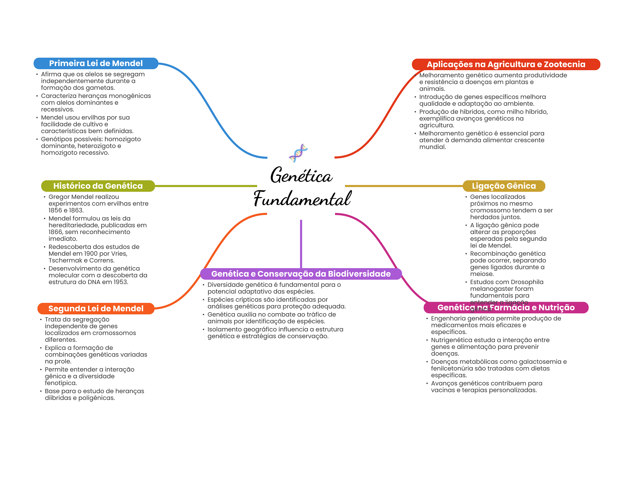 Primeira Lei de Mendel Aplicações na Agricultura e Zootecnia Afirma que alelos se segregam Melhoramento genético aumenta produtividade independentemente durante a e resistência a doenças em plantas e formação dos gametas. animais. Caracteriza heranças monogênicas Introdução de genes específicos melhora com alelos dominantes e qualidade e adaptação ao ambiente. recessivos. Produção de híbridos, como milho híbrido, Mendel usou ervilhas por sua exemplifica avanços genéticos na facilidade de cultivo e agricultura. características bem definidas. Melhoramento genético é essencial para Genótipos possíveis: homozigoto atender à demanda alimentar crescente dominante, heterozigoto e mundial. homozigoto recessivo. Genética Histórico da Genética Ligação Gênica Gregor Mendel realizou experimentos com ervilhas entre Fundamental Genes localizados próximos no mesmo 1856 e 1863. cromossomo tendem a ser Mendel formulou as leis da herdados juntos. hereditariedade, publicadas em A ligação gênica pode 1866, sem reconhecimento alterar as proporções imediato. esperadas pela segunda Redescoberta dos estudos de lei de Mendel. Mendel em 1900 por Vries, Recombinação genética Tschermak e Correns. pode ocorrer, separando Desenvolvimento da genética genes ligados durante a molecular com a descoberta da Genética e Conservação da Biodiversidade meiose. estrutura do DNA em 1953. Diversidade genética é fundamental para Estudos com Drosophila potencial adaptativo das espécies. melanogaster foram fundamentais para Espécies crípticas são identificadas por ligação Segunda Lei de Mendel análises genéticas para proteção adequada. Genética na Farmácia e Nutrição Genética auxilia no combate ao tráfico de Trata da segregação animais por identificação de espécies. Engenharia permite produção de independente de genes medicamentos mais eficazes e localizados em cromossomos Isolamento geográfico influencia a estrutura específicos. diferentes. genética e estratégias de conservação. Nutrigenética estuda a interação entre Explica a formação de genes e alimentação para prevenir combinações genéticas variadas doenças. na prole. Doenças metabólicas como galactosemia e Permite entender a interação fenilcetonúria são tratadas com dietas gênica e a diversidade específicas. fenotípica. Avanços genéticos contribuem para Base para estudo de heranças vacinas e terapias personalizadas. diíbridas e poligênicas.
