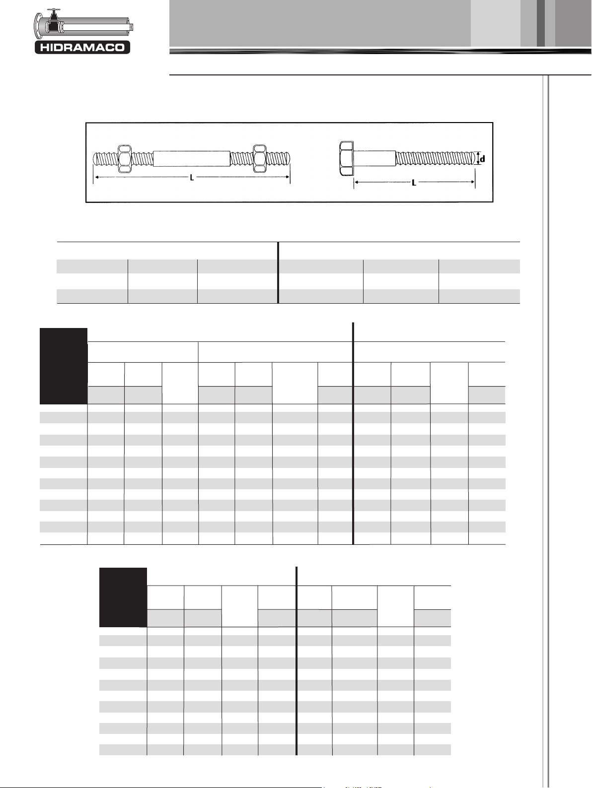 pol pol Kg pol pol Kg 75 5/8 1 3/4 8 1,2 5/8 1 3/4 8 1,2 100 5/8 1 3/4 16 2,4 5/8 1 3/4 16 2,4 150 3/4 2 16 3,9 3/4 2 16 3,9 200 3/4 2 16 3,9 250 3/4 2 1/4 24 6,6 300 3/4 2 1/4 24 6,6 350 3/4 2 1/4 32 8,8 400 7/8 3 32 12,5 450 7/8 3 40 15,6 500 7/8 3 40 15,6 600 1 3 1/2 40 19,5 pol mm pol pol Kg pol mm Kg 50 5/8 180 4 1,6 5/8 180 4 1,6 75 5/8 180 4 1,6 5/8 180 4 1,6 100 5/8 180 8 3,2 5/8 180 8 3,2 150 3/4 225 8 5,5 3/4 225 8 5,5 200 3/4 225 8 5,5 250 3/4 225 12 8,2 300 3/4 225 12 8,2 350 3/4 225 12 3/4 2 1/4 8 9,7 400 7/8 270 12 7/8 2 1/4 8 15,1 450 7/8 270 16 7/8 2 1/4 8 19,6 500 7/8 270 16 7/8 2 1/4 8 19,6 600 1 305 16 1 3 8 29,5 Tirantes e Parafusos para Válvulas Wafer e Lug Montagem entre Flanges NBR 7675 e/ou ISO 2531 Dimensões e Massas DN PN Referência DN PN Referência 50-150 16 TPBL16 50-150 16 TPBW16 Tirantes Parafusos para Wafer Parafusos para Lug Tabela de Referências L Diâmetro Nominal DN Para Flanges PN 10 Qtde d Massa Total Para Flanges PN 16 Tirantes e Parafusos para Válvulas Wafer d Qtde d Ld Qtde Massa Total Tirantes com Porca Parafusos sem Porca Tirante com Porca L Diâmetro Nominal DN Para Flanges PN 10 Qtde Massa Total Para Flanges PN 16 d d Massa Total Parafusos sem Porca para Válvulas Lug L Qtde BORBOLETAS VÁLVULAS