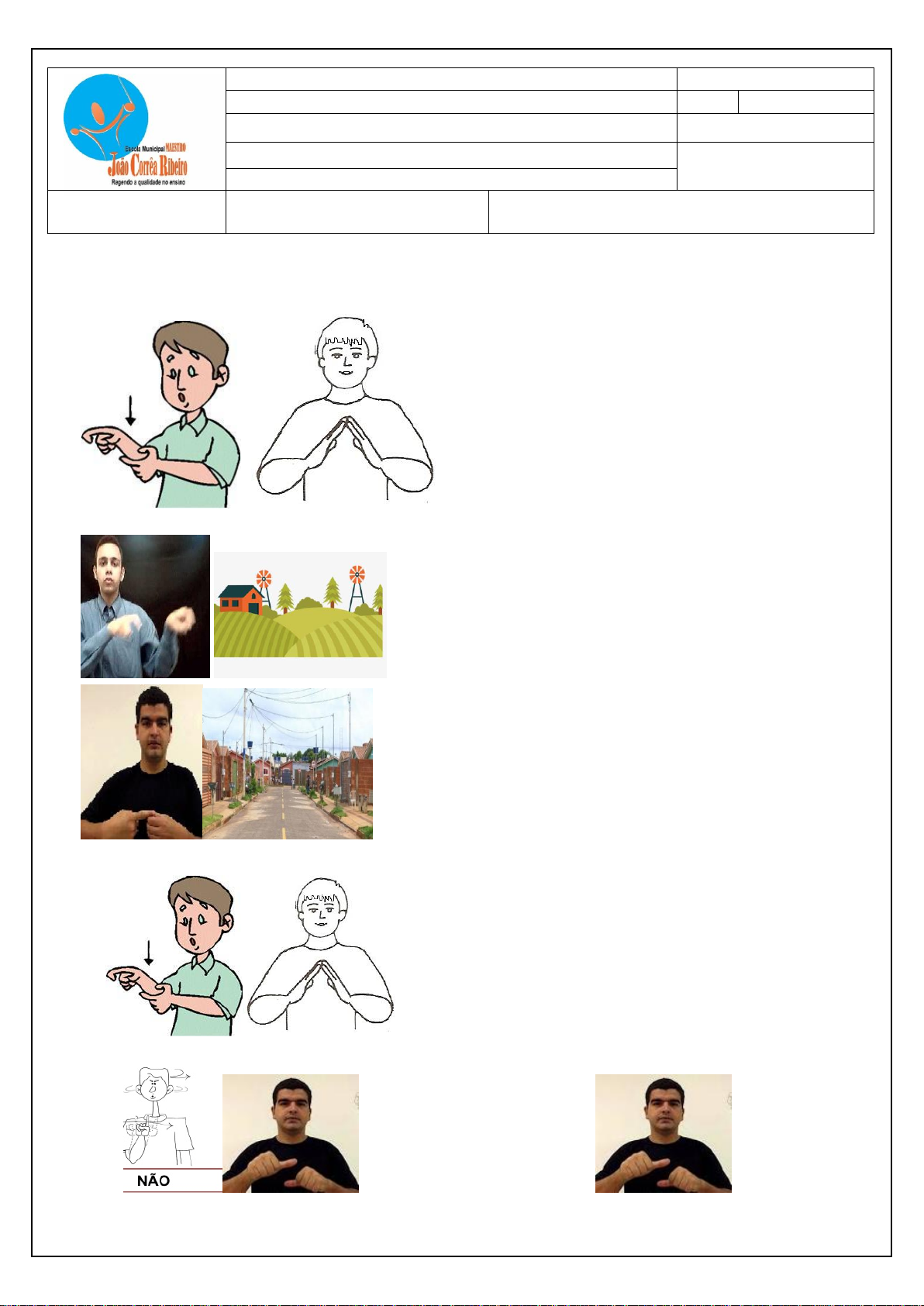 1. ( ) ( ) 2. ( ) ( ) Escola Municipal Maestro João Correa Ribeiro BIMESTRE Componente Curricular: GEOGRAFIA 1 9ºA Professor(a):Letícia Ano/Turma: 9 A Assinatura do Professor(a): Professor(a) Intérprete: Adriana de Lima G. Mota Data___/_____/2020 Aluno (a): Karolina Grazielly do N. Jesus Instruções: Ativ. Adaptada Conteúdo: Conceito de cidade e campo (localização) Objetivo: Diferenciar cidade de campo. compreender área local 3. ASSOCIE AS PAISAGENS ABAIXO AO SINAL CORRESPONDENTE EM LIBRAS. 4. . ( ) ( ) 5. OBSERVE A SEQUÊNCIA DE QUADRINHOS A SEGUIR. GADO NO PASTO TRANSFORMAÇÃO DO PRODUTO NA INDÚSTRIA RETIRADA DO LEITE DA VACA PRODUTO PRONTO PARA O CONSUMO AGORA, RESPONDA. A) QUAL FOI A MATÉRIA-PRIMA UTILIZADA PARA FABRICAR A MANTEIGA? ( ) ( ) ( ) B) ESSA MATÉRIA-PRIMA É PRODUZIDA NO CAMPO OU NA CIDADE? 6. OBSERVE AS IMAGENS ABAIXO, AS PAISAGENS NÃO PERMANECEM IGUAIS. OS ELEMENTOS QUE AS FORMAM MUDAM NO DECORRER DO TEMPO? COM BASE NAS IMAGENS, RESOLVA AS QUESTÕES A SEGUIR. ( ) ( ) 1 2 7. OBSERVE A OBRA DE ARTE TOURO, DE TARSILA DO AMARAL. QUAL PAISAGEM É RETRATADA NESTA OBRA DE ARTE? TARSILA DO AMARAL. PAISAGEM COM TOURO,1925.