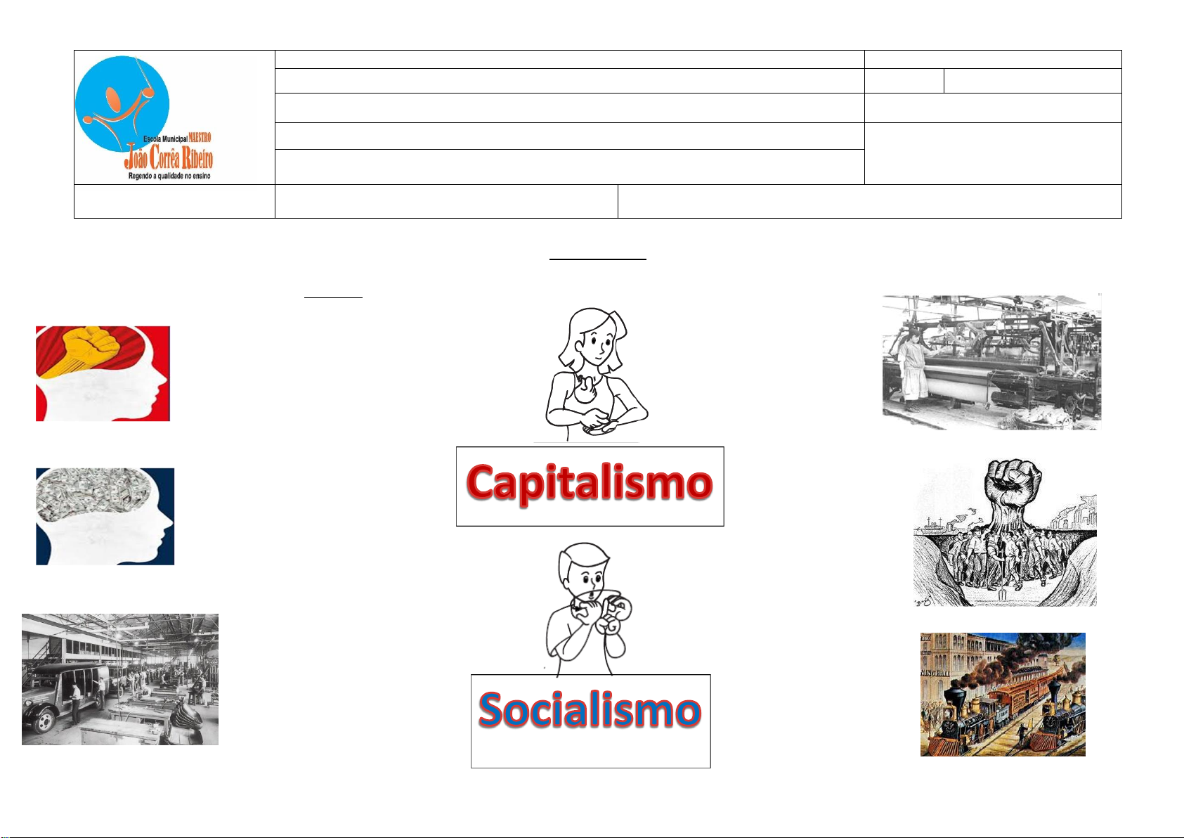 Escola Municipal Maestro João Correa Ribeiro BIMESTRE Componente Curricular: GEOGRAFIA 1 9ºA Professor(a):Letícia Ano/Turma: 9 A Assinatura do Professor(a): Professor(a) Intérprete: Adriana de Lima G. Mota Data___/_____/2020 Aluno (a): Karolina Grazielly do N. Jesus Instruções: Ativ.Adaptada Conteúdo: SOCIALISMO E CAPITALISMO Objetivo: DIFERENCIAR CAPITALISMO DE SOCIALISMO GEOGRAFIA 1. Analise as imagens abaixo e ligue-as de acordo com seu significado, se corresponde ao capitalismo ou socialismo: (Pensar na força da união) (Indústria de tecidos) (pensar no dinheiro) (Força do Povo unido) (Indústria) (Transporte férreo de mercadorias)