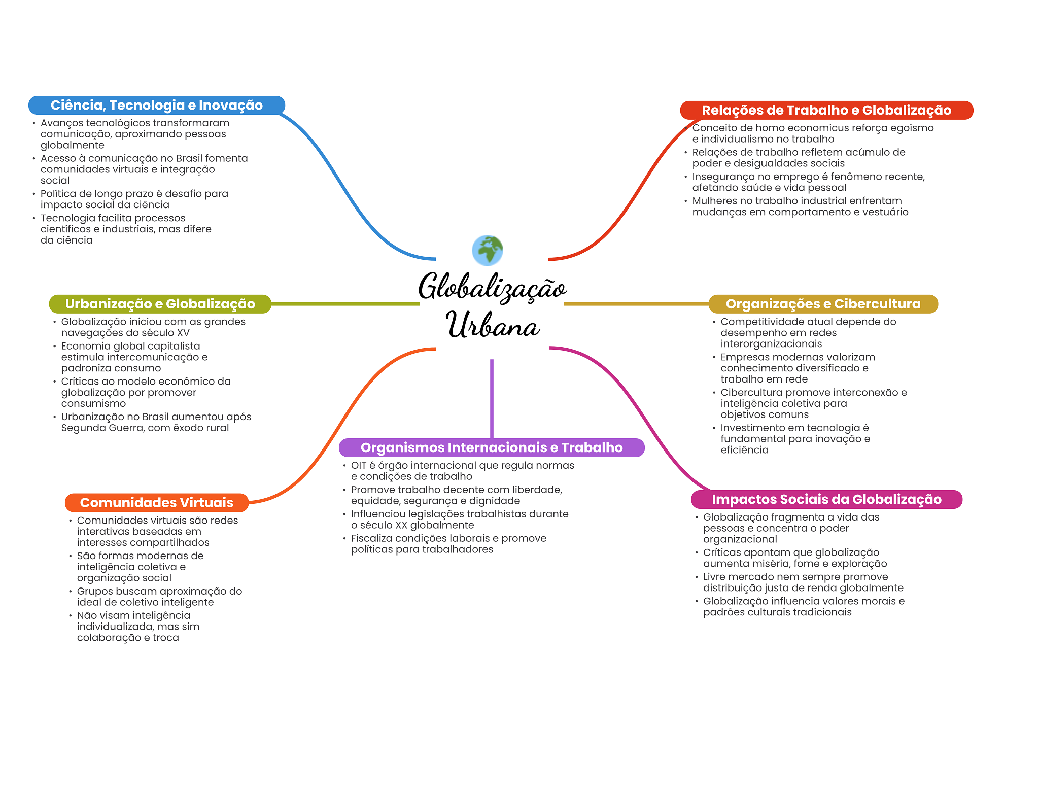 Ciência, Tecnologia e Inovação Relações de Trabalho e Globalização Avanços tecnológicos transformaram comunicação, aproximando pessoas Conceito de homo economicus reforça egoísmo e individualismo no trabalho globalmente Acesso à comunicação no Brasil fomenta Relações de trabalho refletem acúmulo de poder e desigualdades sociais comunidades virtuais e integração social Insegurança no emprego é fenômeno recente, afetando saúde e vida pessoal Política de longo prazo é desafio para impacto social da ciência Mulheres no trabalho industrial enfrentam Tecnologia facilita processos mudanças em comportamento e vestuário científicos e industriais, mas difere da ciência Globalização Urbanização e Globalização Organizações e Cibercultura Globalização iniciou com as grandes Urbana Competitividade atual depende do navegações do século XV desempenho em redes Economia global capitalista interorganizacionais estimula intercomunicação e Empresas modernas valorizam padroniza consumo conhecimento diversificado e Críticas ao modelo econômico da trabalho em rede globalização por promover Cibercultura promove interconexão e consumismo inteligência coletiva para Urbanização no Brasil aumentou após objetivos comuns Segunda Guerra, com êxodo rural Investimento em tecnologia é fundamental para inovação e Organismos Internacionais e Trabalho eficiência OIT é órgão internacional que regula normas e condições de trabalho Promove trabalho decente com liberdade, Comunidades Virtuais equidade, segurança e dignidade Impactos Sociais da Globalização Comunidades virtuais são redes Influenciou legislações trabalhistas durante Globalização fragmenta a vida das século XX globalmente interativas baseadas em pessoas e concentra poder interesses compartilhados Fiscaliza condições laborais e promove organizacional São formas modernas de políticas para trabalhadores Críticas apontam que globalização inteligência coletiva e aumenta miséria, fome e exploração organização social Livre mercado nem sempre promove Grupos buscam aproximação do distribuição justa de renda globalmente ideal de coletivo inteligente Globalização influencia valores morais e Não visam inteligência padrões culturais tradicionais individualizada, mas sim colaboração e troca