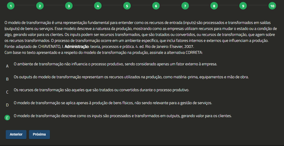 1 2 3 4 5 6 7 8 9 10 0 modelo de transformação é uma representação fundamental para entender como recursos de entrada (inputs) são processados e transformados em saídas (outputs) de bens ou serviços. Esse modelo descreve a natureza da produção, mostrando como as empresas utilizam recursos para mudar estado ou a condição de algo, gerando valor para clientes. Os inputs podem ser recursos transformados, que são tratados ou convertidos, ou recursos de transformação, que agem sobre recursos transformados. 0 processo de transformação ocorre em um ambiente específico, que inclui fatores internos e externos que influenciam a produção. Fonte: adaptado de: CHIAVENATO, Administração: teoria, processos e prática. 4. ed. Rio de Janeiro: Elsevier, 2007. Com base no texto apresentado e a respeito do modelo de transformação na produção, assinale a alternativa CORRETA: A 0 ambiente de transformação não influencia 0 processo produtivo, sendo considerado apenas um fator externo à empresa. Os outputs do modelo de transformação representam recursos utilizados na produção, como matéria-prima, equipamentos e mão de obra. Os recursos de transformação são aqueles que são tratados ou convertidos durante 0 processo produtivo. D 0 modelo de transformação se aplica apenas à produção de bens físicos, não sendo relevante para a gestão de serviços. E 0 modelo de transformação descreve como inputs são processados e transformados em outputs, gerando valor para clientes. Anterior Próxima