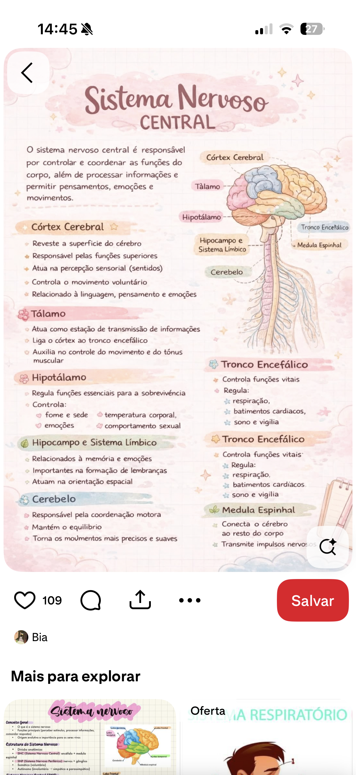 14:45 27 Sistema Nervoso CENTRAL sistema nervoso central é Córtex Cerebral por controlar e coordenar as funções do corpo, além de processar informações e permitir pensamentos, emoções e Tàlamo movimentos. Hipotálamo Córtex Cerebral Tronco Reveste a superficie do cérebro Hipocampo e Medula Espinhal Sistema Límbico Responsável pelas funções superiores Atua na percepção sensorial (sentidos) Cerebelo Controla o movimento voluntário Relacionado à linguagem, pensamento e emoções Tálamo Atua como estação de transmissão de informações Liga córtex ao tronco encefálico Auxilia no controle do movimento e do tónus muscular Tronco Encefálico Hipotálamo Controla funções vitais Regula funções essenciais para a sobrevivéncia Regula: Controla: respiração, fome e sede batimentos cardiacos, temperatura corporal, emoções comportamento sexual sono e vigilia Hipocampo e Sistema Límbico Tronco Encefálico Relacionados à memória e emoções Controla funções vitais Regula: Importantes na formação de lembranças respiração, Atuam na orientação espacial batimentos Cerebelo sono e vigilia Responsável pela coordenação motora Medula Espinhal Mantém equilibrio Conecta cérebro ao resto do corpo Torna os mais precisos e suaves Transmite impulsos 109 Salvar Bia Mais para explorar Sistema nervoso Oferta RESPIRATÓRIO Conceito Geral que sistema nervoso principais (perceber processor Origem evolutiva importância para os seres vivos estrutura do Sistema Nervoso Divisão SNC (Sistema Nervoso encéfalo medula espinhal SNP (Sistema Nervoso gânglios 1 Somático (voluntário) Autônomo (involuntário simpático parassimpático)