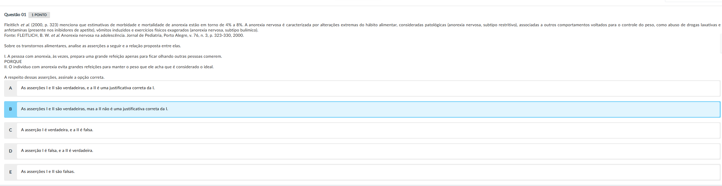 Questão 01 PONTO Fleitlich et al. (2000, 323) menciona que estimativas de morbidade e mortalidade de anorexia estão em torno de 4% a 8%. A anorexia nervosa é caracterizada por alterações extremas do hábito alimentar, consideradas patológicas (anorexia nervosa, subtipo restritivo), associadas a outros comportamentos voltados para controle do peso, como abuso de drogas laxativas e anfetaminas (presente nos inibidores de apetite), vômitos induzidos e exercícios físicos exagerados (anorexia nervosa, subtipo bulímico). Fonte: FLEITLICH, B. W. et al. Anorexia nervosa na adolescência. Jornal de Pediatria, Porto Alegre, 76, n. 3, p. 323-330, 2000. Sobre os transtornos alimentares, analise as asserções a seguir e a relação proposta entre elas. I.A pessoa com anorexia, às vezes, prepara uma grande refeição apenas para ficar olhando outras pessoas comerem. PORQUE II. indivíduo com anorexia evita grandes refeições para manter peso que ele acha que é considerado 0 ideal. A respeito dessas asserções, assinale a opção correta. A As asserções II são verdadeiras, e a é uma justificativa correta da I. As asserções le II são verdadeiras, mas a II não é uma justificativa correta da I. A asserção verdadeira, e a II é falsa. D A asserção falsa, e a II é verdadeira. E As asserções II são falsas.