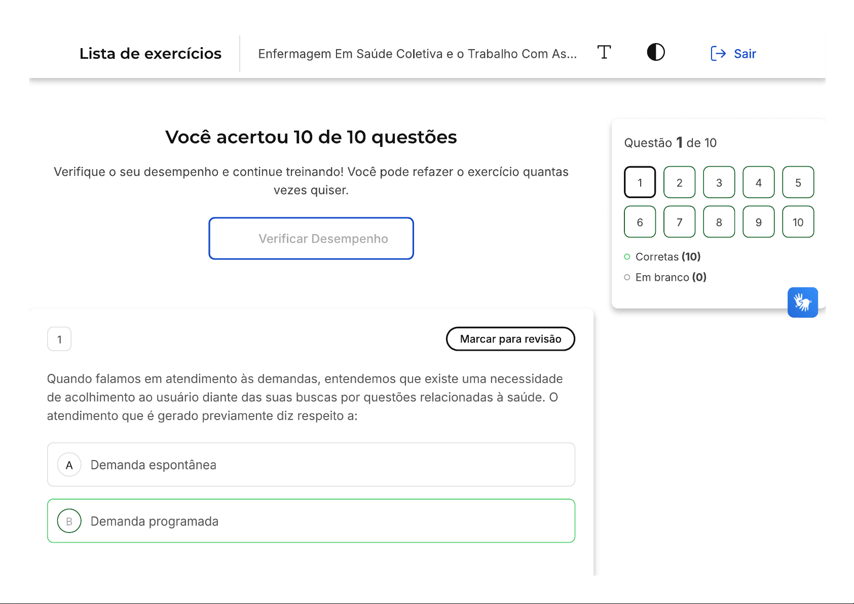 Lista de exercícios Enfermagem Em Saúde Coletiva e Trabalho Com As... T Sair Você acertou 10 de 10 questões Questão 1 de 10 Verifique seu desempenho e continue treinando! Você pode refazer exercício quantas 1 2 3 4 5 vezes quiser. 6 7 8 9 10 Verificar Desempenho Corretas (10) Em branco 1 Marcar para revisão Quando falamos em atendimento às demandas, entendemos que existe uma necessidade de acolhimento ao usuário diante das suas buscas por questões relacionadas à saúde. atendimento que é gerado previamente diz respeito a: A Demanda espontânea Demanda programadac Acolhimento D Triagem E Atividade educativa Resposta correta Parabéns, você selecionou a alternativa correta. Confira gabarito comentado! Gabarito Comentado A alternativa correta é a "Demanda programada". Este termo se refere ao tipo de atendimento que é agendado com antecedência, permitindo que indivíduo organize suas ações de saúde. Dessa forma, as consultas e demais procedimentos são programados previamente, proporcionando um melhor planejamento tanto para profissional de saúde quanto para paciente. 2 Marcar para revisão As demandas espontâneas e programadas na APS são um desafio para as equipes. Sem organização e planejamento não é possível proporcionar um atendimento de qualidade. AAtenção Básica trabalha com equipes definidas e a realização do acolhimento é importante, pois: A Torna os atendimentos às demandas menos resolutivos Diminui os problemas de saúde c Impede a criação de planos de cuidado D Fortalece a criação de vínculo E Promove a desorganização dos serviços Resposta correta Parabéns, você selecionou a alternativa correta. Confira gabarito comentado! Gabarito Comentado acolhimento é uma prática essencial na Atenção Básica à Saúde (APS), que deve ser realizado por todos os profissionais da APS. Uma escuta qualificada irá facilitar a resolução dos problemas de saúde do usuário. acolhimento fortalece a confiança na equipe e promove a criação de um vínculo entre o profissional de saúde e paciente.Tal vínculo é fundamental para a efetividade do tratamento e para a satisfação do paciente com serviço de saúde. 3 Marcar para revisão A gerência do cuidado é uma atividade que possibilita a longitudinalidade das ações. Marque a opção que indica profissional responsável pela qualificação integral dessas ações. A Enfermeiro Agente comunitário de saúde c Técnico de enfermagem D Médico E PsicólogoResposta correta Parabéns, você selecionou a alternativa correta. Confira gabarito comentado! Gabarito Comentado enfermeiro é profissional que assume a liderança das equipes e coordena processo assistencial dos usuários em sua área de abrangência. Ele é responsável pela gestão do cuidado, que envolve a execução planejada de atividades assistenciais e gerenciais. Isso possibilita um atendimento contínuo ao usuário, conhecido também como cuidado longitudinal. Esse cuidado longitudinal permite a continuidade de ações que promovem a qualidade de vida do indivíduo. Portanto, o enfermeiro é profissional responsável pela qualificação integral das ações que possibilitam a longitudinalidade do cuidado. 4 Marcar para revisão A atenção básica considera sujeito em sua singularidade e inserção sociocultural na busca pela atenção integral. Assinale a alternativa que indica os princípios da atenção básica.A Acessibilidade e continuidade do cuidado Atenção restrita e equidade c Participação social e singularidade D Universalidade e ações programáticas E Integralidade e desvinculação Resposta correta Parabéns, você selecionou a alternativa correta. Confira gabarito comentado! Gabarito Comentado A atenção básica é desenvolvida com objetivo de descentralização e capilaridade, buscando estar mais próxima da vida das pessoas. Ela é considerada o contato prioritário dos usuários, sendo a porta de entrada preferencial e o centro de comunicação da Rede de Atenção à Saúde. A atenção básica se organiza pelos princípios e diretrizes da universalidade, da acessibilidade, do vínculo, da continuidade do cuidado, da integralidade da atenção, da responsabilização, da humanização, da equidade e da participação social. Portanto, a alternativa que melhor representa osprincípios da atenção básica é a "Acessibilidade e continuidade do cuidado", pois esses são dois dos principais princípios que norteiam a atenção básica na saúde. 5 Marcar para revisão Sobre as atribuições de todos os profissionais da Atenção Primária, julgue as afirmativas abaixo e marque a alternativa correta: I. Participar do processo de territorialização e mapeamento da área de atuação da equipe, identificando grupos, famílias e indivíduos expostos a riscos e vulnerabilidades; II. Realizar outras ações e atividades a serem definidas de acordo com as prioridades locais; III. Manter registro das atividades nos sistemas de informação da Atenção Básica intactos e desatualizados, aguardando normativa vigente; IV. Realizar ações de atenção à saúde conforme a necessidade de saúde da população local, bem como a prevista nas prioridades e protocolos de gestão local; V. Cumprir com as atribuições atualmente definidas para os ACS em relação à prevenção e ao controle da malária e da dengue. A I, II, IV I, II, Vc II, IV, V D I, III, IV E Resposta correta Parabéns, você selecionou a alternativa correta. Confira gabarito comentado! Gabarito Comentado Conforme a Política Nacional de Atenção Básica (PNAB) de 2017, as diferentes ações são desenvolvidas pelos membros da estratégia de Saúde da Família, podendo estas serem realizadas por todos os profissionais ou serem específicas para cada categoria. Contrariando que é afirmado na alternativa III, é essencial alimentar e garantir a qualidade do registro das atividades nos sistemas de informação da Atenção Básica, conforme a normativa vigente.
