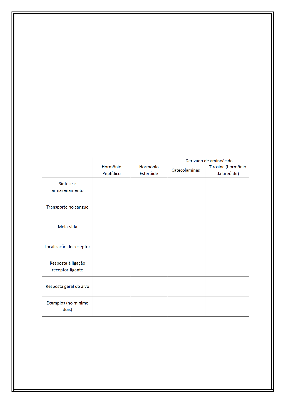 Curso de Medicina Disciplina: Fisiologia Humana (Morfo IV) Docente: Ana Paula Amaral Atividade de Introdução a Endocrinologia 1. Defina o que é um hormônio? Quais são as funções desempenhadas por eles? 2. Existem várias modalidades de ação hormonal. Então defina e represente esquematicamente os mecanismos de sinalização: autócrina, parácrina, endócrina, e neuroendócrina. 3. Os hormônios circulam pelo sangue ou pelos líquidos intersticiais, porém seus efeitos se manifestam em apenas alguns grupos de células. Portanto, defina: a) célula-alvo. b) receptor: natureza química, localização e função 4. Como circulam os hormônios? Qual a importância das proteínas plasmáticas neste processo? 5. O que é meia vida plasmática de um hormônio? 6. Complete a tabela abaixo para as diferentes classes de hormônios: 7. Quais são as formas de regulação endócrina existente? Caracterize-as. image1.emf