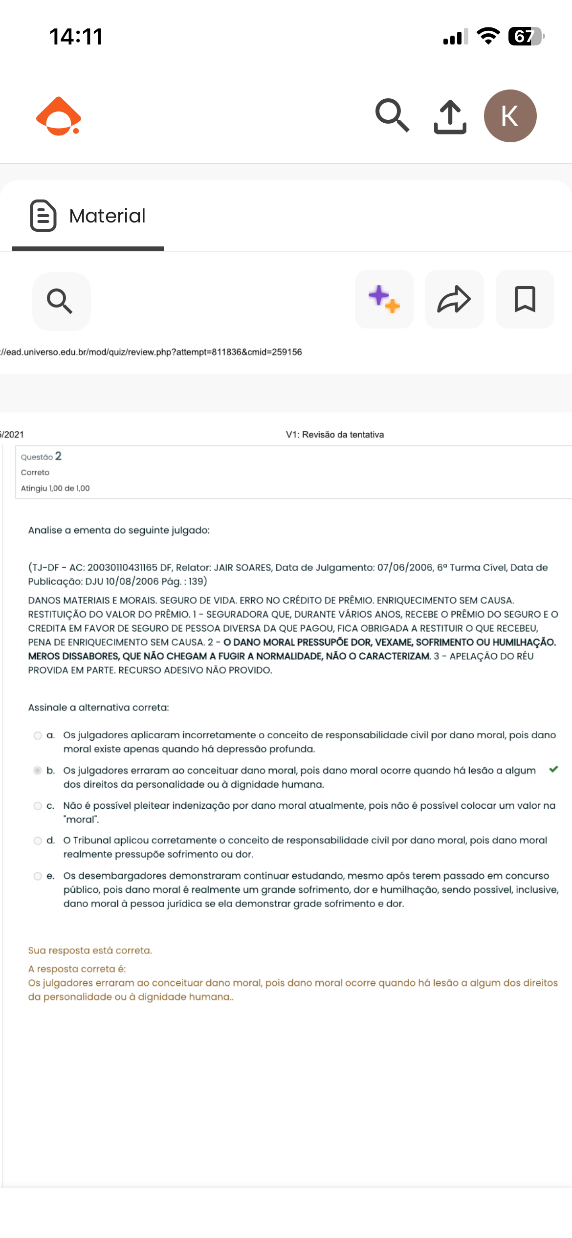 14:11 67 Material //ead.universo.edu.br/mod/quiz/review.php?attempt=811836&cmid=259156 /2021 V1: Revisão da tentativa Questão 2 Correto Atingiu 1,00 de 1,00 Analise a ementa do seguinte julgado: (TJ-DF AC: 20030110431165 DF, Relator: JAIR SOARES, Data de Julgamento: 07/06/2006, Turma Cível, Data de Publicação: DJU 10/08/2006 Pág. 139) DANOS MATERIAIS E MORAIS. SEGURO DE VIDA. ERRO NO CRÉDITO DE PRÊMIO. ENRIQUECIMENTO SEM CAUSA. RESTITUIÇÃO DO VALOR DO PRÊMIO. 1 SEGURADORA QUE, DURANTE VÁRIOS ANOS, RECEBE PRÊMIO DO SEGURO E CREDITA EM FAVOR DE SEGURO DE PESSOA DIVERSA DA QUE PAGOU, FICA OBRIGADA A RESTITUIR QUE RECEBEU, PENA DE ENRIQUECIMENTO SEM CAUSA. 2 o DANO MORAL PRESSUPÕE DOR, VEXAME, SOFRIMENTO OU HUMILHAÇÃO. MEROS DISSABORES, QUE NÃO CHEGAM A FUGIR A NORMALIDADE, NÃO o CARACTERIZAM. 3 APELAÇÃO DO RÉU PROVIDA EM PARTE. RECURSO ADESIVO NÃO PROVIDO. Assinale a alternativa correta: a. Os julgadores aplicaram incorretamente conceito de responsabilidade civil por dano moral, pois dano moral existe apenas quando há depressão profunda. b. Os julgadores erraram ao conceituar dano moral, pois dano moral ocorre quando há lesão a algum dos direitos da personalidade ou à dignidade humana. C. Não é possível pleitear indenização por dano moral atualmente, pois não é possível colocar um valor na "moral". d. Tribunal aplicou corretamente conceito de responsabilidade civil por dano moral, pois dano moral realmente pressupõe sofrimento ou dor. e. Os desembargadores demonstraram continuar estudando, mesmo após terem passado em concurso público, pois dano moral é realmente um grande sofrimento, dor e humilhação, sendo possível, inclusive, dano moral à pessoa jurídica se ela demonstrar grade sofrimento e dor. Sua resposta está correta. A resposta correta é: Os julgadores erraram ao conceituar dano moral, pois dano moral ocorre quando há lesão a algum dos direitos da personalidade ou à dignidade