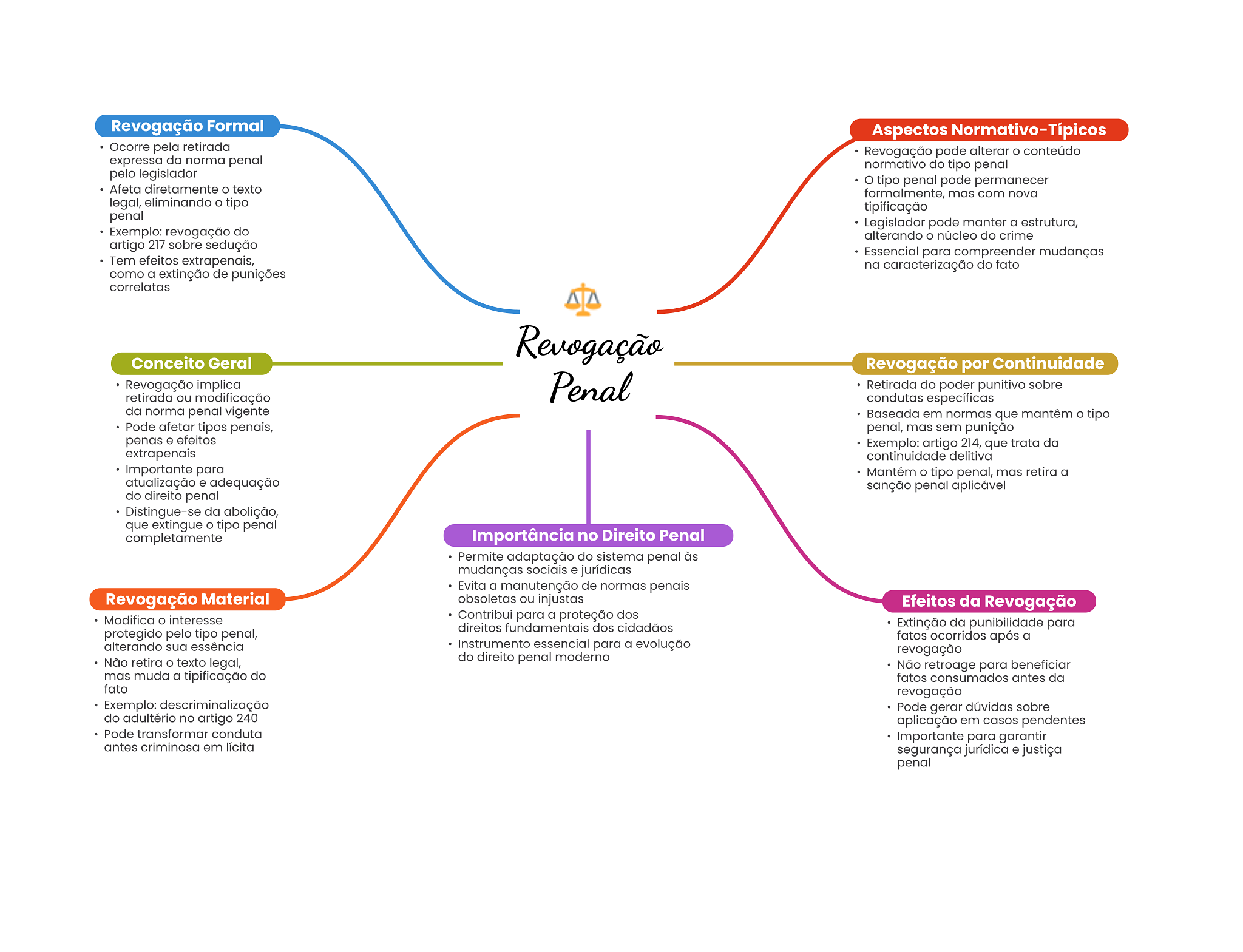 Revogação Formal Aspectos Normativo-Típicos Ocorre pela retirada Revogação pode alterar O conteúdo expressa da norma penal normativo do tipo penal pelo legislador O tipo penal pode permanecer Afeta diretamente texto formalmente, mas com nova legal, eliminando tipo tipificação penal Legislador pode manter a estrutura, Exemplo: revogação do alterando núcleo do crime artigo 217 sobre sedução Essencial para compreender mudanças Tem efeitos extrapenais, na do fato como a extinção de punições correlatas Revogação Conceito Geral Revogação por Continuidade Revogação implica Penal Retirada do poder punitivo sobre retirada ou modificação condutas específicas da norma penal vigente Baseada em normas que mantêm tipo Pode afetar tipos penais, penal, mas sem punição penas e efeitos Exemplo: artigo 214, que trata da extrapenais continuidade delitiva Importante para Mantém tipo penal, mas retira a atualização e adequação sanção penal aplicável do direito penal Distingue-se da abolição, que extingue O tipo penal completamente Importância no Direito Penal Permite adaptação do sistema penal às mudanças sociais e jurídicas Evita a manutenção de normas penais Revogação Material obsoletas ou injustas Efeitos da Revogação Modifica interesse Contribui para a proteção dos direitos fundamentais dos cidadãos Extinção da punibilidade para protegido pelo tipo penal, fatos ocorridos após a alterando essência Instrumento essencial para a evolução revogação Não retira texto legal, do direito penal moderno Não retroage para beneficiar mas muda a tipificação do fatos consumados antes da fato revogação Exemplo: descriminalização Pode gerar dúvidas sobre do adultério no artigo 240 aplicação em casos pendentes Pode transformar conduta Importante para garantir antes criminosa em segurança jurídica e justiça penal