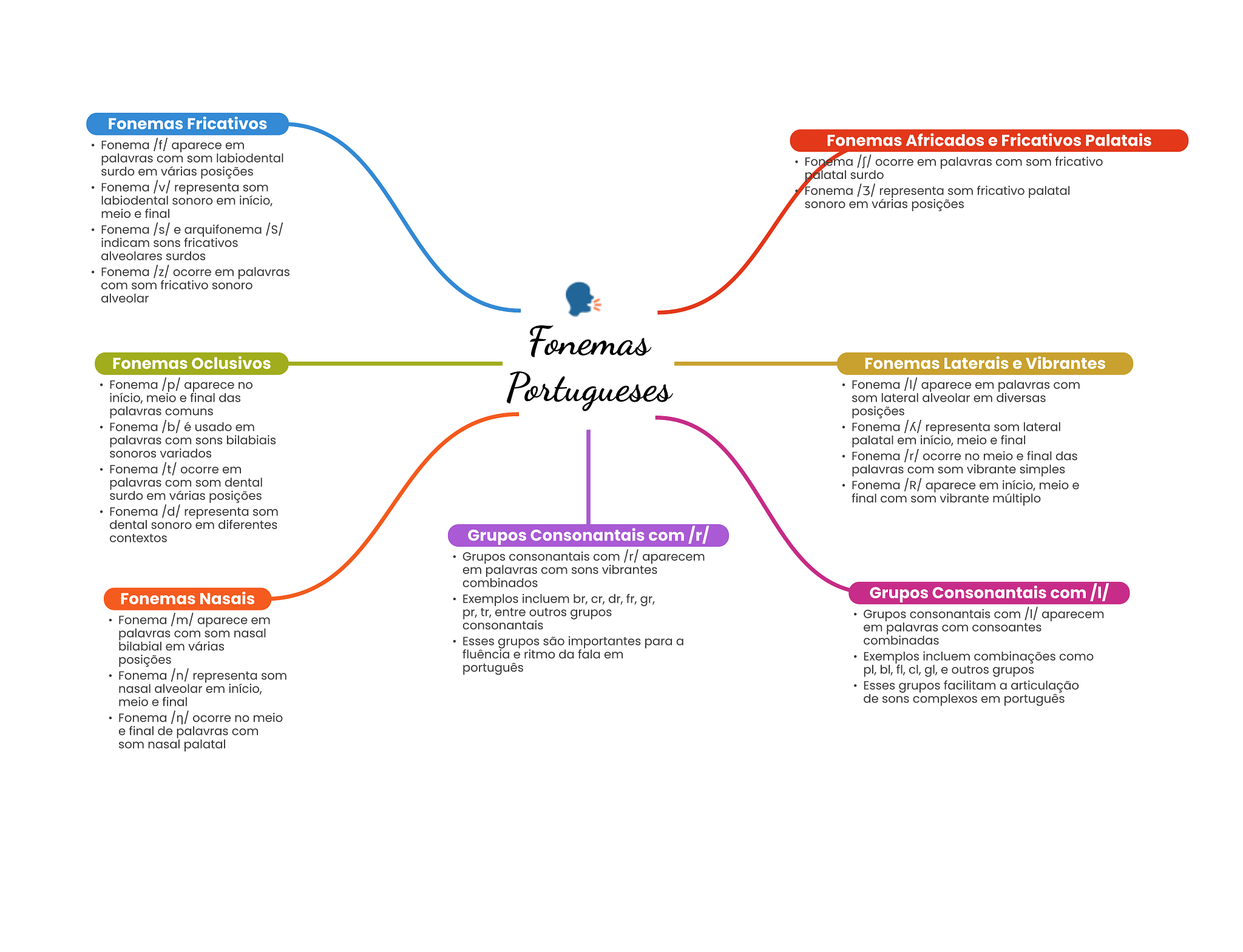 Fonemas Fricativos Fonema /f/ aparece em Fonemas Africados e Fricativos Palatais palavras com som labiodental Fonema ocorre em palavras com som fricativo surdo em várias posições palatal surdo Fonema /v/ representa som Fonema /3/ representa som fricativo palatal labiodental sonoro em início, sonoro em várias posições meio e final Fonema /s/ e arquifonema /s/ indicam sons fricativos alveolares surdos Fonema /z/ ocorre em palavras com som fricativo sonoro alveolar Fonemas Fonemas Oclusivos Fonemas Laterais e Vibrantes Fonema /p/ aparece no Portugueses Fonema aparece em palavras com início, meio e final das som lateral alveolar em diversas palavras comuns posições Fonema /b/ é usado em Fonema representa som lateral palavras com sons bilabiais palatal em início, meio e final sonoros variados Fonema /r/ ocorre no meio e final das Fonema /t/ ocorre em palavras com som vibrante simples palavras com som dental Fonema /R/ aparece em início, meio e surdo em várias posições final com som vibrante múltiplo Fonema /d/ representa som dental sonoro em diferentes contextos Grupos Consonantais com /r/ Grupos consonantais com /r/ aparecem em palavras com sons vibrantes combinados Fonemas Nasais Exemplos incluem br, cr, dr, fr, gr, Grupos Consonantais com Fonema /m/ aparece em pr, tr, entre outros grupos Grupos consonantais com aparecem consonantais palavras com som nasal em palavras com consoantes bilabial em várias Esses grupos são importantes para a combinadas fluência e ritmo da fala em posições Exemplos incluem combinações como Fonema /n/ representa som português pl, bl, fl, cl, gl, e outros grupos nasal alveolar em início, Esses grupos facilitam a articulação meio e final de sons complexos em português Fonema /n/ ocorre no meio e final de palavras com som nasal palatal