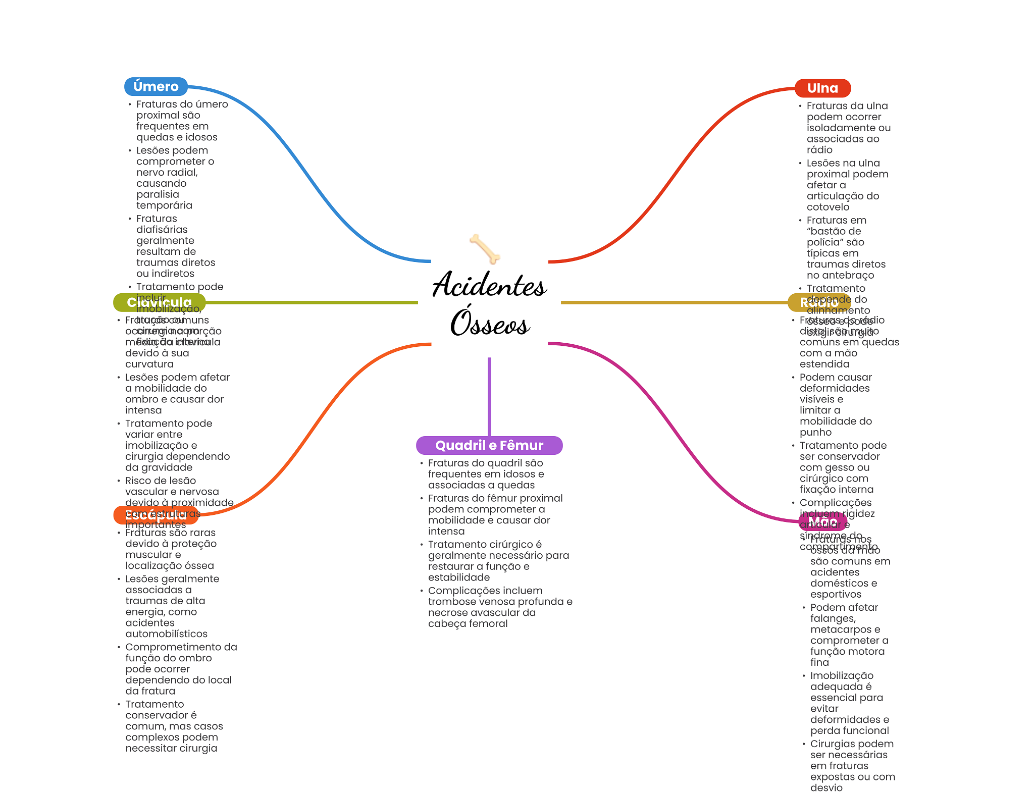 Úmero Ulna Fraturas do úmero Fraturas da ulna proximal são podem ocorrer frequentes em isoladamente ou quedas e idosos associadas ao Lesões podem rádio comprometer Lesões na ulna nervo radial, proximal podem causando afetar a paralisia articulação do temporária cotovelo Fraturas Fraturas em diafisárias "bastão de geralmente polícia" são resultam de típicas em traumas diretos traumas diretos ou indiretos Acidentes no antebraço Tratamento pode Tratamento Clavicula do Ósseos alinhamento comuns em quedas devido à sua com a mão curvatura estendida Lesões podem afetar Podem causar a mobilidade do deformidades ombro e causar dor visíveis e intensa limitar a Tratamento pode mobilidade do variar entre punho imobilização e Quadril e Fêmur Tratamento pode cirurgia dependendo ser conservador da gravidade Fraturas do quadril são com gesso ou frequentes em idosos e Risco de lesão cirúrgico com associadas a quedas vascular e nervosa fixação interna devido à proximidade Fraturas do fêmur proximal Complicações podem comprometer a importantes mobilidade e causar dor Mão rigidez Fraturas são raras intensa síndrome devido à proteção Tratamento cirúrgico é ento mão muscular e geralmente necessário para localização óssea são comuns em restaurar a função e acidentes Lesões geralmente estabilidade domésticos e associadas a Complicações incluem esportivos traumas de alta trombose venosa profunda e Podem afetar energia, como necrose avascular da acidentes cabeça femoral falanges, automobilísticos metacarpos e comprometer a Comprometimento da função motora função do ombro fina pode ocorrer dependendo do local Imobilização da fratura adequada é essencial para Tratamento evitar conservador é deformidades e comum, mas casos perda funcional complexos podem necessitar cirurgia Cirurgias podem ser necessárias em fraturas expostas ou com desvio