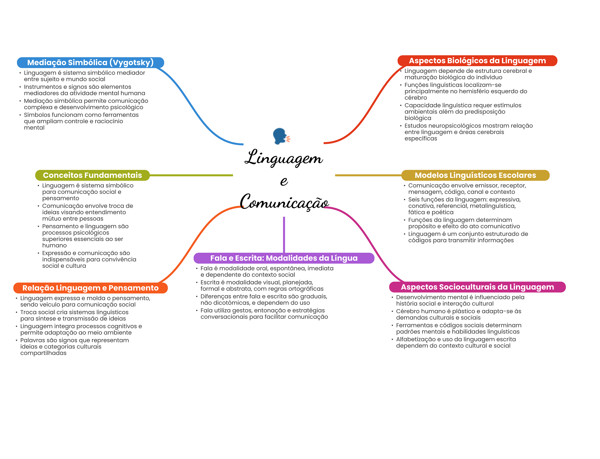Mediação Simbólica (Vygotsky) Aspectos Biológicos da Linguagem Linguagem é sistema simbólico mediador Linguagem depende de estrutura cerebral e entre sujeito e mundo social maturação biológica do indivíduo Instrumentos e signos são elementos Funções linguísticas localizam-se mediadores da atividade mental humana principalmente no hemisfério esquerdo do cérebro Mediação simbólica permite comunicação complexa e desenvolvimento psicológico Capacidade linguística requer estímulos Símbolos funcionam como ferramentas ambientais além da predisposição que ampliam controle e raciocínio biológica mental Estudos neuropsicológicos mostram relação entre linguagem e áreas cerebrais específicas Linguagem Conceitos Fundamentais Modelos Linguísticos Escolares e Linguagem é sistema simbólico Comunicação envolve emissor, receptor, para comunicação social e mensagem, código, canal e contexto pensamento Comunicação envolve troca de Comunicação Seis funções da linguagem: expressiva, conativa, referencial, metalinguística, ideias visando entendimento fática e poética mútuo entre pessoas Funções da linguagem determinam Pensamento e linguagem são propósito e efeito do ato comunicativo processos psicológicos Linguagem é um conjunto estruturado de superiores essenciais ao ser códigos para transmitir informações humano Expressão e comunicação são indispensáveis para convivência Fala e Escrita: Modalidades da Língua social e cultura Fala é modalidade oral, espontânea, imediata e dependente do contexto social Escrita é modalidade visual, planejada, Relação Linguagem e Pensamento formal e abstrata, com regras ortográficas Aspectos Socioculturais da Linguagem Linguagem expressa e molda pensamento, Diferenças entre fala e escrita são graduais, Desenvolvimento mental é influenciado pela sendo veículo para comunicação social não dicotômicas, e dependem do uso história social e interação cultural Troca social cria sistemas linguísticos Fala utiliza gestos, entonação e estratégias Cérebro humano é plástico e adapta-se às para e transmissão de ideias para facilitar comunicação demandas culturais e sociais Linguagem integra processos cognitivos e Ferramentas e códigos sociais determinam permite adaptação ao meio ambiente padrões mentais e habilidades linguísticas Palavras são signos que representam Alfabetização e uso da linguagem escrita ideias e categorias culturais dependem do contexto cultural e social compartilhadas