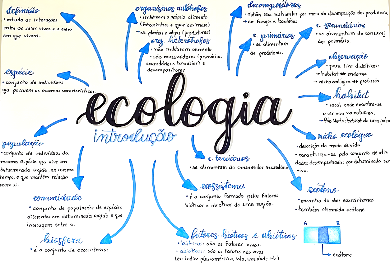 definição organismos decompositores sintetizam próprio alimento obtem seus nutrientes por meio da decomposição dos cons. estuda as interações e quimiossintese) ex: e bactérios entre seres vivos e meio em que vivem. plantas (produtores) primários se alimentam de consumi org. se alimentam dor primário. alimento são consumidores do produtores. observação e decompositores. para espécie habitat conjunto de nicho ecológico profissão que possuem as mesmos ecologia habitat local onde encontra-se ser vivo na natureza. Pob Norte do urso polar nicho ecológico descrição do modo de vida conjunto de da terciários se pelo conjunto de ativi mesma espécie que vive em dades por determinado ser se alimentam de consumidor determinada ao mesmo vivo. tempo, e que relação entre si. erossistema ecotono comunidade O conjunto pelos encontro de ecossistemas conjunto de populações de espécies bioticos e abioticos de uma também chamado ecotone diferentes determinada e que interagem entre si. A biosfera fatores & abióticos bioticos: vivos. é O conjunto de ecossistemas abioticos: fatores vivos ecotone (ex: indice solo, umidade etc)