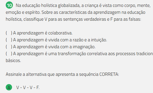 10 Na educação holística globalizada, a criança é vista como corpo, mente, emoção e espírito. Sobre as características da aprendizagem na educação holística, classifique V para as sentenças verdadeiras e F para as falsas: ( ) A aprendizagem é colaborativa. ( ) A aprendizagem é vivida com a razão e a intuição. ( ) A aprendizagem é vivida com a imaginação. ( ) A aprendizagem é uma transformação correlativa aos processos tradicion básicos. Assinale a alternativa que apresenta a sequência CORRETA: A V-V-V-F.