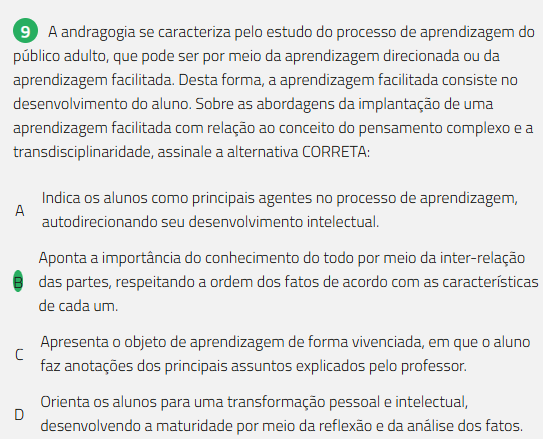 9 A andragogia se caracteriza pelo estudo do processo de aprendizagem do público adulto, que pode ser por meio da aprendizagem direcionada ou da aprendizagem facilitada. Desta forma, a aprendizagem facilitada consiste no desenvolvimento do aluno. Sobre as abordagens da implantação de uma aprendizagem facilitada com relação ao conceito do pensamento complexo e a transdisciplinaridade, assinale a alternativa CORRETA: Indica alunos como principais agentes no processo de aprendizagem, A autodirecionando seu desenvolvimento intelectual. Aponta a importância do conhecimento do todo por meio da inter-relação das partes, respeitando a ordem dos fatos de acordo com as características de cada um. Apresenta O objeto de aprendizagem de forma vivenciada, em que O aluno C faz anotações dos principais assuntos explicados pelo professor. Orienta 05 alunos para uma transformação pessoal e intelectual, D desenvolvendo a maturidade por meio da reflexão e da análise dos fatos.