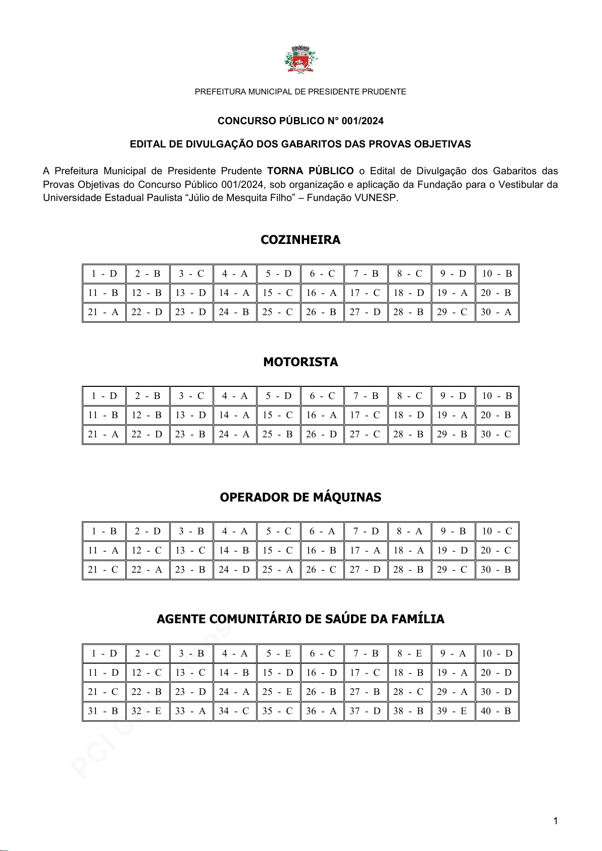 A Prefeitura Municipal de Presidente Prudente TORNA PÚBLICO o Edital de Divulgação dos Gabaritos das