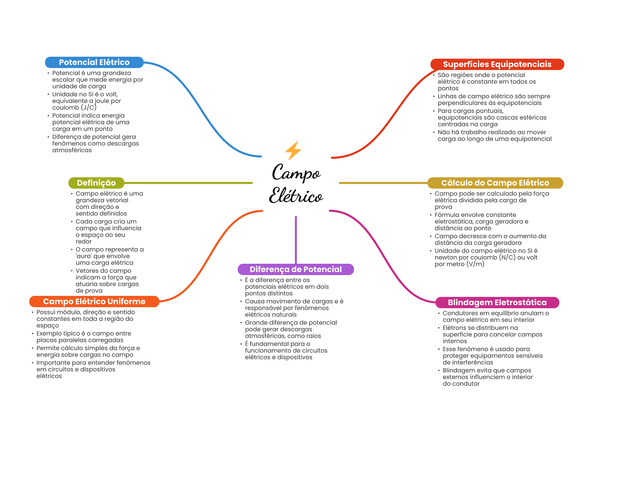 Potencial Elétrico Superfícies Equipotenciais Potencial é uma grandeza São regiões onde potencial escalar que mede energia por elétrico é constante em todos os unidade de carga pontos Unidade no SI é volt, Linhas de campo elétrico são sempre equivalente a joule por perpendiculares às equipotenciais coulomb Para cargas pontuais, Potencial indica energia equipotenciais são cascas esféricas potencial elétrica de uma centradas na carga carga em um ponto Não há trabalho realizado ao mover Diferença de potencial gera carga ao longo de uma equipotencial fenômenos como descargas atmosféricas Campo Definição Cálculo do Campo Elétrico Campo elétrico é uma Elétrico Campo pode ser calculado pela força grandeza vetorial elétrica dividida pela carga de com direção e prova sentido definidos Fórmula envolve constante Cada carga cria um eletrostática, carga geradora e campo que influencia distância ao ponto espaço ao seu Campo decresce com O aumento da redor distância da carga geradora campo representa a Unidade do campo elétrico no SI é 'aura' que envolve newton por coulomb (N/C) ou volt uma carga elétrica por metro (v/m) Vetores do campo Diferença de Potencial indicam a força que É a diferença entre atuaria sobre cargas potenciais elétricos em dois de prova pontos distintos Campo Elétrico Uniforme Causa movimento de cargas e é Blindagem Eletrostática responsável por fenômenos Possui módulo, direção e sentido elétricos naturais Condutores em equilíbrio anulam constantes em toda a região do Grande diferença de potencial campo elétrico em seu interior espaço pode gerar descargas Elétrons se distribuem na Exemplo típico é campo entre atmosféricas, como raios superfície para cancelar campos placas paralelas carregadas É fundamental para internos Permite cálculo simples da força e funcionamento de circuitos Esse fenômeno é usado para energia sobre cargas no campo elétricos e dispositivos proteger equipamentos sensíveis Importante para entender fenômenos de interferências em circuitos e dispositivos Blindagem evita que campos elétricos externos influenciem interior do condutor