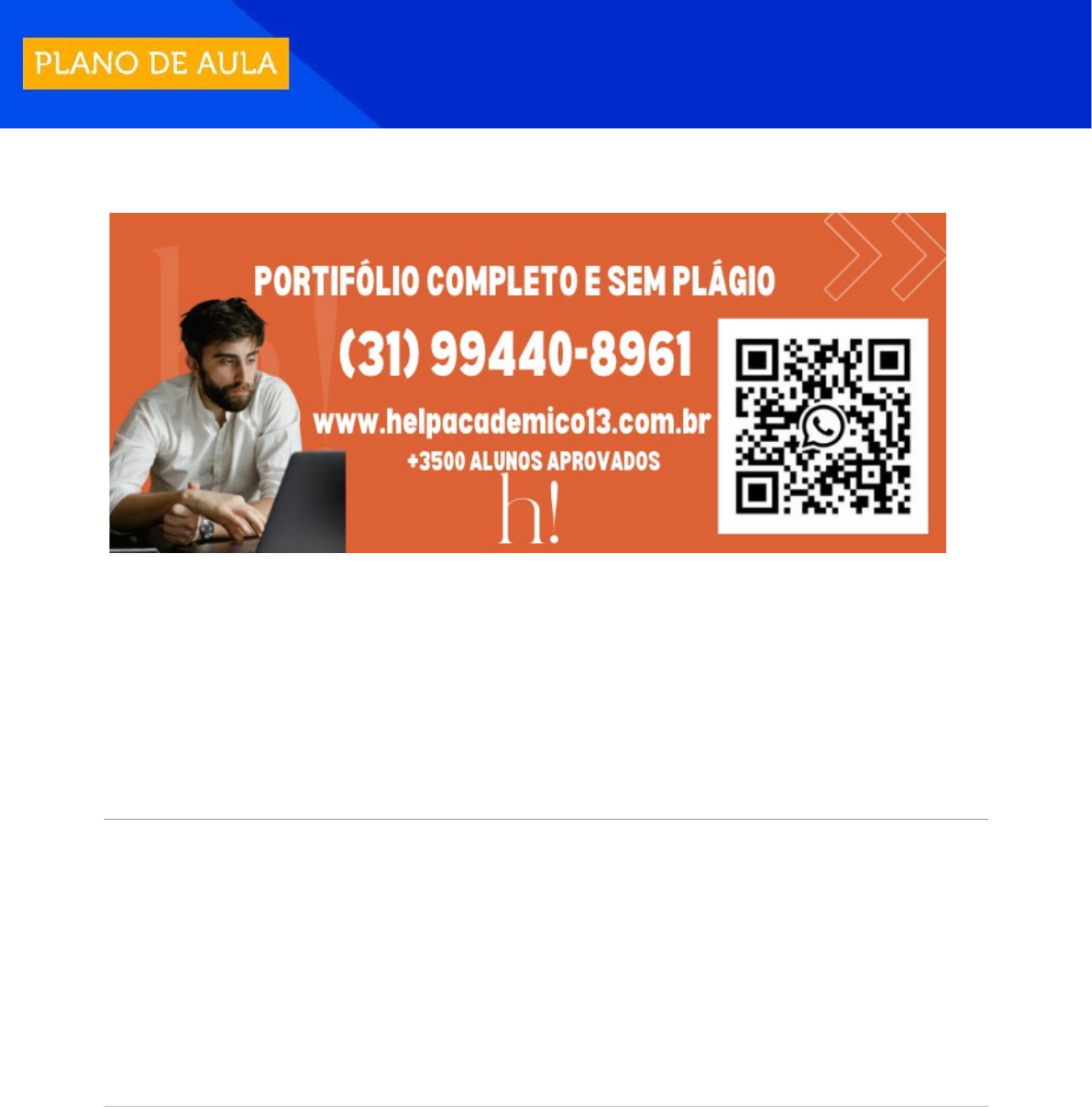 PRÁTICAS PEDAGÓGICAS EM PORTUGUÊS:ANOS FINAIS DO ENSINO FUNDAMENTAL Olá, estudante! Neste momento, você realizará uma atividade prática relacionada a uma situação típica da atuação do professor. Objetivos · Promover o conhecimento sobre a importância do trabalho interdisciplinar para a efetivação das práticas educativas; · Estimular a criatividade do estudante; · Valorizar os diferentes gêneros textuais bem como as diferentes formas de análise semiótica/linguística. Situação-problema Caro estudante, neste projeto, propomos a você um exercício prático, no qual você será o professor de Língua Portuguesa de uma turma do 9º ano do Ensino Fundamental. Você irá sugerir uma atividade interdisciplinar, mostrando como é possível fazer a análise semiótica das obras de arte: O par de sapatos e Um par de tamancos de couro, ambas pintadas por Vincent van Gogh, como vemos nas imagens a seguir: Figura 1 | O par de sapatos, 1886, Van Gogh Fonte: Domínio Público. Público Figura 2 | Um par de tamancos de couro, 1889, Van Gogh Fonte: Domínio Público. Diante das imagens, você, como professor do 9º ano, pensará em estratégias possíveis para a proposição de uma aula que aplique a interdisciplinaridade e ainda envolva os alunos em uma atividade em grupo. Para tanto, você, futuro professor de Língua Portuguesa, precisará focar em algumas das habilidades da BNCC, tais como: (EF69LP30) Comparar, com a ajuda do professor, conteúdos, dados e informações de diferentes fontes, levando em conta seus contextos de produção e referências, identificando coincidências, complementaridades e contradições, de forma a poder identificar erros/imprecisões conceituais, compreender e posicionar-se criticamente sobre os conteúdos e informações em questão. (EF69AR05) Experimentar e analisar diferentes formas de expressão artística (desenho, pintura, colagem, quadrinhos, dobradura, escultura, modelagem, instalação, vídeo, fotografia, performance etc.). (EF69AR31) Relacionar as práticas artísticas às diferentes dimensões da vida social, cultural, política, histórica, econômica, estética e ética. (EF69AR32) Analisar e explorar, em projetos temáticos, as relações processuais entre diversas linguagens artísticas. Além disso, você, como professor mediador da turma, deverá auxiliar os alunos na resolução de dúvidas e nas dificuldades por eles enfrentadas. Na sua sala, alguns alunos dizem não compreender essa possível relação entre língua portuguesa e arte; por esse motivo, você deverá mostrar, com exemplos, essas aproximações relacionando as práticas artísticas com a produção das múltiplas linguagens e seus efeitos de sentido. Passo 1 Para realizar a atividade, você precisará: · elaborar um plano de aula destinado a estudantes do 9º ano do Ensino Fundamental, seguindo a proposta apresentada na situação-problema. · seguir as instruções e preencher o quadro a seguir, que consiste em um modelo de plano Público de aula. Nenhum dos itens deve ser excluído ou ficar sem preenchimento. PLANO DE AULA Componente curricular: Insira aqui o nome da disciplina. Unidade temática: Insira aqui a unidade temática conforme a BNCC. Objeto do conhecimento: Insira aqui o objeto do conhecimento conforme a BNCC. Habilidade(s): Insira aqui a(s) habilidade(s) conforme a BNCC, reproduzindo a numeração e a descrição. Tema da aula: Insira aqui o título da aula. Turma: Insira aqui o ano e o nível de ensino. Duração: Insira aqui o número de aulas e o tempo de cada uma delas. Objetivo(s): Insira aqui o(s) objetivo(s) que você deseja que os estudantes alcancem. Competências : Insira aqui as competências conforme a BNCC. Conteúdo programático: Insira aqui os conteúdos a serem abordados. Metodologia: Insira aqui as estratégias que orientam a condução da aula (ex: criação de mapa conceitual, sala de aula invertida, etc.). Recursos didáticos: Insira aqui os materiais a serem utilizados (ex: lousa, games, música, etc.). Resultados de aprendizagem Insira aqui os resultados de aprendizagem esperados para essa aula. Critérios de avaliação: Insira aqui os métodos avaliativos. Referências: Insira aqui a bibliografia básica e a complementar. Passo 2: Elaboração do trabalho para postagem no AVA, contendo: 1) Capa da Instituição, conforme orientação disponível na biblioteca virtual. 2) Introdução: texto dissertativo fundamentando a proposta do plano de aula, os objetivos e resultados de apendizagem esperados.. 3) Plano de aula elaborado, conforme modelo estabelecido no passo 1. NORMAS PARA ENTREGA DA ATIVIDADE PRÁTICA Público · Você deverá postar seu trabalho final no AVA, na pasta específica relacionada à atividade prática, obedecendo o prazo limite de postagem, conforme disposto no AVA. · O trabalho deve ser enviado em formato Word ou PDF, em um ARQUIVO ÚNICO de até 10 MB. · O sistema permite anexar apenas um arquivo. Caso haja mais de uma postagem, será considerada a última versão. IMPORTANTE: · A entrega da atividade, de acordo com a proposta solicitada, é um critério de aprovação na disciplina. · Não há prorrogação para a postagem da atividade. Aproveite essa oportunidade para aprofundar ainda mais seus conhecimentos. Bons estudos! Referências ACERVO da Fundação Vincent Van Gogh. Descubra a vida e obra de Vincent Van Gogh. MuseuVan Gogh. Amsterdam. 2023. Disponível em: https://www.vangoghmuseum.nl/nl. Acesso em: 04 jul. 2024. BRASIL. Base Nacional Comum Curricular (BNCC). Ministério da Educação, 2018. Disponível em: http://basenacionalcomum.mec.gov.br/images/BNCC_EI_EF_110518_versaofinal_site.pdf Acesso em: 26 jan. 2023. BRASIL. Base Nacional Comum Curricular. Caderno de práticas do ensino fundamental – Anos finais. Ministério da Educação. Disponível em: http://basenacionalcomum.mec.gov.br/implementacao/praticas/caderno-de-praticas/ensino- fundamental-anos-finais/ Acesso em: 04 jul. 2024.