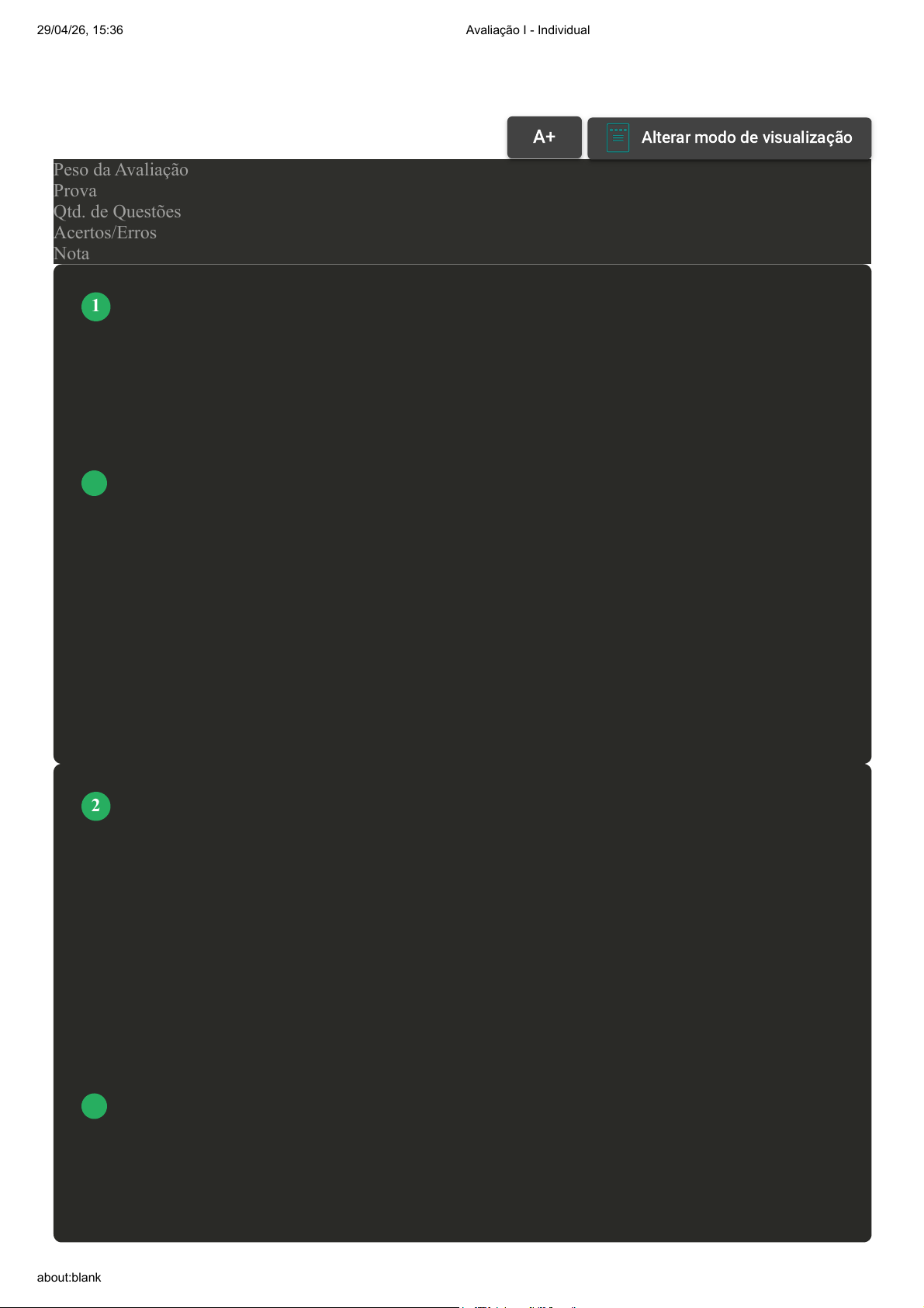 Prova Impressa GABARITO | Avaliação I - Individual (Cod.:1597020) Peso da Avaliação 1,50 Prova 118679978 Qtd. de Questões 10 Acertos/Erros 8/2 Nota 8,00 A transdisciplinaridade é um princípio do qual decorrem várias conseqüências práticas, tanto nas metodologias de ensino quanto na proposta curricular e pedagógica. Ela considera que embora cada um dos campos guarde suas especificidades, há entre eles um intercâmbio permanente, formando novos campos. De acordo com os campos transdisciplinares de saberes e práticas da saúde ccoletiva, assinale a alternativa CORRETA: A Saberes; Agentes; Práticas. B Sonhar; Agente; Devolução. C Agentes; Devolução; Lealdade. D Práticas; Agentes; Seleção. Atualmente é considerada Saúde Pública todo o conjunto de medidas executadas pelo Estado para garantir o bem-estar físico, mental e social da população. Em nível internacional, a saúde pública é coordenada pela Organização Mundial de Saúde – OMS, composta atualmente por 194 países. A categoria ALVO da promoção da saúde está relacionada a: Assinale a alternativa CORRETA: A Médicos. B Grupos de alto risco da população . C Toda a população no seu ambiente total. D Profissionais de saúde. VOLTAR A+Aumentar, FonteAlterar modo de visualização 1 2 29/04/26, 15:36 Avaliação I - Individual about:blank 1/5 A primeira vacina que setem registro foi criada por Eduard Jenner em 1796, o que prevenia: Assinale a alternativa CORRETA: A H1N1. B Sarampo. C Varíola. D Febre Amarela. É considerada Saúde Pública todo o conjunto de medidas executadas pelo Estado para garantir o bem- estar físico, mental e social da população. Em nível internacional, a saúde pública é coordenada pela Organização Mundial de Saúde – OMS, composta atualmente por 194 países. Sobre como podemos definir saúde pública, segundo Winslow (1920), assinale a alternativa CORRETA: A Uma ciência e uma distopia de evitar doenças, prolongar a vida e desenvolver a saúde física, mental e social. Através de esforços feito pelos governantes para a organizaçao de uma comunidade para o saneamento do emio ambiente. B Uma ciência e uma arte de evitar doenças, prolongar a vida e desenvolver a saúde física, mental e espiritual Através de esforços feito pelos governantes para a organizaçao de uma comunidade para o saneamento do emio ambiente, controle de infecções na cominidade, a organização dos serviços médicos e paramédicos para o diagnóstico precoce e o tratamento preventivo de doenças. C É uma ciência e arte de provocar doenças, prolongar a e desenvolver a saúde física, mental e a eficiência, através de esforços organizaddo pela comunidade para o saneamento do meio ambiente, controle das infecções na comunidade, a organização dos serviços médicos e paramédicos para o diagnóstico precoce e o tratamento preventivo de doenças. D Uma ciência e uma arte de evitar doenças, prolongar a vida e desenvolver a saúde física, mental e a eficiência, através de esforços organidazados da comunidade para o saneamento do meio ambiente, controle de infecções na comunidade, a organização dos serviços médicos e paramédicos para o diagnóstico precoce e o tratamento preventivo de doenças. 3 4 29/04/26, 15:36 Avaliação I - Individual about:blank 2/5 Pesquisar as ações da promoção da saúde de modo a construir estratégiascom crescente efetividade e eficácia é um dos eixos de atuação que compõem: Assinale a alternativa CORRETA: A Integridade.F B Descentralização. C Educação em Saúde. D Federalização. Referente a Saúde Coletiva. Classifique V para as sentenças verdadeiras e F para as falsas: ( ) Atua em três dimensões: Planejamento de gestões política, epidemiologia social e ciências de forma global. ( ) É assistencial, curativa. ( ) Foco na diversidade e especificidade dos grupos populacionais. ( ) É planejada de acordo com as necessidades de cada região. Assinale a alternativa que apresenta a sequência CORRETA: A V – F – F – V. B V – F – V – F. C F – F – V – V. D V – F – V – V. O surgimento da saúde coletiva passou por três momentos históricos: movimento preventivista, medicina social e saúde coletiva. E, para entendermos o primeiro momento, chamado de “movimento 5 Revisar Conteúdo do Livro 6 7 29/04/26, 15:36 Avaliação I - Individual about:blank 3/5 preventivista” é necessário que recordemos a trajetória das doenças até chegar à descoberta das vacinas e medicamentos. Acerca das respectivas datas históricas, assinale a alternativa CORRETA: A Movimento preventista 1950; Medicina social 1970 e Saúde coletiva 1980. B Saúde coletiva 1950; Medicina social 1970 e Movimento preventista 1980. C Psicologia Estatal 1785; Parlamentarismo democrático 1567; Movimento pessimista 1995. D Medicina social 1950; Movimento preventista 1970 e Saúde coletiva 1980. Sobre a Reforma Sanitária, classifique V para as sentenças verdadeiras e F para as falsas: ( ) Este movimento começou nos anos 60, durante a Ditadura Militar. ( ) Tinha por objetivo contribuir para a democracia e garantir a assistência integral à saúde curativa e preventiva a todos, com proteção social, pois nesta época só tinham direito á saúde as mulheres e os idosos; ( ) Em 1986 ficou estabelecido que saúde incluía melhores condições de alimentação, trabalho, educação, transporte, habitação, lazer e liberdade. Assinale a alternativa que apresenta a sequência CORRETA: A F - V - V. B V - V - V. C F - F - V. D V - F - V. Na saúde coletiva, a atenção à saúde é marcada pela sua complexidade e particularidades na relação com os saberes, bem como a transdisciplinaridade e a especificidade almejam assimilar o indivíduo. Com esse propósito, possibilitam outro acesso para a efetiva prática científica, viabilizando novas estratégias de ações para o coletivo. Assinale a alternativa CORRETA que apresenta o elemento da transdisci