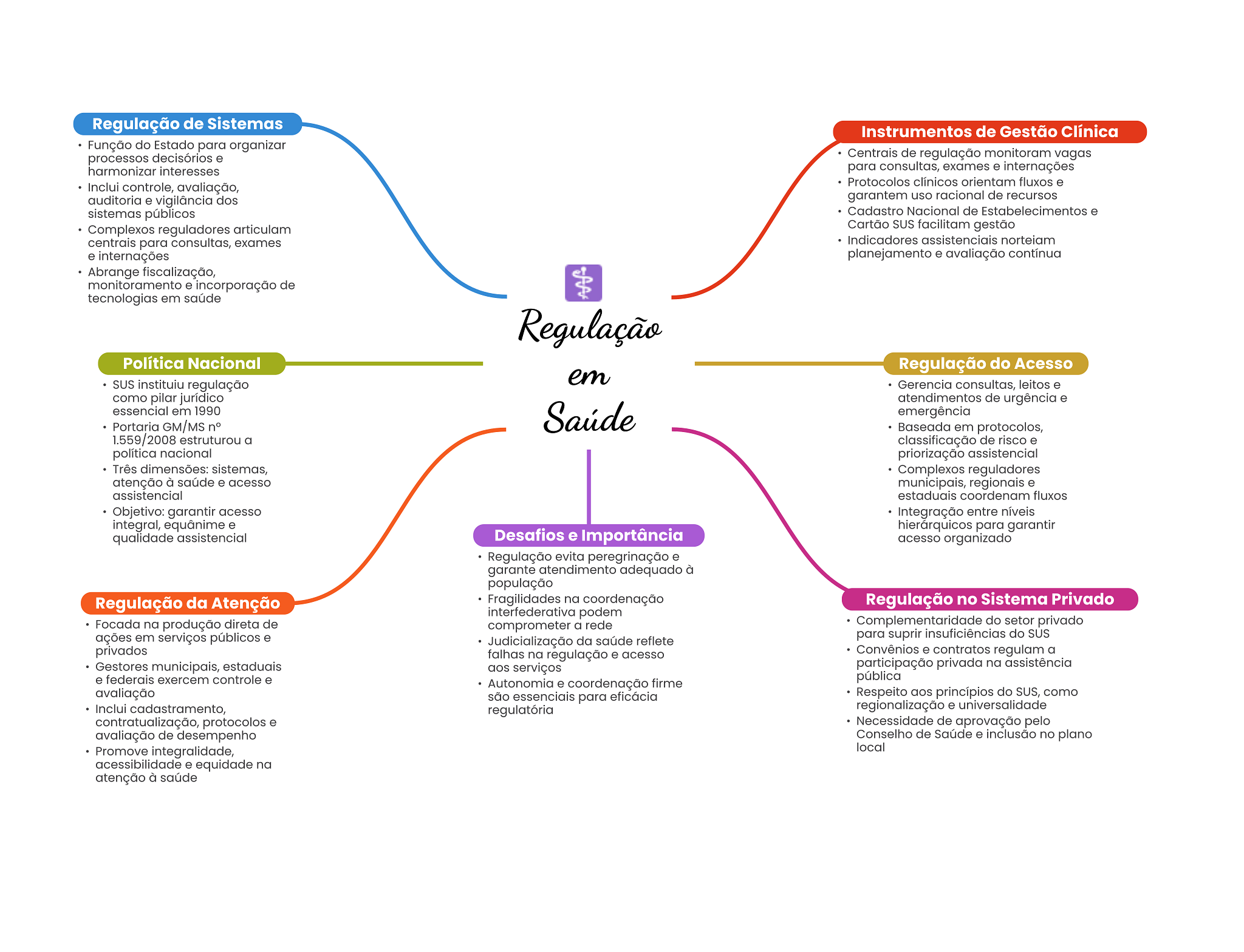 Regulação de Sistemas Instrumentos de Gestão Clínica Função do Estado para organizar processos decisórios e Centrais de regulação monitoram vagas harmonizar interesses para consultas, exames e internações Inclui controle, avaliação, Protocolos clínicos orientam fluxos e auditoria e vigilância dos garantem uso racional de recursos sistemas públicos Cadastro Nacional de Estabelecimentos e Complexos reguladores articulam Cartão SUS facilitam gestão centrais para consultas, exames Indicadores assistenciais norteiam e internações planejamento e avaliação contínua Abrange fiscalização, monitoramento e incorporação de tecnologias em saúde Regulação Política Nacional Regulação do Acesso em SUS instituiu regulação Gerencia consultas, leitos e como pilar jurídico atendimentos de urgência e essencial em 1990 Portaria GM/MS n° Saúde emergência Baseada em protocolos, 1.559/2008 estruturou a classificação de risco e política nacional priorização assistencial Três dimensões: sistemas, Complexos reguladores atenção à saúde e acesso municipais, regionais e assistencial estaduais coordenam fluxos Objetivo: garantir acesso Integração entre níveis integral, equânime e hierárquicos para garantir qualidade assistencial Desafios e Importância acesso organizado Regulação evita peregrinação e garante atendimento adequado à população Regulação da Atenção Fragilidades na coordenação Regulação no Sistema Privado interfederativa podem Focada na produção direta de comprometer a rede Complementaridade do setor privado ações em serviços públicos e para suprir insuficiências do SUS Judicialização da saúde reflete privados falhas na regulação e acesso Convênios e contratos regulam a Gestores municipais, estaduais aos serviços participação privada na assistência e federais exercem controle e pública Autonomia e coordenação firme avaliação são essenciais para eficácia Respeito aos princípios do SUS, como Inclui cadastramento, regulatória regionalização e universalidade contratualização, protocolos e Necessidade de aprovação pelo avaliação de desempenho Conselho de Saúde e inclusão no plano Promove integralidade, local acessibilidade e equidade na atenção à saúde
