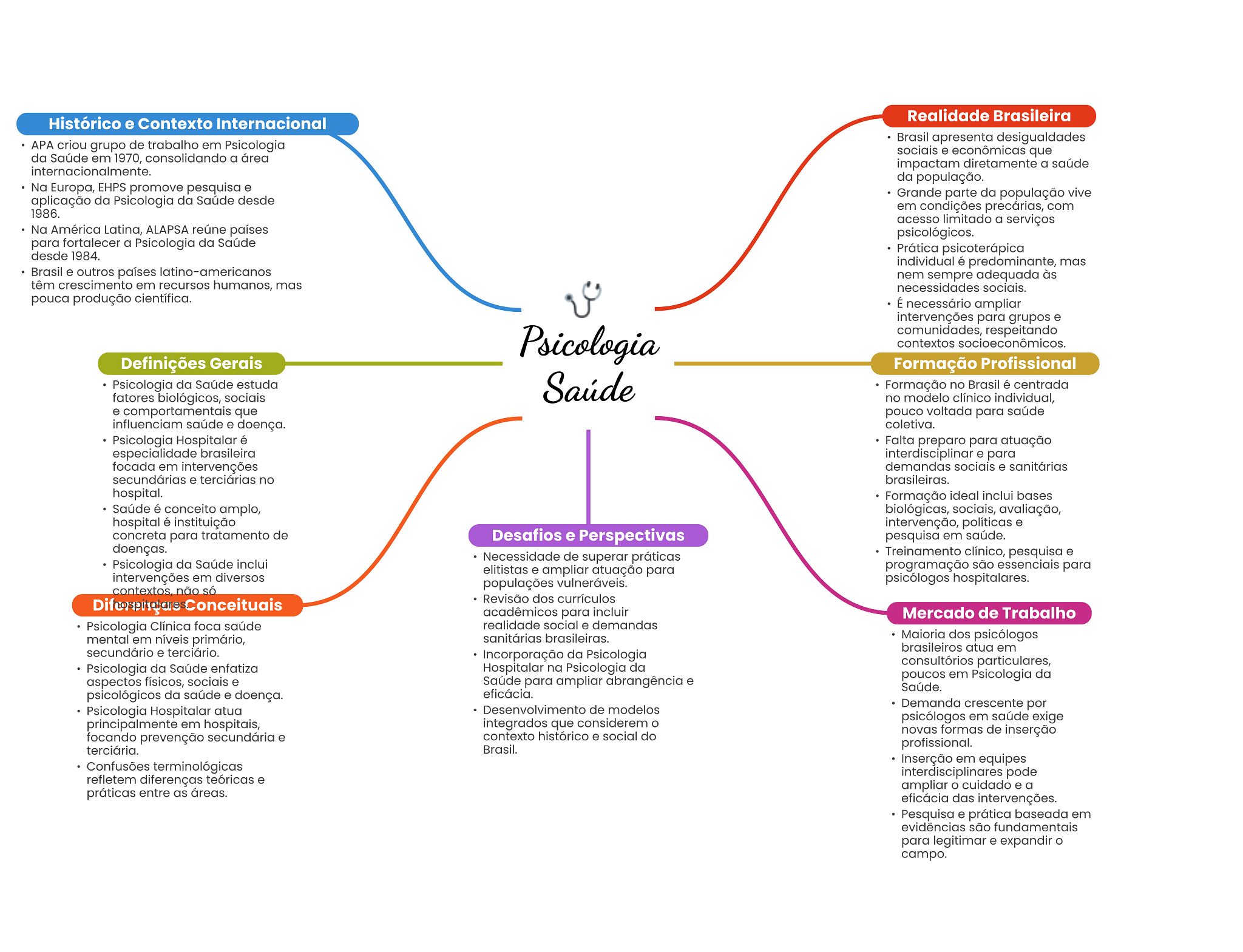 Histórico e Contexto Internacional Realidade Brasileira Brasil apresenta desigualdades APA criou grupo de trabalho em Psicologia sociais e econômicas que da Saúde em 1970, consolidando a área impactam diretamente a saúde internacionalmente. da população. Na Europa, EHPS promove pesquisa e Grande parte da população vive aplicação da Psicologia da Saúde desde em condições precárias, com 1986. acesso limitado a serviços Na América Latina, ALAPSA reúne países psicológicos. para fortalecer a Psicologia da Saúde Prática psicoterápica desde 1984. individual é predominante, mas Brasil e outros países latino-americanos nem sempre adequada às têm crescimento em recursos humanos, mas necessidades sociais. pouca produção científica. É necessário ampliar intervenções para grupos e Psicologia comunidades, respeitando contextos socioeconômicos. Definições Gerais Formação Profissional Psicologia da Saúde estuda Saúde Formação no Brasil é centrada fatores biológicos, sociais no modelo clínico individual, e comportamentais que pouco voltada para saúde influenciam saúde e doença. coletiva. Psicologia Hospitalar é Falta preparo para atuação especialidade brasileira interdisciplinar e para focada em intervenções demandas sociais e sanitárias secundárias e terciárias no brasileiras. hospital. Formação ideal inclui bases Saúde é conceito amplo, biológicas, sociais, avaliação, hospital é instituição intervenção, políticas e concreta para tratamento de Desafios e Perspectivas pesquisa em saúde. doenças. Necessidade de superar práticas Treinamento clínico, pesquisa e Psicologia da Saúde inclui elitistas e ampliar atuação para programação são essenciais para intervenções em diversos populações vulneráveis. psicólogos hospitalares. contextos, não só Conceituais Revisão dos currículos acadêmicos para incluir Mercado de Trabalho Psicologia Clínica foca saúde realidade social e demandas mental em níveis primário, sanitárias brasileiras. Maioria dos psicólogos secundário e terciário. brasileiros atua em Incorporação da Psicologia Hospitalar na Psicologia da consultórios particulares, Psicologia da Saúde enfatiza Saúde para ampliar abrangência e poucos em Psicologia da aspectos físicos, sociais e Saúde. psicológicos da saúde e doença. eficácia. Psicologia Hospitalar atua Desenvolvimento de modelos Demanda crescente por principalmente em hospitais, integrados que considerem psicólogos em saúde exige focando prevenção secundária e contexto histórico e social do novas formas de inserção terciária. Brasil. profissional. Inserção em equipes Confusões terminológicas interdisciplinares pode refletem diferenças teóricas e ampliar cuidado e a práticas entre as áreas. eficácia das intervenções. Pesquisa e prática baseada em evidências são fundamentais para legitimar e expandir campo.