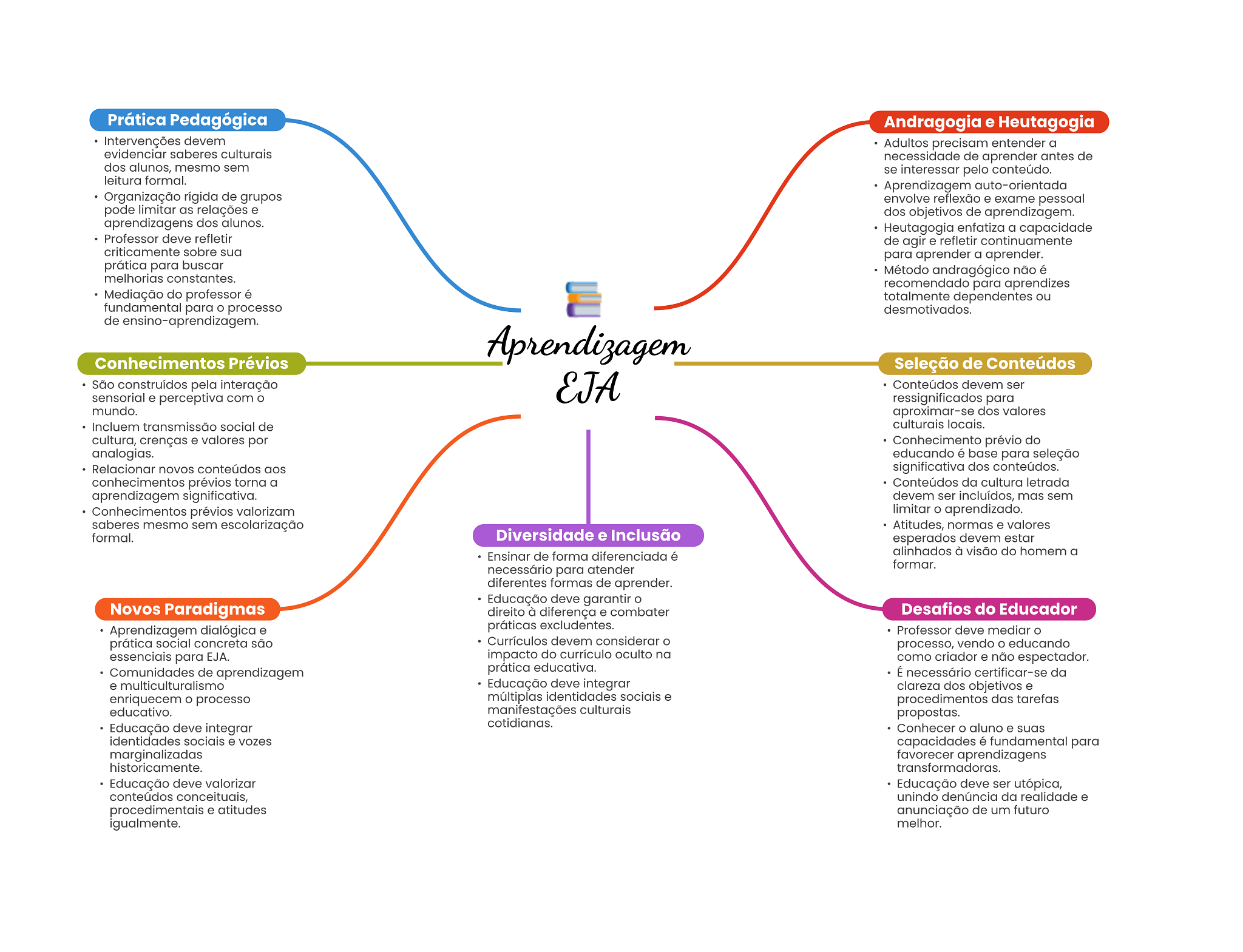 Prática Pedagógica Andragogia e Heutagogia Intervenções devem Adultos precisam entender a evidenciar saberes culturais necessidade de aprender antes de dos alunos, mesmo sem se interessar pelo conteúdo. leitura formal. Aprendizagem auto-orientada Organização rígida de grupos envolve reflexão e exame pessoal pode limitar as relações e dos objetivos de aprendizagem. aprendizagens dos alunos. Heutagogia enfatiza a capacidade Professor deve refletir de agir e refletir continuamente criticamente sobre sua para aprender a aprender. prática para buscar Método andragógico não é melhorias constantes. recomendado para aprendizes Mediação do professor é totalmente dependentes ou fundamental para O processo desmotivados. de ensino-aprendizagem Aprendizagem Conhecimentos Prévios Seleção de Conteúdos São construídos pela interação EJA Conteúdos devem ser sensorial e perceptiva com ressignificados para mundo. aproximar-se dos valores Incluem transmissão social de culturais locais. cultura, crenças e valores por Conhecimento prévio do analogias. educando é base para seleção Relacionar novos conteúdos aos significativa dos conteúdos. conhecimentos prévios torna a Conteúdos da cultura letrada aprendizagem significativa. devem ser incluídos, mas sem Conhecimentos prévios valorizam limitar aprendizado. saberes mesmo sem escolarização Atitudes, normas e valores formal. Diversidade e Inclusão esperados devem estar Ensinar de forma diferenciada é alinhados à visão do homem a necessário para atender formar. diferentes formas de aprender. Educação deve garantir Novos Paradigmas direito à diferença e combater Desafios do Educador Aprendizagem dialógica e práticas excludentes. Professor deve mediar prática social concreta são Currículos devem considerar processo, vendo educando essenciais para EJA. impacto do currículo oculto na como criador e não espectador. Comunidades de aprendizagem prática educativa. É necessário certificar-se da e multiculturalismo Educação deve integrar clareza dos objetivos e enriquecem processo múltiplas identidades sociais e procedimentos das tarefas educativo. manifestações culturais propostas. Educação deve integrar cotidianas. Conhecer aluno e suas identidades sociais e vozes capacidades é fundamental para marginalizadas favorecer aprendizagens historicamente. transformadoras. Educação deve valorizar Educação deve ser utópica, conteúdos conceituais, unindo denúncia da realidade e procedimentais e atitudes anunciação de um futuro igualmente. melhor.