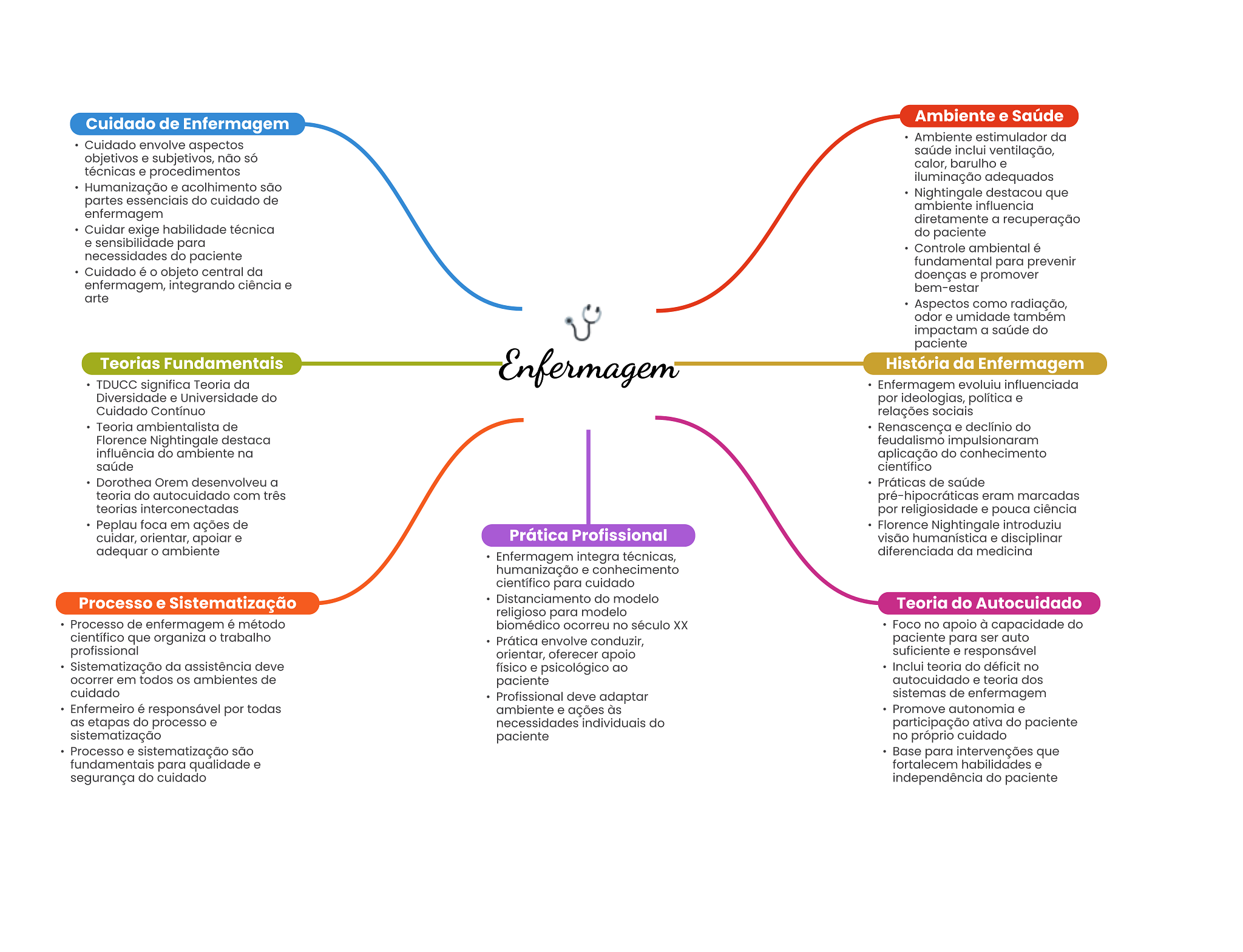 Ambiente e Saúde Cuidado de Enfermagem Ambiente estimulador da Cuidado envolve aspectos saúde inclui ventilação, objetivos e subjetivos, não só calor, barulho e técnicas e procedimentos iluminação adequados Humanização e acolhimento são Nightingale destacou que partes essenciais do cuidado de ambiente influencia enfermagem diretamente a recuperação Cuidar exige habilidade técnica do paciente e sensibilidade para Controle ambiental é necessidades do paciente fundamental para prevenir Cuidado é objeto central da doenças e promover enfermagem, integrando ciência e bem-estar arte Aspectos como radiação, odor e umidade também impactam a saúde do paciente Teorias Fundamentais Enfermagem História da Enfermagem TDUCC significa Teoria da Enfermagem evoluiu influenciada Diversidade e Universidade do por ideologias, política e Cuidado Contínuo relações sociais Teoria ambientalista de Renascença e declínio do Florence Nightingale destaca feudalismo impulsionaram influência do ambiente na aplicação do conhecimento saúde científico Dorothea Orem desenvolveu a Práticas de saúde teoria do autocuidado com três pré-hipocráticas eram marcadas teorias interconectadas por religiosidade e pouca ciência Peplau foca em ações de Florence Nightingale introduziu cuidar, orientar, apoiar e Prática Profissional visão humanística e disciplinar adequar O ambiente Enfermagem integra técnicas, diferenciada da medicina humanização e conhecimento científico para cuidado Processo e Sistematização Distanciamento do modelo Teoria do Autocuidado religioso para modelo Processo de enfermagem é método biomédico ocorreu no século Foco no apoio à capacidade do científico que organiza trabalho Prática envolve conduzir, paciente para ser auto profissional orientar, oferecer apoio suficiente e responsável Sistematização da assistência deve físico e psicológico ao Inclui teoria do déficit no ocorrer em todos ambientes de paciente autocuidado e teoria dos cuidado Profissional deve adaptar sistemas de enfermagem Enfermeiro é responsável por todas ambiente e ações às Promove autonomia e as etapas do processo e necessidades individuais do participação ativa do paciente sistematização paciente no próprio cuidado Processo e sistematização são Base para intervenções que fundamentais para qualidade e fortalecem habilidades e segurança do cuidado independência do paciente