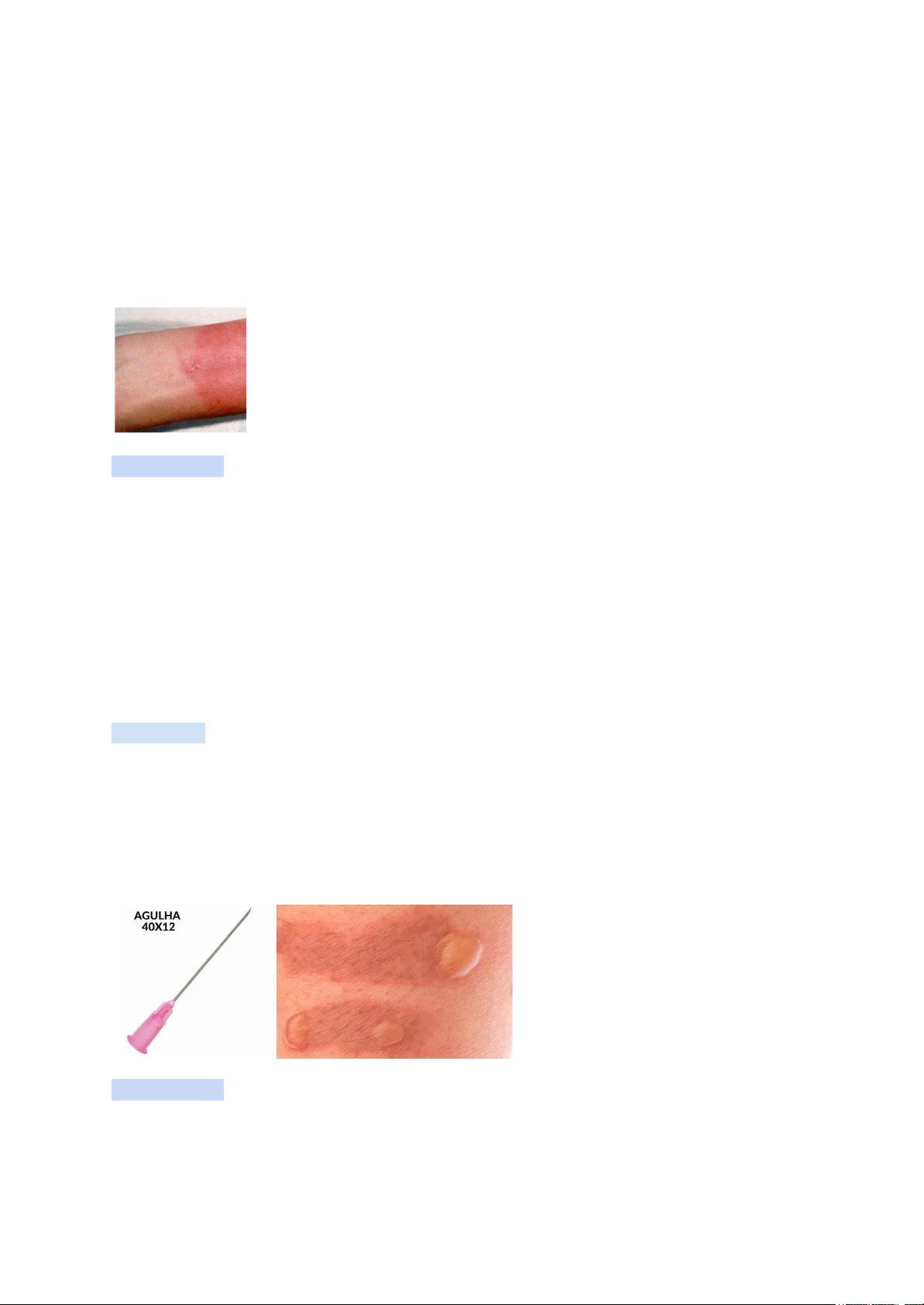 Condutas Dermatológicas AULA 1 - QUEIMADURAS ● PRIMEIRO GRAU: Camada mais superficial da pele: vermelhidão, aumento da temperatura local e dor. USO TÓPICO 1- Dexametasona ou Mometasona creme --------------------------------------- Aplicar na lesão 2x ao dia, por 3 a 5 dias 2- Cicaplast Baume B5------------------------------------------ Aplicar na lesão 2x ao dia até cicatrização completa 3- Protetor solar FPS >50 (Ex.: Neutrogena Suns Fresh) Aplicar sobre o local a cada 4h USO ORAL 1- Dipirona 1g ou Paracetamol----------------------------------- Tomar 1 cp 6/6h se dor ● SEGUNDO GRAU: Bolhas e muita dor. O QUE FAZER NO PS: Aspirar com agulha 40G (ROSA) e usar o teto da bolha como curativo BIOLÓGICO. USO TÓPICO 1- Sulfadiazina de Prata ou Dermacerium HS----------------------------- Aplicar na lesão 2x ao dia por 10 dias DEPOIS: 2- Cicaplast BAUME B5-------------------------------------------------------- Aplicar na lesão 2x ao dia até cicatrização completa 3- Neutrogena Sun fresh FPS> 50---------------------------------------- Aplicar no colar a cada 4h Lavar o local com água fria corrente e sabonete de glicerina USO ORAL 1- Dipirona ou paracetamol ou Tramal se dor intensa ● TERCEIRO GRAU: INDOLORES: Pois destroem os nervos deste local, pode atingir músculos e gerar deformidades Maioria: internação hospitalar para evitar desequilíbrio hidroeletrolítico. Se houver tecido necrótico: precisa retirar Lavar com água corrente e sabonete neutro de Glicerina Curativo com Sulfadiazina de Prata ● QUEIMADURA SOLAR: Compressas Frias/Hidratação oral/EVITAR SOL – Esse tipo de queimadura é fator de risco importante para MELANOMA. ● HIDRATAÇÃO ORAL ● COMPRESSA FRIA CAMOMILA ● NÃO RETIRAR A PELE DESCAMANDO USO TÓPICO 1- CeraVE Loção Hidratante ---------------------------------------------------- Aplicar no corpo todo diariamente após o banho (em até 3 minutos) 2- Dexametasona Creme (ou mometasona)----------------------------------------------- Aplicar nas lesões 2x ao dia por 7 dias e depois 1x ao dia mais 7 dias. Se forem áreas extensas de lesões: misturar a dexa com o creme e aplicar – nunca no corpo todo USO ORAL 1- Dipirona ou Paracetamol----------------------------------------------------------- Tomar 1 cp 6/6h se dor ● FITOFOTODERMATOSE AGENTE SENSIBILIZANTE + RADIAÇÃO SOLAR AGENTES: furocumarinas encontradas em alimentos cítricos como: limão, tangerina, lima, figo, cenoura, arruda, mas também substâncias presentes em cosméticos. 24 a 48h após a exposição! Mais comum em áreas expostas. Muito semelhante a queimadura: Ardência e prurido local, pode formar bolhas. Pensar nesse diagnóstico quando a lesão for semelhante, pois às vezes o paciente nem se lembra de ter manipulado essas substâncias. TTO COMO QUEIMADURA DE 1 GRAU! USO TÓPICO 1- Mometasona creme ou Dexametasona creme--------------------------------------- Aplicar na lesão 2x ao dia 3 a 5 dias 2- Cicaplast Baume B5------------------------------------------ Aplicar na lesão 2x ao dia até cicatrização completa 3- Protetor solar FPS ≥50 (Ex.: Neutrogena Suns Fresh) Aplicar sobre o local a cada 4h USO ORAL 1- Dipirona 1g ou Paracetamol----------------------------------- Tomar 1 cp 6/6h se dor AULA 2- MICOSES SUPERFICIAIS ● PITIRÍASE VERSICOLOR: “PANO BRANCO” “MICOSE DE PRAIA” É uma ceratofitose/Fungos do gênero Malassezia/ Lesões hipocrômicas descamativas em áreas de maior oleosidade (pp metade superior do tronco) Pode coçar após exposição solar! SINAL DE ZILERI + (o sinal de Zireli corresponde à descamação observada quando se estira a pele). USO TÓPICO 1- Micolamina ou Icaden spray-------------------------1tb Aplicar nas lesões 2 vezes ao dia. 2- Cetoconazol shampoo 2%--------------------------------1tb Lavar o couro cabeludo e aplicar a espuma nas lesões massageando lentamente com bucha vegetal, deixar a espuma agir por 5 minutos e enxaguar. CASOS EXTENSOS: Itraconazol 100mg 1 cp 12/12 h por 10 dias. ● TINEA CORPORIS “IMPINGE” Lesões escamosas em círculos com prurido variável. USO TÓPICO 1- Cetoconazol creme-----------------------------------------------------1tb Aplicar nas lesões 2 vezes ao dia, por 15 dias e 1x ao dia mais 15 dias Se muito inflamatório associar: 2- Dexametasona creme--------------------------------------------------- Aplicar misturada com o cetoconazol Opção: Icacort MANTER O LOCAL MAIS SECO E AREJADO POSSÍVEL ROUPA ÍNTIMA COM TECIDO DE ALGODÃO ● INTERTRIGO Causadas por fungos dermatófitos (se alimentam de queratina) Comum também a infecção por Candida Decorrente de atrito e umidade em áreas intertriginosas Maceração e inflamação da pele com formação de máculas ou placas rendilhadas e descamativas: Inframamárias, interdigitais, axilares e dobra inguinal. CUIDADOS INFRAMAMÁRIO/INGUINAL: Deixar os locais sempre seco. Cueca/calcinha e soutien com tecido de algodão, não usar tecidos sintéticos. Reduzir pelos na região inguinal. INFRAMAMÁRIO/INGUINAL USO TÓPICO 1- Cetoconazol + Betametasona (ou Icacort)--------------------------------------------- Aplicar nos pés 2 x ao dia, 30 dias 2- Amilia Talco Líquido------------------------------------------------------------------------ Aplicar nos locais cedo e na hora do almoço USO ORAL (avaliar extensão da lesão e se comorbidades) 1- Terbinafina 250mg------------------------------------------------------------------------ Tomar 1 cp ao dia por 14 dias SE MUITA LESÃO SATÉLITE: 1- Fluconazol 150mg------------------------------------------- Tomar 1 cp por semana por 4 semanas ● TINEA PEDIS CUIDADOS TINEA PEDIS/INTERTRIGO INTERDIGITAL ***Não deixar o local abafado/ Nunca usar sapatos sem meias Aplicar Lysoform Spray nos calçados e deixar no sol por 24h após o uso!!!!! USO TÓPICO 1- Miconazol em pó------------------------------------------------------------------------ Aplicar nos pés antes de calçar sapatos 2- Cetoconazol + Betametaso