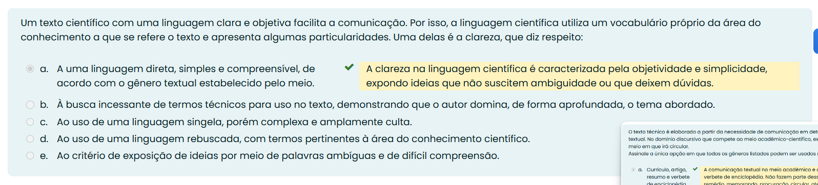 Um texto científico com uma linguagem clara e objetiva facilita a comunicação. Por isso, a linguagem científica utiliza um vocabulário próprio da área do conhecimento a que se refere texto e apresenta algumas particularidades. Uma delas é a clareza, que diz respeito: a. A uma linguagem direta, simples e compreensível, de A clareza na linguagem científica é caracterizada pela objetividade e simplicidade, acordo com gênero textual estabelecido pelo meio. expondo ideias que não suscitem ambiguidade ou que deixem dúvidas. b. À busca incessante de termos técnicos para uso no texto, demonstrando que autor domina, de forma aprofundada, tema abordado. C. Ao uso de uma linguagem singela, porém complexa e amplamente culta. texto técnico é elaborado a partir da necessidade de comunicação em d. Ao uso de uma linguagem rebuscada, com termos pertinentes à área do conhecimento científico. No dominio discursivo que compete do meio ex meio em que irá e. Ao critério de exposição de ideias por meio de palavras ambíguas e de difícil compreensão. Assinale a opção em que todos listados podem ser usados Curriculo, artigo, A comunicação textual no meio e resumo e verbete verbete de enciclopédia. Não fazem parte dess de