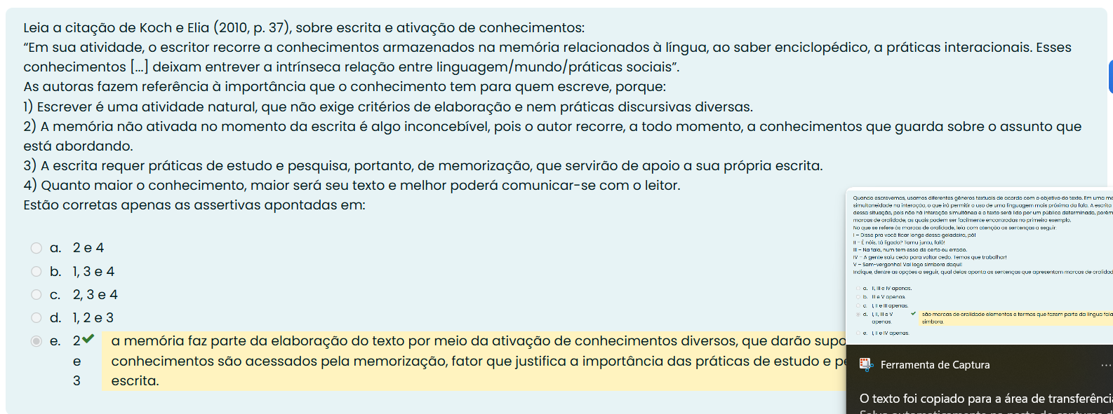 Leia a citação de Koch e Elia (2010, p. 37), sobre escrita e ativação de conhecimentos: "Em sua atividade, escritor recorre a conhecimentos armazenados na memória relacionados à língua, ao saber enciclopédico, a práticas interacionais. Esses conhecimentos [...] deixam entrever a intrínseca relação entre linguagem/mundo/práticas sociais". As autoras fazem referência à importância que O conhecimento tem para quem escreve, porque: 1) Escrever é uma atividade natural, que não exige critérios de elaboração e nem práticas discursivas diversas. 2) A memória não ativada no momento da escrita é algo inconcebível, pois autor recorre, a todo momento, a conhecimentos que guarda sobre assunto que está abordando. 3) A escrita requer práticas de estudo e pesquisa, portanto, de memorização, que servirão de apoio a sua própria escrita. 4) Quanto maior conhecimento, maior será seu texto e melhor poderá comunicar-se com leitor. usamos textuals de com objetivo do texto. Em Estão corretas apenas as assertivas apontadas em: 0 que permitir mois A escrito pois no taxto por um público de quois podem ser primeiro exemplo. que se refere de de com 08 sentenças seguir - pro longo a. - num ou IV A gente que logo b. 1,3e4 opções seguir, qual que C. 2,3e4 d. 1,2e3 que do e. 2 a memória faz parte da elaboração do texto por meio da ativação de conhecimentos diversos, que darão supo e conhecimentos são acessados pela memorização, fator que justifica a importância das práticas de estudo e Ferramenta de Captura 3 escrita. texto foi copiado para a área de