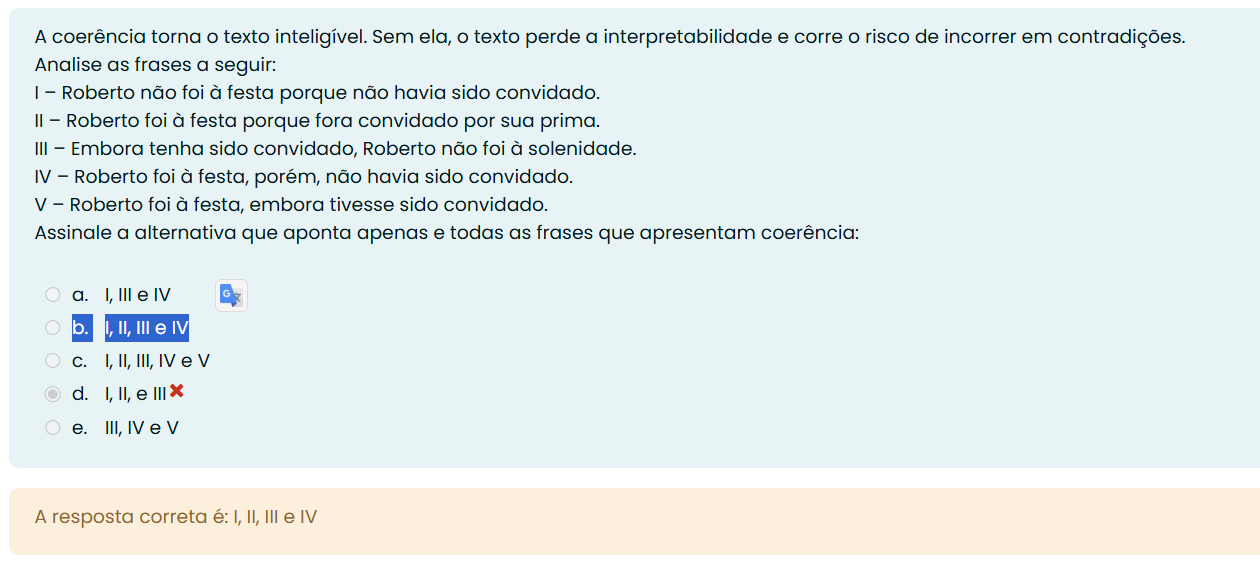 A coerência torna texto inteligível. Sem ela, texto perde a interpretabilidade e corre risco de incorrer em contradições. Analise as frases a seguir: I - Roberto não foi à festa porque não havia sido convidado. II - Roberto foi à festa porque fora convidado por sua prima. III - Embora tenha sido convidado, Roberto não foi à solenidade. IV - Roberto foi à festa, porém, não havia sido convidado. V - Roberto foi à festa, embora tivesse sido convidado. Assinale a alternativa que aponta apenas e todas as frases que apresentam coerência: a. I, III e IV b. C. I, II, III, IV e V d. I, II, e III e. III, IV e V A resposta correta é: I, II, III e IV