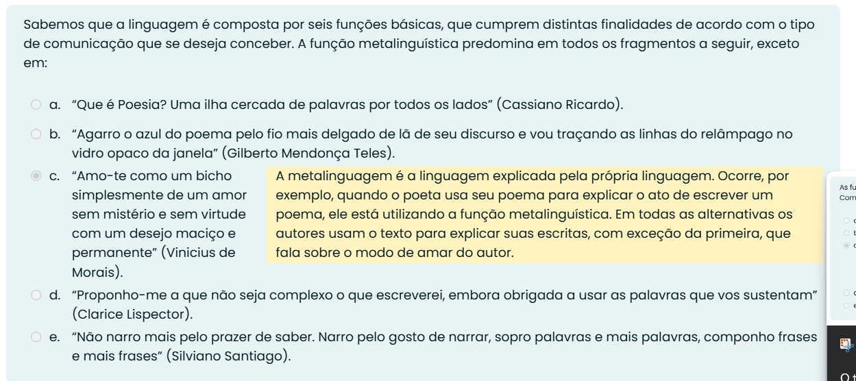 Sabemos que a linguagem é composta por seis funções básicas, que cumprem distintas finalidades de acordo com tipo de comunicação que se deseja conceber. A função metalinguística predomina em todos fragmentos a seguir, exceto em: a. "Que é Poesia? Uma ilha cercada de palavras por todos lados" (Cassiano Ricardo). b. "Agarro azul do poema pelo fio mais delgado de lã de seu discurso e vou traçando as linhas do relâmpago no vidro opaco da janela" (Gilberto Mendonça Teles). C. "Amo-te como um bicho A metalinguagem é a linguagem explicada pela própria linguagem. Ocorre, por As fu simplesmente de um amor exemplo, quando poeta usa seu poema para explicar ato de escrever um Com sem mistério e sem virtude poema, ele está utilizando a função metalinguística. Em todas as alternativas com um desejo maciço e autores usam texto para explicar suas escritas, com exceção da primeira, que permanente" (Vinicius de fala sobre O modo de amar do autor. Morais). d. "Proponho-me a que não seja complexo que escreverei, embora obrigada a usar as palavras que vos sustentam" (Clarice Lispector). e. "Não narro mais pelo prazer de saber. Narro pelo gosto de narrar, sopro palavras e mais palavras, componho frases e mais frases" (Silviano Santiago).