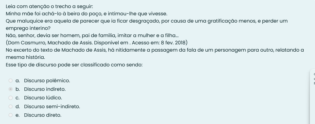 Leia com atenção trecho a seguir: Minha mãe foi achá-lo à beira do poço, e intimou-lhe que vivesse. Que maluquice era aquela de parecer que ia ficar desgraçado, por causa de uma gratificação menos, e perder um emprego interino? Não, senhor, devia ser homem, pai de família, imitar a mulher e a filha... (Dom Casmurro, Machado de Assis. Disponível em Acesso em: 8 fev. 2018) No excerto do texto de Machado de Assis, há nitidamente a passagem da fala de um personagem para outro, relatando a mesma história. Esse tipo de discurso pode ser classificado como sendo: a. Discurso polêmico. b. Discurso indireto. C. Discurso lúdico. d. Discurso semi-indireto. e. Discurso direto.
