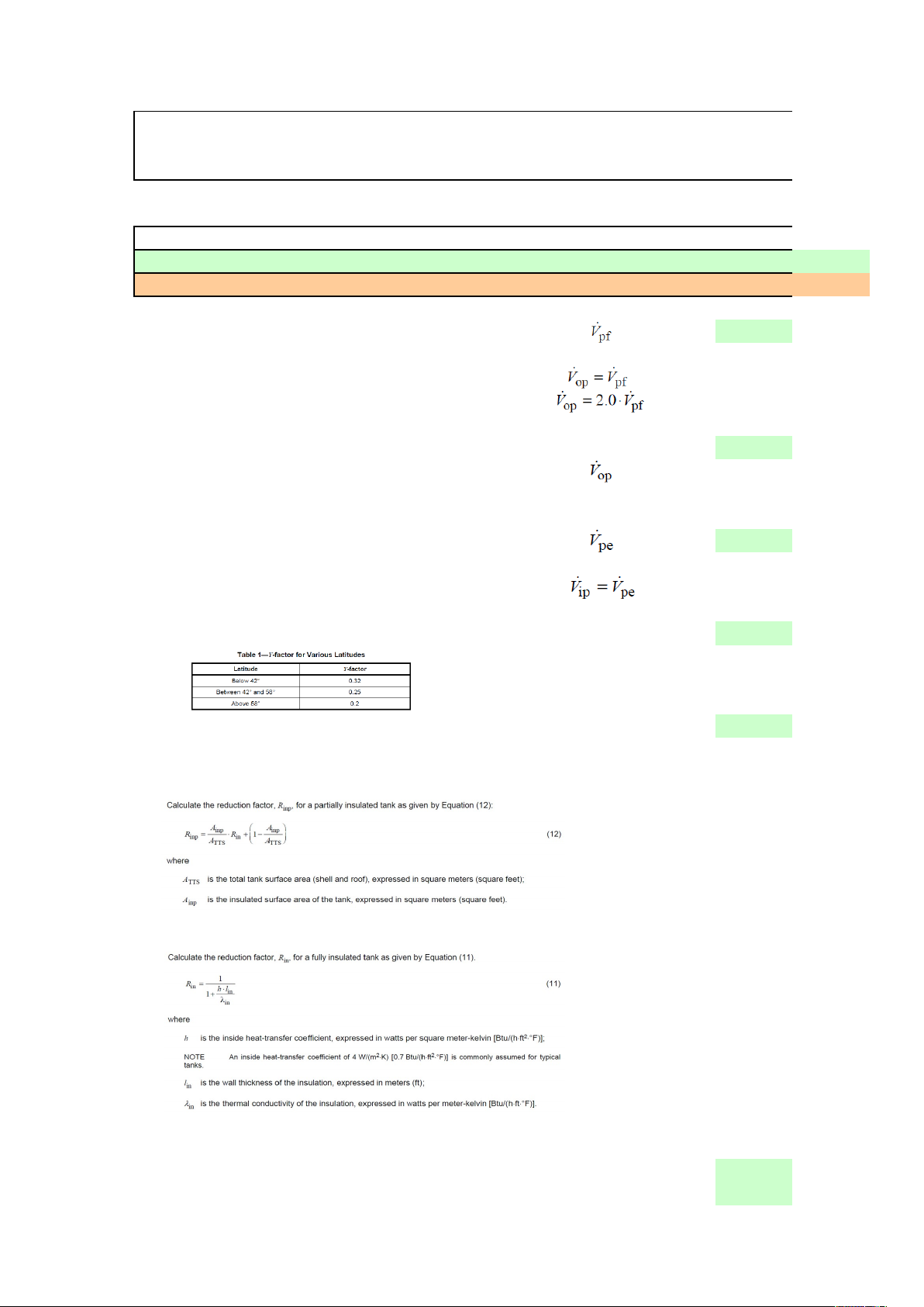 obs: valores calculados estão em vermelho dados do processo e equipamento devem ser preenchidos nas células de cor verde resultados estão nas células de cor laranja Vazão máxima de enchimento do tanque: = 45.1 Vazão de saída no vent (para líquidos não voláteis): = 45.1 Vazão de saída no vent (para líquidos voláteis): = 90.2 Pressão de vapor do líquido é maior que 5 kPa (0,73 psi)? (sim/não) não Vazão de saída no vent devido ao enchimento: = 45.1 líquido não volátil Vazão máxima de esvaziamento do tanque: = 10 Vazão de entrada no vent devido ao esvaziamento: = 10 Fator de Latitude (Ver Table 1): Y = 0.32 Fator de Redução devido a Isolamento Térmico: Ri = 1 Ri = 1, para tanque sem isolamento Ri = Rinp (ver equação 12), para tanque c/ isolamento parcial Ri = Rin (ver equação 11), para tanque com isolamento Altura do Tanque: H = 6.63 Diâmetro do Tanque: D = 3.10 Dimensionamento de Respiro Livre (Free Vent) Para Tanques Atmosféricos Conforme Norma API 2000 7th Ed (2020) Volume do tanque: = 50.04 Vazão de saída no vent devido a ação térmica: = 10.83 Fator de Pressão/Temperatura/Latitude (Ver Table 2): C = 6.5 Vazão de saída no vent devido a ação térmica: = 100.56 Vazão Total de Saída no Vent Vo = Vot + Vop = 55.93 Vazão Total de Entrada no Vent Vi = Vit + Vip = 110.56 Velocidade de Segurança para o Vent 5 Diametro Mínimo p/ Saida do Vent 62.89745 Diametro Mínimo p/ Entrada do Vent 88.43526 Diametro Mínimo Recomendado para o Vent conforme API 2000 88.43526 3.481703 valores calculados estão em vermelho dados do processo e equipamento devem ser preenchidos nas células de cor verde resultados estão nas células de cor laranja m3/h m3/h m3/h m3/h líquido não volátil m3/h m3/h m m Dimensionamento de Respiro Livre (Free Vent) Para Tanques Atmosféricos m3 m3/h m3/h m3/h m3/h m/s mm mm mm in Vdp 45.10 m3/h = 0.75 D 3.10 m H 6.63 m Vdt 0.37 m3/min Vd 1.12 m3/min = 67.29724 Q=V*S Vmax 5.00 m/s S=Q/V 0.00 m2 Dmin 0.07 m Dmin 2.72 in m3/min m3/h Vup 45.10 D 3.10 H 6.63 Vut 2.20 Vu 2.96 Q=V*S V 5.00 S=Q/V 0.01 D 0.112 4.41 m3/h = 0.75 m3/min m m m3/min m3/min = 177.32 m3/h m/s m2 m in API 2000 DIN 4119 outbreathing DIN 4119 inbreathing