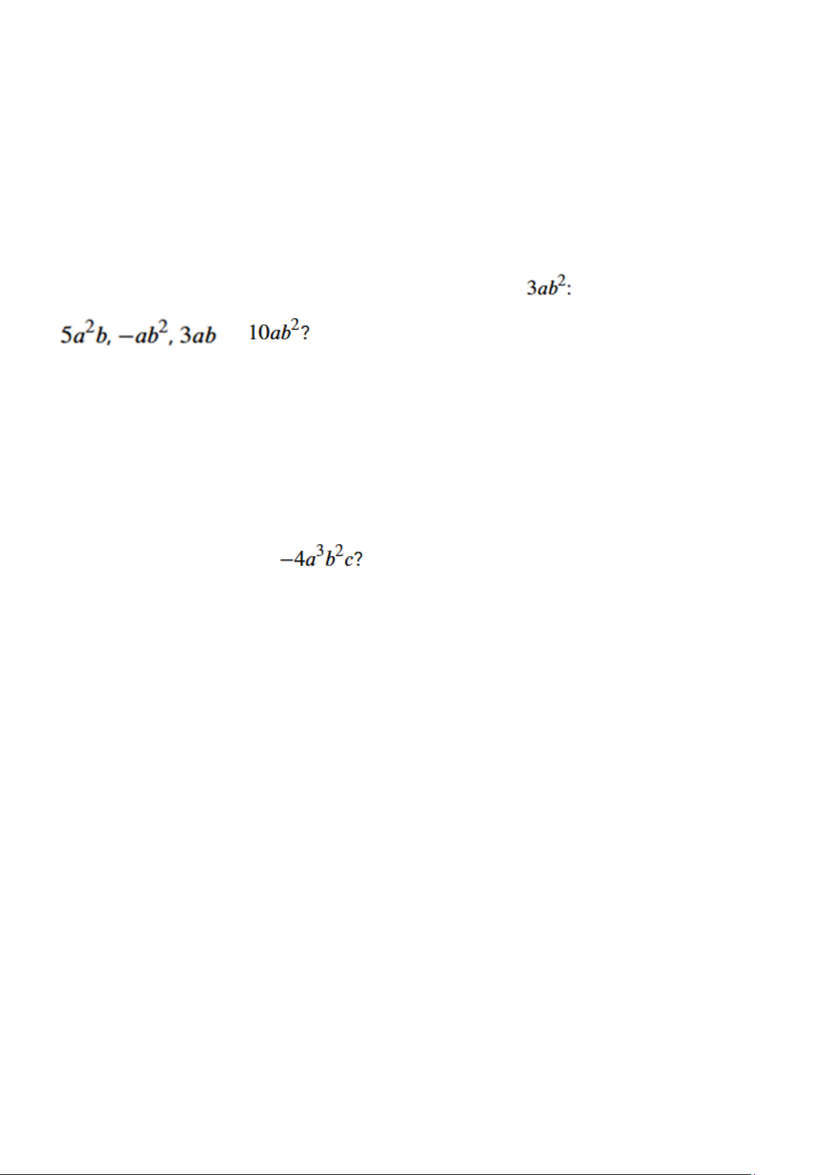 MATEMÁTICA – 8º ANO MÔNOMIOS E POLINÔMIOS 1) Identifique o coeficiente e a parte literal do monômio -15x4y2. 2) Quais dos seguintes monômios são semelhantes ao monômio ou 3) Determine o grau do monômio 7x6. 4) Qual é o grau do monômio 5) Classifique a expressão algébrica 3x2-5, como monômio, binômio ou trinômio. 6) Determine o grau do polinômio 2x3-5x4+x-10. 7) Efetue a soma dos monômios semelhantes: 12xy + 5xy – 8xy. 8) Reduza o seguinte polinômio agrupando os termos semelhantes: 8x2-3x+2x2+7x. 9) Dados os polinômios A = 5x + 3 e B = 2x – 4, calcule o valor de A + B. 10) Qual é o grau do polinômio 3x2y2+5x3y-2? 11) Reduza o polinômio 4a2b+2ab2-a2b+5ab2. 13. 14. 15. 16. 32. 33. 34.