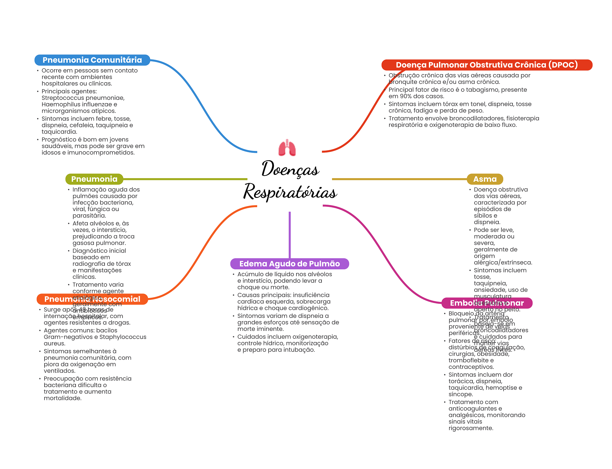 Pneumonia Comunitária Doença Pulmonar Obstrutiva Crônica (DPOC) Ocorre em pessoas sem contato recente com ambientes Obstrução crônica das vias aéreas causada por hospitalares ou clínicas. bronquite crônica e/ou asma crônica. Principais agentes: Principal fator de risco é tabagismo, presente Streptococcus pneumoniae, em 90% dos casos. Haemophilus influenzae e Sintomas incluem tórax em tonel, dispneia, tosse microrganismos atípicos. crônica, fadiga e perda de peso. Sintomas incluem febre, tosse, Tratamento envolve broncodilatadores, fisioterapia dispneia, cefaleia, taquipneia e e oxigenoterapia de baixo fluxo. taquicardia. Prognóstico é bom em jovens saudáveis, mas pode ser grave em idosos e imunocomprometidos. Doenças Pneumonia Asma Inflamação aguda dos pulmões causada por Respiratórias Doença obstrutiva das vias aéreas, infecção bacteriana, caracterizada por viral, fúngica ou episódios de parasitária. sibilos e Afeta alvéolos e, às dispneia. vezes, interstício, Pode ser leve, prejudicando a troca moderada ou gasosa pulmonar. severa, Diagnóstico inicial geralmente de baseado em origem radiografia de tórax Edema Agudo de Pulmão alérgica/extrínseca. e manifestações Sintomas incluem clínicas. Acúmulo de líquido nos alvéolos tosse, e interstício, podendo levar a Tratamento varia taquipneia, choque ou morte. conforme agente ansiedade, uso de Nosocomial Causas principais: insuficiência musculatura com cardíaca esquerda, sobrecarga Embolia Surge hídrica e choque cardiogênico. aperto no peito. com Sintomas variam de dispneia a Bloqueio da agentes resistentes a drogas. grandes esforços até sensação de morte iminente. provenie de se em Agentes comuns: bacilos periféricas oncodilatadores Gram-negativos e Staphylococcus Cuidados incluem oxigenoterapia, e cuidados para aureus. controle hídrico, monitorização Fatores vias Sintomas semelhantes à e preparo para intubação. cirurgias, obesidade, pneumonia comunitária, com tromboflebite e piora da oxigenação em contraceptivos. ventilados. Sintomas incluem dor Preocupação com resistência torácica, dispneia, bacteriana dificulta taquicardia, hemoptise e tratamento e aumenta síncope. mortalidade. Tratamento com anticoagulantes e analgésicos, monitorando sinais vitais rigorosamente.