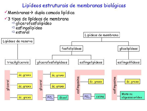 Lipídeos Definição: substâncias oleosas ou gordurosas insolúveis em água e solúveis em solventes apolares. Usualmente, possuem ácidos graxos em sua estrutura. Importância: São reservas energéticas – tecido adiposo – e podem ser usados como combustível biológico importante. OBS: se ocorrer acúmulo de lipídeos na região abdominal = gordura visceral, resistência à insulina. Podem funcionar como hormônios – colesterol (produz substâncias importantes para o organismo) é semelhante aos lipídeos. Composição das membranas celulares Classificação dos Lipídeos Lipídeos Simples / Armazenamento : incluem as gorduras saturadas , gorduras insaturadas e as ceras. As gorduras representam nossa maior reserva energética. Triacilglicerol/ triglicerídeos Principal função é reservatório de energia. Lipídeos Complexos/ Membrana : compreendem os fosfolipídeos, se dividem em Glicerofosfolipídeos e Esfingolipídeos. Glicerofosfolipídios: composto que contém dois ácidos graxos ligados ao glicerol e um grupamento fosfato ligado à sua terceira posição esterificavél. Presença de uma extremidade polar, na qual o grupo fosfato esta presente e outra apolar, composta pela cadeia carbônica. As porções carboidrato desses lipídios determinam o tipo sanguíneo. Esfingolipídios: possui um amino-álcool chamado esfingosina como cadeia base unida a uma molécula de ácido graxo e um grupo cabeça polar que pode ser um grupo fosfato ou um açúcar, por ligações fosfodiéster ou glicosídica respectivamente. Principal função é constituir membranas plasmáticas. Ácido Graxo – cadeias hidrocarbonadas apolares, não ramificadas. Pode ter de 4 a 24 C e a cadeia pode ser saturada ou insaturada, ou seja, apenas ligação simples ou apenas ligação duplas. Hidrogênio ligado a carbono não consegue reagir com água. A maioria dos lipídeos não consegue misturar com a água porque tem uma cauda de hidrocarboneto, referente ao ácido graxo. A principal diferença entre óleo e gordura está na cadeia do ácido graxo. Se a cadeia for saturada é gordura, se for instaurada é óleo. Tipos de Ácido Graxo ( ácido graxo é sintetizado de 2 em 2 C) Saturados – ligação simples Insaturados – ligação dupla Pode se dividir em : monoinsaturado, tem uma ligação dupla e polinsaturado tem mais de uma ligação dupla. Alimentos que possuem gordura saturada têm mais risco A ingestão de gordura mono ou polinsaturada ( óleos) deve ser estimulada. Ácido Graxo insaturado tem menor PF (ponto de fusão), sendo líquido em temperatura ambiente. Exceções : Óleo de coco e dendê. Se a gordura tiver ácidos graxos saturados, ela será sólida. Óleo de Coco é saturado, mas é líquido à temperatura ambiente, pois sua cadeia é bem curta e quanto menor a cadeia, menor o ponto de fusão. Gorduras têm relação direta com as doenças cardiovasculares. Gorduras saturadas têm maior organização, possibilitando a solidez. Tirando o óleo de coco e o dendê, os ácidos graxos saturados estão associados ao colesterol, pois são de origem animal. Vegetal não possui colesterol. Os Ácidos Graxos são divididos em essenciais e não essenciais. Os essenciais são aqueles que não conseguimos produzir e por isso devem ser adquiridos por meio da alimentação: Ácido Linoleico ou Araquidônico =ômega 6 Ácido alfa-Linolênico = ômega 3 A instauração na cadeia de carbono dos ácidos graxos existe na forma CIS. Conversão de lipídeo líquido em sólido – Hidrogenação Transformação das duplas ligações existentes entre os átomos de carbono que constituem a cadeia de um ácido graxo insaturado em ligações simples (C-C) . Essa transformação se deve à inserção de átomo de H em cada um dos carbonos da dupla ligação. Transforma o óleo de insaturado para saturado. É muito utilizado para frituras, pois aguenta mais temperatura e pode ser usado durante mais tempo, no entanto, é negativo para a saúde, pois aumenta a incidência de doenças cardiovasculares. Lipídeos de Armazenamento – triacilglicerol, triglicérides = 3 ácidos graxos ligados no glicerol Lipídeos de Membrana – 1 cabeça e 2 caudas ( uma saturada e outra insaturada) Fosfolipídeos na membrana adquirem uma característica anfipática, a cabeça é polar e suas duas caudas são hidrofóbicas. Compostos semelhantes a lipídeos: Colesterol Vitamina D – hormônio, controla absorção de cálcio Vitamina E Vitamina A – absorvida no intestino delgado