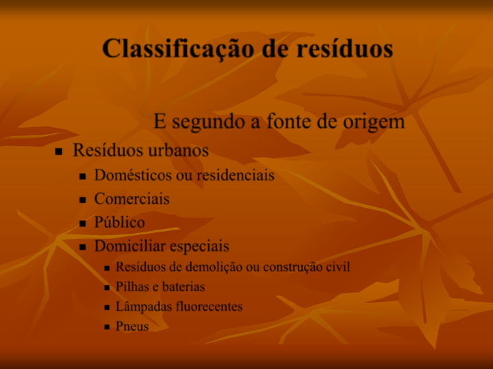 E segundo a fonte de origem Resíduos urbanos Domésticos ou residenciais Comerciais Público Domiciliar especiais Resíduos de demolição ou construção civil Pilhas e baterias Lâmpadas fluorecentes Pneus Classificação de resíduos E segundo a fonte de origem FONTES ESPECIAIS Resíduos agrícolas; Indústria; Resíduos industriais; Resíduos de serviços da saúde Resíduos de portos, aeroportos e terminais rodo- ferroviários; Resíduos de sistemas de tratamento; Resíduos radioativos. Classificação de resíduos E segundo a NBR 10.004 Resíduos de classe I - Perigosos Resíduos de classe II – Não Perigoso Resíduos de classe IIa – Não Inertes Resíduos de classe IIb – Inertes Classificação de resíduos Critério de classificação dos resíduos Critério de classificação Classes Tipo de critério Capacidade de produção de composto Matéria orgânica, matéria inorgânica De destino Origem, fonte e local de produção. Comercial, especial, hospitalar ou contaminado, industrial, industrial não perigoso, público (de varrição), radioativo, residencial, doméstico, Domiciliar rural urbano De origem Tratabilidade Biodegradável, descartável, reciclável De destino Economia Aproveitável como matéria prima, aproveitável para produção de composto, inaproveitável, recuperável De destino Grau de biodegradabilidade Facilmente degradável, moderadamente degradável, dificilmente degradável, não degradável De destino Incineração Combustível, incombustível De destino Índice de recuperação energética Materiais de reutilização direta ou alto índice de recuperação energética, materiais de reutilização indireta ou médio índice de recuperação energética De destino Natureza dos serviços de limpeza pública Domiciliar, especial, público De origem Padrão de vida na fonte produtora De classe alta, de classe média, de classe baixa De origem Ponto de vista sanitário Inerte, orgânico De destino Fonte: Adaptação SARTORI (2000). Dinâmica do processo de classificação Classificar: segundo Aurélio, significa distinguir em classes ou categorias. Ordenar, agrupar segundo determinado método ou critérios. A norma brasileira atual, por exemplo, agrupa ou ordena os resíduos com características de periculosidade na classe I e os de características de não-perigoso, nas classes II e III. Normalmente, o processo de classificação agrupa resíduos com “características” semelhantes. Dinâmica do processo de classificação Caracterizar: segundo Ferreira (1999), caracterizar significa “pôr em evidência o caráter de individualizar, distinguir. Referir a um traço peculiar”. As normas classificam os resíduos segundo características específicas, por exemplo, como àquelas relacionadas ao comportamento mediante o teste de solubilidade (resíduo inerte ou não inerte), os resíduos com características de inflamabilidade, corrosividade ou toxicidade são denominados como perigosos. Dinâmica do processo de classificação Identificar: reconhecimento de coisa ou próprio. Comprovar a própria identidade. Tomar o caráter de adquirir afinidade com. As normas recomendam ensaios ou métodos de testes, considerados como instrumentos para identificação dos resíduos conforme uma característica específica. Através desses testes, comprova-se a identidade do resíduo (ex: o método de ensaio de ponto de fulgor - NBR 14.598 - é utilizado para identificação de resíduos que possuem características de inflamabilidade). Neste caso, a identidade investigada é a carcterística de inflamabilidade e o instrumento utilizado para identificação é a NBR 14.598. Aplicação dos conceitos à norma brasileira NBR 10.004 Classificação Denominaç ão Características Identificação Classe I Perigoso Inflamabilidade Corrosividade Reatividade Toxicidade Patogenicidade Métodos NBR 14.598 Medição do pH Teste de reatividade a cianetos e sulfetos Teste de lixiviação Classe II Não- perigos o Solubilidade NBR 10.006 Classe II A Inerte idem Idem Classe II B Não Inerte idem Idem Dinâmica do Processo de classifiação CARACTERIZAÇÃO IDENTIFICAÇÃO CLASSIFICAÇÃO RESÍDUOS Definição de propriedades e características de interesse a ser investigada. Ex.: ponto de fulgor, poder calorífico etc. Feito através do uso de métodos de testes padronizados ou através de listagens. Os procedimenos são adotados de acordo com a(s) característica(s) peculiar(es) a ser investigada. Ex.: Ponto de fulgor (ISO 1523, ASTM D93, NBR 14598) Depende de critérios determinados Ex.: NBR 10004 - Classe I, II, III (critério de periculosidade) Lei Francesa 30 de dez. de 2002 - Resíduos últimos e não- últimos. (critério de tratabilidade e sanitários) BASE DE REFERÊNCIAS DE NORMAS E REGULAMENTOS Origem Especificação (Referencia) Fundamento Identificação dos resíduos Brasil NBR 10.004(1) 1. Perigo 2. Origem 3. Características 4. Natureza 5. Consumo Lista de resíduos sólidos para fontes não especificadas; Lista de resíduos sólidos para fontes especificadas; Lista de constituintes perigosos; Lista de substâncias que conferem periculosidade; Lista de substâncias agudamente tóxicas; Lista de substâncias tóxicas; Provas normalizadas para determinação de teores de substâncias orgânica e inorgânica (SW 846); Teste de lixiviação para avaliação da toxidade. EUA EPA (40 CFR 261)(2) 1. Perigo 2. Origem 3. Características 4. Natureza 5. Consumo Lista de resíduos sólidos para fontes não especificadas; Lista de resíduos sólidos para fontes especificadas; Lista de constituintes perigosos; Lista de substâncias que conferem periculosidade; Lista de substâncias agudamente tóxicas; Lista de substâncias tóxicas; Provas normalizadas para determinação de teores de substâncias orgânica e inorgânica (SW 846); TCLP – Toxidade. CEE Diretiva 75/442/CEE(3) relativa aos resíduos Diretiva 91/689/CEE(4) relativa aos resíduos perigosos 1. Perigo 2. Origem 3.