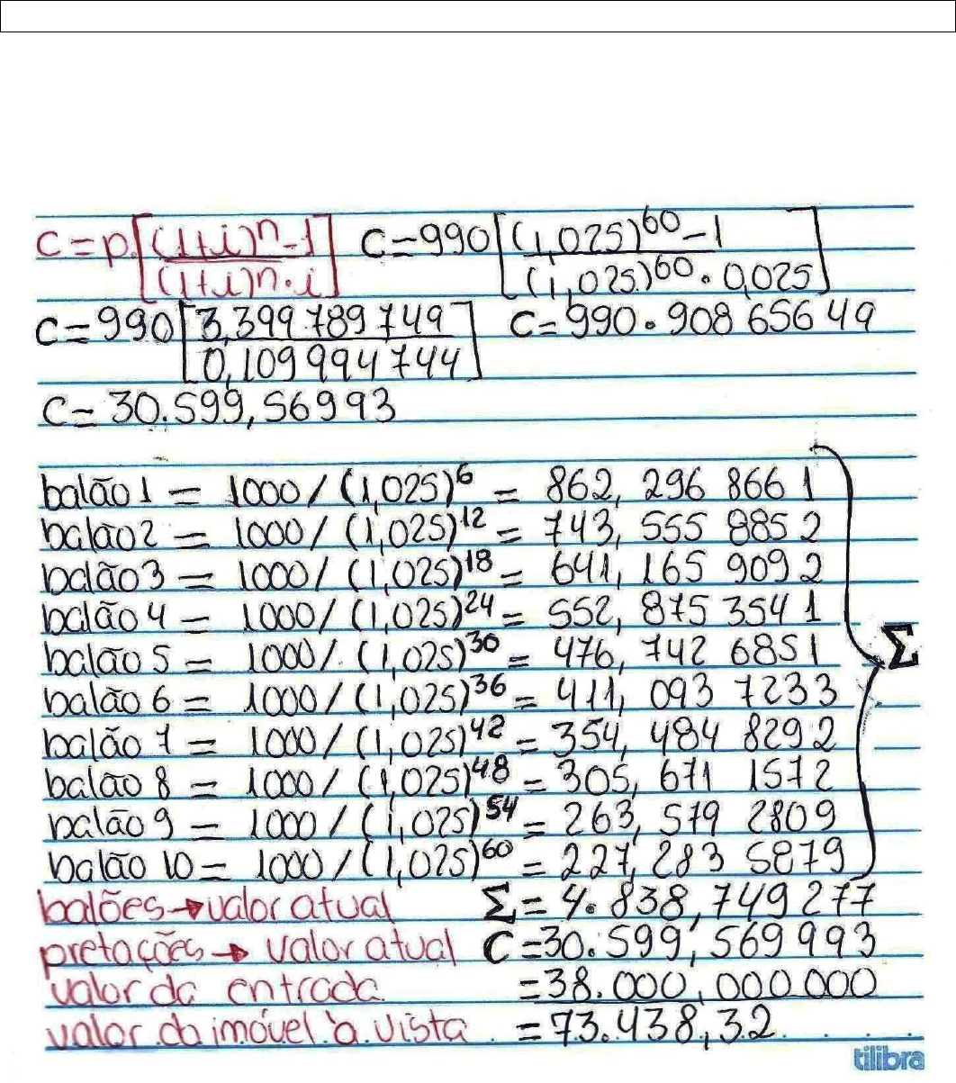 UNINTER – Matemática Financeira Aplicada – 1ª edição 2013 Nelson Pereira Castanheira e Luiz Roberto Dias de Macedo. Exercício 12, página 116 RENDAS – FINANCIAMENTO COM “BALÕES” Uma construtora vende um apartamento por R$38.000,00 de entrada e o restante em 60 prestações mensais fixas de R$990,00 e com dez “balões” de R$1.000,00 a cada seis meses, sendo o primeiro “balão” no sexto mês do contrato. Considerando a taxa de juro de 2,5% a.m., determine qual é o valor desse imóvel à vista? Podemos também calcular a segunda parte do exercício, transformando a taxa de mensal para semestral, e assim podemos trazer os valores dos “balões“ para o valor atual através da Fórmula Básica de Rendas. Nas duas resoluções, houve uma pequena diferença no valor dos centavos em relação ao gabarito do livro, mas isto se deve ao tipo de calculadora e também ao método usado no desenvolvimento do cálculo.