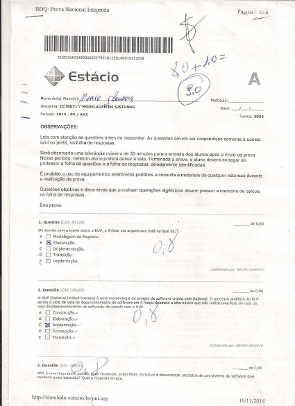 13/06/13 Visualizar Prova bquestoes.estacio.br/provas_visualizacao.asp?modo_p=0&gera_prova=sim&cod_prova=2318331&tipo=0&aleatorio=0# 1/6 000231833199008207999301218999913062013 Nome do(a) aluno(a):__________________________________________________________ Matrícula:____________ Disciplina: CCT0071 / MODELAGEM DE SISTEMAS _____________________________ Data: ___ /___ /______ OBSERVAÇÕES: Leia com atenção as questões antes de responder. As questões devem ser respondidas somente à caneta azul ou preta, na folha de respostas. As questões da prova totalizam 8 pontos. A forma de atribuição dos dois pontos restantes para a nota de AV2, ficará a cargo de cada docente, respeitando o regulamento de provas (Portaria D.E 01/2013). Será observada uma tolerância máxima de 30 minutos para a entrada dos alunos. Neste intervalo nenhum aluno poderá deixar a sala. Terminando a prova, o aluno deverá entregar ao professor a folha de questões e a folha de respostas, devidamente identificadas. Boa prova. 1. Questão (Cód.:77453) (sem.:4a) _______ de 1,00 Uma livraria disponibiliza livros de várias editoras para venda aos clientes, que podem comprar quantos desejar em um mesmo pedido. A livraria compra da editora muitos exemplares de mesmo título e autoria. Analisando o cenário apresentado indique qual modelo representa a situação. A B 13/06/13 Visualizar Prova bquestoes.estacio.br/provas_visualizacao.asp?modo_p=0&gera_prova=sim&cod_prova=2318331&tipo=0&aleatorio=0# 2/6 Resposta: Considere em linhas gerais o seguinte diagrama. Não devem ser desprezadas algumas diferenças em função de interpretação. C D E 2. Questão (Cód.:72440) (sem.:3a) _______ de 2,00 Considerando o estudo de caso descrito abaixo, desenvolva o Diagrama de Caso de Uso coorespondente. Consultório Médico Um dentista deseja informatizar seu consultório para melhorar o atendimento aos seus clientes e possuir um maior controle. A secretária agenda a consulta para a data e hora desejada pelo cliente e registra seus dados para controle. Cada cliente deve possuir um histórico de atendimentos, que será consultado pelo dentista na consulta. O dentista registra os procedimentos aplicados no paciente. O dentista tem acesso a agenda para chamada de seus pacientes que se encontram na sala de recepção. O custo do atendimento é calculado a partir dos procedimentos registrados pelo dentista. A definição do pagamento é realizada pela secretária na saída do paciente. O recebimento pode ser feito por convênio ou a vista. Atendimentos que requerem autorização são realizados em outra seção, onde já terá a autorização do convênio. O cliente poderá desmarcar e remarcar consulta. Ao final do mês o dentista verifica os valores faturados e retira uma estatística de procedimentos realizados e a secretária emite as guias de atendimentos, que são enviadas para os convênios. 13/06/13 Visualizar Prova bquestoes.estacio.br/provas_visualizacao.asp?modo_p=0&gera_prova=sim&cod_prova=2318331&tipo=0&aleatorio=0# 3/6 3. Questão (Cód.:55482) (sem.:12a) _______ de 0,50 Qual diagrama exibe a forma que um objeto executa suas ações em um único processo, representando-os passo a passo, isto é, seu fluxo? A Estados. B Sequencias. C Casos de usos. D Classes. E Atividades. 4. Questão (Cód.:77460) (sem.:5a) _______ de 0,50 Analise o modelo abaixo e interprete as regras definidas através das ligações dos objetos. I - O hotel guarda informações de Hóspedes mesmo que não tenha se hospedado. II - Hóspede pode usar quantos serviços desejar, por cada hospedagem. III - São representados 3 tipos de serviços: Copa, Lavanderia e Telefonia. IV - A cada hospedagem é aberta uma nova conta corrente. Marque a opção que indica as sentenças VERDADEIRAS. 13/06/13 Visualizar Prova bquestoes.estacio.br/provas_visualizacao.asp?modo_p=0&gera_prova=sim&cod_prova=2318331&tipo=0&aleatorio=0# 4/6 A II - III - IV B I- III - IV C I- II - IV D II - III E I - IV 5. Questão (Cód.:57382) (sem.:5a) _______ de 1,00 Considere Diagrama de Classes acima. Pode-se afirmar que: A instâncias da classe quadrado não possuem atributos. B quadrado e retângulo são classes base da classe figura. C quadrado e retângulo são classes abstratas. D largura é um método da classe Retângulo. E quadrado é uma classe derivada da classe figura. 6. Questão (Cód.:77782) (sem.:3a) _______ de 0,50 Considerando que você é um analista de negócio e está desenvolvendo um sistema de materiais e ocorre que: quando da movimentação de materiais surge uma exceção, que é a emissão de ordem de compra quando o estoque ficar abaixo do mínimo recomendado. Assim, a representação dessa situação no Diagrama de Caso de Uso é um relacionamento de ........... . A associação composta. B associação não composta. C generalização. D dependência estereotipado como inclusão. E dependência estereotipado como extensão 7. Questão (Cód.:77450) (sem.:4a) _______ de 0,50 Em um restaurante a escolha dos pratos pode ser efetivada a partir da constituição calórica dos alimentos. Para 13/06/13 Visualizar Prova bquestoes.estacio.br/provas_visualizacao.asp?modo_p=0&gera_prova=sim&cod_prova=2318331&tipo=0&aleatorio=0# 5/6 isso, o restaurante mantém vários pratos, discriminando os ingredientes e definindo a cada um a porção calórica. A todo prato escolhido é calculado o valor calórico e apresentado ao cliente antes da escolha. Se você fosse desenvolver um sistema para o restaurante conceitualmente o que seria alimento, valor calórico e o cálculo, respectivamente? A classe - atributo - método B atributo - classe - método C classe - atributo - processo D atributo - classe - processo E tupla - tabela - método 8. Questão (Cód.:77454) (sem.:4a) _______ de 0,50 Em uma academia de ginástica os alunos, a cada contrato efetivado, escolhem o plano de sua preferência a partir da composição dos exercícios que melhor lhe convier. O preço da mensalidade é 