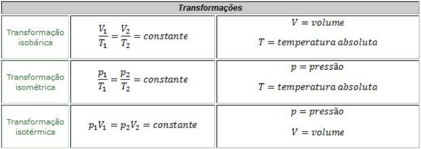 A hipótese atômica diz que a matéria é constituída de átomos. Quando uma panela de pressão com ar dentro é fechada, e coloca-se fogo nela, fornece-se energia térmica às moléculas. Assim, as moléculas começam a se agitar com maior velocidade, e quanto mais rapidamente se agitam, mais provocam um aumento de temperatura. Elas também se chocam com maior intensidade contra as paredes da panela, causando um aumento da pressão. Conforme o calor é fornecido, a pressão aumenta até ser possível levantar a válvula de segurança. Assim, o gás começa a escapar pela válvula. Isso ocorre porque a pressão externa à panela é menor do que a pressão no seu interior, o que permite que o gás escape da panela, impedindo que a pressão aumente ainda mais. A pressão é diretamente proporcional à temperatura. Se o gás se expande em temperatura constante, a pressão diminui. Enquanto isso, o volume do gás é inversamente proporcional à pressão. Ainda, a pressão também é diretamente proporcional à quantidade de moléculas presentes num determinado volume de gás. Confira algumas fórmulas de transformações gasosas a seguir: Um mol de qualquer gás contem este número de moléculas de gás: 6,02 x 10²³. Este valor é chamado de número de Avogadro, e esta unidade serve para representar o número de moléculas de gás de forma simples. Existe um outro tipo de transformação gasosa, que é chamada de transformação adiabática (imagem a seguir). Nesse caso, a transformação ocorre quando o gás sai do seu estado inicial e vai para seu estado final sem que haja uma troca de calor com o ambiente que o cerca. Se o gás, quando recebe calor, expande, quer dizer que ele pode realizar trabalho; o gás recebe calor, e esse calor é transmitido às suas moléculas, aumentando as suas velocidades. O trabalho a ser realizado pode levantar objetos, como a válvula de segurança da panela de pressão. Existe uma equivalência entre o trabalho mecânico e a energia térmica. A quantidade de energia térmica é igual à soma da energia interna do gás e do trabalho que ele realiza. Essa é a primeira lei da termodinâmica (imagem a seguir). Essa equação demonstra que o calor cedido a um gás é usado, em parte, para aumentar a energia interna desse gás e, em parte, para realizar trabalho. De acordo com a segunda lei da termodinâmica, existe um limite na energia fornecida, na forma de calor, para a realização de um trabalho. Toda a realização de um trabalho pode gerar energia na forma de calor, mas nem todo calor pode ser utilizado para realização de um trabalho. Uma parte dessa energia se desprende de forma irreversível. A esta segunda lei está associado o conceito de entropia, que determina se uma transformação gasosa é reversível ou irreversível. A melhor situação de rendimento de uma máquina térmica é aquele em que a razão entre o calor que entra e o calor que sai é bem pequena. Aí sim quase todo calor cedido pela fonte quente irá se transformar em trabalho. Sendo assim, seriam necessárias duas fontes térmicas, com temperaturas bem diferentes, para aumentar o rendimento de uma máquina térmica. Essa é uma das consequências da segunda lei da termodinâmica, aplicada à construção das máquinas térmicas, o que significa o estabelecimento de uma fonte quente e de uma fonte fria para que se consiga obter trabalho na máquina. A quantidade de calor cedida pela fonte quente é diretamente proporcional à sua temperatura, assim como a temperatura da fonte fria é diretamente proporcional à quantidade de calor recebida por ela ao fim da transformação. Ou seja, a razão entre o calor cedido pela fonte quente e o calor recebido pela fonte fria é igual à razão entre as suas temperaturas. Isso provém do físico Sadi Carnot, que viveu entre os séculos 18 e 19. A seguir, as fórmulas, incluindo o rendimento de uma máquina térmica: