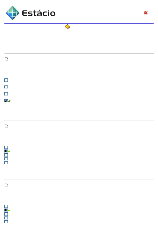 Fechar FISIOLOGIA HUMANA Simulado: SDE0097_SM_201502264854 V.1 Aluno(a): JULIANA OLIVEIRA SILVA Matrícula: 201502264854 Desempenho: 0,5 de 0,5 Data: 14/04/2016 17:03:52 (Finalizada) 1a Questão (Ref.: 201502889418) Pontos: 0,1 / 0,1 A ingestão diária de leite pode causar perturbações digestivas em milhões de brasileiros que apresentam intolerância a esse alimento, a qual é provocada pela deficiência de lactase no adulto, uma condição determinada geneticamente e de prevalência significativa no Brasil. "CIÊNCIA HOJE", v. 26, n. 152, ago. 1999, p. 49. [Adaptado]. Tendo em vista o tema apresentado acima, é INCORRETO afirmar: b) A lactase, assim como outras enzimas, tem sua atividade influenciada por diversos fatores, tais como a temperatura e o pH. d) O efeito simultâneo da desnutrição e das infecções intestinais pode resultar em deficiência secundária de lactase, aumentando ainda mais o número de pessoas com intolerância à lactose. a) A lactose, presente no leite, bem como outros carboidratos de origem animal representam uma importante fonte de energia na dieta humana. c) A lactase é uma enzima que age sobre a lactose, quebrando-a em duas moléculas, sendo uma de maltose e outra de galactose. 2a Questão (Ref.: 201502877560) Pontos: 0,1 / 0,1 Um indivíduo sofreu um acidente de veículo e durante o ocorrido, um pedaço de ferragem ficou alocado na sua cervical. Após dias em estado grave em uma UTI Sr. Tibúrcio observa que perdeu parte dos movimentos. Após 1 ano com restrições de movimento Sr. Tibúrcio após ter sido submetido a uma cirurgia, recuperou todos os seus movimentos. Muito provavelmente o que ocorreu com ele foi: Ocorreu a utilização de células tronco, uma técnica a qual atualmente tem gerado bastante sucesso. Provavelmente ele tinha apenas uma compressão medular Transtorno psicológico (trauma) Lesão parcial Lesão total de medula 3a Questão (Ref.: 201503005458) Pontos: 0,1 / 0,1 Os impulsos nervosos, provenientes de fibras nervosas do ramo (D1) do sistema nervoso autônomo, inibem os batimentos do coração humano através da liberação de um neurotransmissor (M) nas junções neuromusculares. Por outro lado, impulsos provenientes de fibras de outra divisão (D2) do mesmo sistema nervoso aceleram os batimentos cardíacos. Neste texto, D1, D2 e M correspondem aos seguintes termos: D1= simpático, D2= parassimpático, M= noradrenalina D1= parassimpático, D2= simpático, M= acetilcolina D1= simpático, D2= passimpático, M= acetilcolina D1=parassimpático, D2= simpático, M= noradrenalina D1= simpático, D2= parassimpático, M= colinesterase 4a Questão (Ref.: 201502990661) Pontos: 0,1 / 0,1 As ondas QRS do eletrocardiograma siginifica: Polarização do átrio Polarização do ventrículo Despolarização do ventrículo Despolarização do átrio N.R.A. 5a Questão (Ref.: 201502351864) Pontos: 0,1 / 0,1 Sabe-se que a deficiência na produção de serotonina pode ser uma das causas do estado depressivo dos adolescentes, conforme indicam pesquisas no campo da psiquiatria. Esta substância é um neurotransmissor, sendo liberada na seguinte região do neurônio, para que o impulso nervoso se propague: terminal sináptico do axônio. nódulo de ranvier do axônio. corpo celular do axônio. vesículas sinápticas. bainha de mielina do axônio.