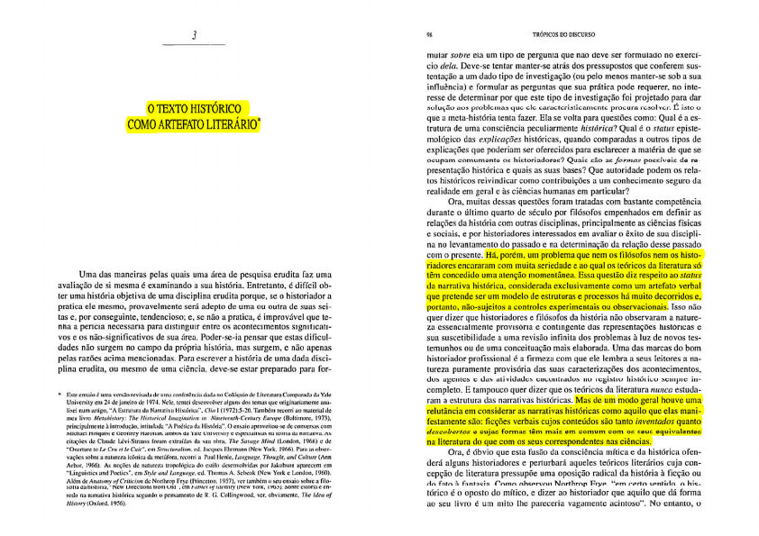 98 'IT~P~cos DO DISCURSO O TEXTO HIST~RICO COMO ARTEFATO LITERÁRIO* Uma das maneiras pelas quais uma hrea de pesquisa erudita faz uma avaliaç50 de si mesma 6 examinando a sua história. Entretanto. t! diflcil o b ter uma histdria objetiva de urna disciplina erudita porque, se o historiador a pratica ele mesmo, provavelmente sed adepto de uma ou outra de suas sei- tas e, por conseguinte, tendencioso; e, se nao a pratica, é improvUvcl que te- nha si perfcin necessitria para distinguir entre os acontecimentos significati- vos e os não-significativos de sua drea. Poder-se-ia pensar que estas dificul- dades náo surgem no campo da prirpria histdria, mns surgem. e náo apenas pelas razões acima mencionadas. Para escrever a hist6ria de uma dada disci- plina erudita, ou mesmo de urna cicnciri, deve-se estar preparado para for- * Fsm ensdn C lima wmiio reviradai & um;) mnkrênci;idndu nn Cnlóquio de Lircmtun Con>pnnida diYale Univirxity em 24 de jnneirn de 1974. Plelc. tentei Jewnvnlucr ulguns doa temas qqiie originorinmcnie mn- 1ir;ei num iutipn. "A Ea~ruturo &I h'urrativii HisiiTricii". cli~~ 1 (19721:s-20. %imMm miem rio mtenul <Ir nitu livm M~ruk i .n r i~ : nte //i.~tr~ffcuI Imuginutir~~i in Ninrtccnrk-Cçniury E18m1pc (Dallimore, 1Q73). principnlmcnie ii iniíoduç3n. intituluda "A Pdticb &i Hisidrh". O cnsda upmvciiou-se de convemar com hiiclml Hnlquisi c GmRiry IIartman. í m h du Yafe University e cspeciatinrsâ na twriudu mutiva. As eimçlrt di? Cluudr Mui-Susuar Inrdn exwifdas sun ohrii. Tke .iIiiadgc Minti Ilx>ndun. 1966) e de "O~rnum to Ir Cm rri Ic CII~I". cm .'iimciirrtrli,~m. ed. Jticqiics Fhrmnn (New York. 19M). Para us ohwr- vaqòes aobrc a nniurc7;i icttnicn &i mri8tnra. recorri a h u l t3enh. I~ tn~ i t ug r , Tt8ougki. und Culrurc (Ann Arbric* 1966)). As m>~8cs de nntum7u trnpolhgiç;~ do d l o dcsenvolvidu~ por Inknhmn iipnrecern cm "Linguisticn und Pactjcu". cm Sc-c rincl lrtn#ungr. cd. T i i nm A. Scbeak INcw Ynrk r tondun. 19M)). Alfin & Anurnm.v tfCrilEci.vm de Nanhmp Frye (lyrincunn. 1957). ver tiimMrn o seu enxuio snhrc a fito- wlia dii hiartlki. "New Dimrions írom Old", em F'trhlr.~ rffdcnrip (NEW Ymk. 1963). Sohrr cslbria e cn- ndn n:i ntimivu hisikica xgiindn o Fnsumnto de R. G. Collingwwd. ver. obviamente. Thr ida^ 01 H!.FIIJT (O~f0rd. 1 q%). mutar sobre ela um tipo de pergunta que não deve ser formulado no exercí- cio dela. Deve-se tentar manter-se atrhs dos pressupostos que conferem sus- tcntqiio a um dado tipo de investigaç30 (ou pelo menos manter-se sob a sua influência) e formular as perguntas que sua prática pode requerer, no inte- resse de determinar por que este tipo cla invcsiigaçrio foi projetado para dar soluçãa aos problemas que ele caracteristicamente procura resolver. isto o que a meta-história tenta fnzer. Ela se volta para questães como: Qual é a es- trutura de uma consciência peculiarmente hi-~tdrica? Qual 6 o stnrzts episte- moldgico das e.rplimp7es históricas, quando comparadas a outros tipos de explicnc;6es que poderiam ser oferecidos para esclarecer a materia de que se ocupam comumente os historiadores? Quais são as formas possiveis de re- presentaçilo histórica e qunis as suas bases? Que autoridade podem os rela- tos históricos reivindicar como contribuições a um conhecimento seguro da realidade em geral c âs ciências humanas em particular? Ora. muitas dessas questões foram tratadas cnm bastante competência durante o último quarto de século por fifçisofos empenhados em definir as relaçfies da histliria coni outras disciplinas. principalmente as ciéncias físicas e sociais. e par historiadores interessados em avaliar o 2xito de sua discipli- na nu levantamento do passado e na deierminaçiio da relação desse passado com o presente. H$. porém, um problema que nem os íiliisofos nem os histo- riadores encararam com muita seriedade e ao qual os tedricos da literatura sO tem concedido uma atençiio monientUnea. Essa questiío diz respeito ao slatlts da narrativa hist0rica, considerada exclusivamente como um artefato verbal que pretende ser um modelo de estruturas e processos h6 muito decorridos e, portanto, nóo-sujeitos a controles experimentais ou observacionais. Isso náo quer dizer que historiadores e filósofos da história 1150 observaram a nature- za essencialmente provis6ria e contingente das representações históricas e sua suscetibitidade a uma revido infinita dos problemas h luz de novos tes- temunhos ou de uma conceituaçóo mais elaborada. Uma das marcas do bom historiador profissional 6 a firmeza com que ele lembra a seus leitores a na- tureza puramente provisória das suas caracterizagões dos acontecimentos, dos agentes e das atividades encontrados no registro histdtico sempre in- completo. E iampouco quer dizer que os tebricos dn literatura nuiica estuda- ram a estrutura das narrativas histdricas. Mas de um modo geral houve urna relutância em considerar as narrativas histéricas como aquilo que elas mnni- festamente s8o: ficçúes verbais cujos conteúdos siío tanto ini*eritucfos quanto de.vcnbcrios e cujas formas tèm mais em comum com os seus equivalentes na literatura do que com os seus çorrespondcntes nas ciências. Ora, E óbvio que esta fusiio da consciência mitica e da histórica ofen- derá alguns historiadores e perturbar& aqueles teiiriços literbrios cuja con- cepção de literatura pressupõe uma oposiçáo radica! da hist6ria A ficçiio ou do fato I fantasia. Como observou Northrop Frye, "em certo sentido, o his- tiirico é o oposto do mftico. e dizer ao historiador que aquilo que dS forma ao seu livro 6 um mito Ihe pareceria vagamente acinloso". No entanto, o Lucas Realce Lucas Realce Lucas Realce prdprio Frye admite que. "quando o projeto de um historiador alcan~a certo nfvel de abrangência, ele se torna mitico na forma e, assim, se aproxima do poUico na estrutura". Frye se refere inclusive n diferentes tipos de mitos históricos: mitos mmiinticos, "baseados numa busca (ou 