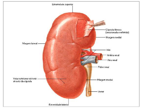 Sistema Urinário Este aparelho pode ser dividido em órgãos secretores – que produzem a urina –, sendo eles os rins, e órgãos excretores – que são encarregados de processar a drenagem da urina para fora do corpo, sendo eles os ureteres, a bexiga e a uretra. PS.: ureteres, bexiga e uretra não modificam a urina ao longo do caminho, ao contrário, elas armazenam e conduzem a urina do rim para o meio externo. RIM Os rins estão situados de cada lado da coluna vertebral, por diante da região superior da parede posterior do abdome, estendendo-se entre a 11ª costela e o processo transverso da 3ª vértebra lombar. São descritos como órgãos retroperitoneais, por estarem posicionados por trás do peritônio da cavidade abdominal. O rim esquerdo é um pouco mais comprido e mais estreito do que o direito. O rim direito normalmente situa-se ligeiramente abaixo do rim esquerdo devido ao fígado. Na margem medial côncava de cada rim encontra-se o hilo renal, onde a artéria renal entra e a veia e a pelve renal deixam o seio renal. No hilo, a veia renal está anterior à artéria renal. O hilo renal é a entrada para um espaço dentro do rim, o seio renal. O seio renal é ocupado pela pelve renal, cálices, nervos, vasos sanguíneos e linfáticos e uma variável quantidade de gordura. Cada rim apresenta duas faces, duas bordas e duas extremidades. FACES (2) – Anterior e Posterior. As duas são lisas, porém a anterior é mais abaulada e a posterior mais plana. BORDAS (2) – Medial (côncava) e Lateral (convexa). EXTREMIDADES (2) – Superior (Glândula Supra-Renal) e Inferior Em um corte frontal através do rim, são reveladas duas regiões distintas: uma área avermelhada de textura lisa, chamada córtex renal e uma área marrom-avermelhada profunda, denominada medula renal. A medula é composta pelas pirâmides renais, cuja base está voltada para o córtex e o ápice, chamado de papila renal, para o hilo. As partes do córtex renal que se estendem entre as pirâmides renais são chamadas colunas renais. Juntos, o córtex e as pirâmides renais da medula renal constituem parênquima do rim. No parênquima estão as unidades funcionais dos rins, os néfrons. A urina, formada pelos néfrons, drena para os grandes túbulos coletores, que se estendem ao longo das pirâmides. Os ductos drenam para estruturas chamadas Cálices Renais Menor e Maior. O cálice renal menor recebe urina dos túbulos coletores de uma papila renal e a transporta até um cálice renal maior. Do cálice renal maior, a urina drena para a Pelve renal e depois para o Ureter, que desemboca na bexiga. Ureter Consiste em dois tubos retroperitonaiais que transportam a urina dos rins para a bexiga. A pelve renal consiste na extremidade superior e mais larga do ureter, localizada no interior do rim. Descendo medialmente, o ureter percorre por diante da parede posterior do abdome, penetrando em seguida na cavidade pélvica, abrindo-se no óstio do ureter localizado na bexiga. Em virtude desse seu trajeto, distinguem-se duas partes do ureter: abdominal e pélvica. Os ureteres são capazes de realizar movimentos peristálticos, que junto com a gravidade, permite o transporte da urina ao longo do tubo. Bexiga A bexiga urinária funciona como um reservatório temporário para o armazenamento da urina. Quando vazia, a bexiga está localizada inferiormente ao peritônio e posteriormente à sínfise púbica: quando cheia, ela se eleva para a cavidade abdominal. É um órgão muscular oco, elástico que, nos homens situa-se diretamente anterior ao reto. Nas mulheres, a bexiga está localizada inferior ao útero e anterior ao canal vaginal. Quando a bexiga está cheia, sua superfície interna fica lisa. Uma área triangular na superfície posterior da bexiga não exibe rugas. Esta área é chamada trígono vesical, que é delimitado pelos óstios uretéricos esquerdo e direito e pelo óstio uretral interno. A saída da bexiga urinária contém o músculo esfíncter chamada esfíncter interno, que se contrai involuntariamente, prevenindo o esvaziamento. Inferiormente ao músculo esfíncter, está localizado o esfíncter externo (voluntário). Obs.: Nos homens, o esfíncter externo da uretra é inferior à próstata. A bexiga é menor nas mulheres porque o útero ocupa o espaço imediatamente superior à bexiga. Uretra A uretra é um tubo que conduz a urina da bexiga para o meio externo, sendo revestida por mucosa que contém grande quantidade de glândulas secretoras de muco. A uretra se abre para o exterior através do óstio externo da uretra. As uretras masculinas e a femininas se diferem em seu trajeto. Na mulher, a uretra é curta e faz parte exclusivamente do sistema urinário. Seu óstio externo localiza-se anteriormente à vagina, dorsalmente à sínfise púbica e entre os lábios menores. Já no homem, a uretra faz parte dos sistemas urinário e reprodutor, sendo muito mais longa que a uretra feminina. Quando a uretra masculina deixa a bexiga, ela passa através da próstata e se estende ao longo do comprimento do pênis. Assim, a uretra masculina atua com duas finalidades: conduz a urina e o esperma. MASCULINA A uretra masculina estende-se do orifício uretral interno na bexiga urinária até o orifício uretral externa na extremidade do pênis. É dividida em três porções: a Prostática, a Membranácea e a Esponjosa. Na uretra prostática, existe uma abertura que consiste no ducto ejaculatório.