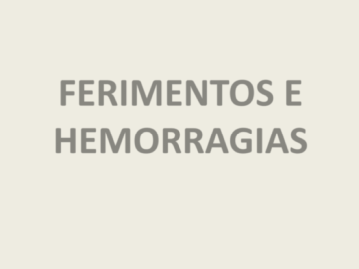 FERIMENTOS E HEMORRAGIAS CONCEITOS HEMORRAGIA: É a perda de sangue circulante. FERIMENTO: É o resultado da agressão sofrida pelas partes moles, produzindo lesão tecidual. LESÕES: São feridas onde há destruição da pele ou mucosa, em razão da força de ação de um agente externo. CLASSIFICAÇÃO DAS LESÕES A) POR INSTRUMENTO CONTUNDENTE: Se dá pelo impacto. O instrumento contundente (objeto) vai de encontro à vítima (Ex. soco, chute, paulada), ou quando o corpo vai de encontro ao objeto contundente. Lesão superficial e Lesão profunda Lesão superficial EQUIMOSE: Lesão causada nos primeiros vasos sanguíneos, ocasionando pequena infiltração de sangue. Passa por estágios de cores, iniciando avermelhada; depois azulada (violeta); em seguida esverdeada e amarelada, até desaparecer totalmente. HEMATOMA: É uma lesão de maior nível. O vaso sanguíneo, junto à área atingida, começa a liberar uma quantidade maior de sangue, sem tempo hábil para que se infiltre no tecido (trama tecidual), provocando com isso acúmulo de sangue local. Lesão superficial ESCORIAÇÃO: Lesão na camada superficial da pele caracterizada por arranhões. O ser humano dispõe de um instrumento escoriante natural, a unha. FERIDA CONTUSA: Lesão provocada por forte impacto sobre a pele. Ocorre um esmagamento do músculo, caracterizado por uma ferida de bordas irregulares. Pode levar ao hematoma. Lesões profundas FRATURA: Perda de continuidade da estrutura óssea. LUXAÇÃO: Perda de contato entre as superfícies articulares. LESÕES VISCERAIS: Sangramento interno, quando ocorre vazamento de fluxo sanguíneo para dentro da cavidade visceral. CLASSIFICAÇÃO DAS LESÕES B) POR INSTRUMENTO CORTANTE: Deslizamento do objeto cortante sobre o tecido epitelial. FERIDA INCISA: bordas regulares e não há através do músculo e entre as bordas, sinais de contusão. CLASSIFICAÇÃO DAS LESÕES C) POR INSTRUMENTO CORTOCONTUNDENTE: Ocorre pelo mecanismo de pressão. Peso do objeto mais a força do agente agressor. Essa ferida chama-se cortocontusa, ou seja, ferida que corta e contunde. Ex.: atropelamento, enxada, machado, foice. CLASSIFICAÇÃO DAS LESÕES D) POR INSTRUMENTO PERFUROCORTANTE: A ação ocorre pelo mecanismo da pressão. O instrumento irá penetrar o corpo, perfurando e cortando. Ex.: punhal. CLASSIFICAÇÃO DAS LESÕES E) POR INSTRUMENTO PERFURANTE: A ação perfurante tem também a ação de pressão. Ex. agulhas. A profundidade da ferida perfurante poderá ser maior do que o comprimento da lâmina, desde que o instrumento atinja uma região de tecido elástico (abdômen) e o agente agressor, após introduzir totalmente o objeto, pressioná-lo para dentro. Pode levar a lesões leves, moderadas e gravíssimas. CLASSIFICAÇÃO DAS HEMORRAGIAS Hemorragia venosa: sangramento mais escuro, que sai escorrendo. Hemorragia arterial: sangramento de cor viva (rutilante), que sai em jatos. Hemorragia Externa: são aquelas com origem na superfície corporal. Hemorragia Interna: são aquelas que não ocorrem na superfície corporal podem ser divididas em exteriorizadas ou não exteriorizadas. SÃO EXTERIORIZADAS QUANDO O SANGRAMENTO APRESENTA- SE PARA O MEIO EXTERNO. HEMORRAGIAS INTERNAS EXTERIORIZADAS OTORRAGIA: sangramento pelo conduto da orelha externa. ESTOMATORRAGIA: sangramento proveniente da cavidade oral, incluindo as hemorragias dentárias. Usamos roletes de gaze sobre a lesão, fazendo compressão. HEMORRAGIAS INTERNAS EXTERIORIZADAS EPISTAXE: sangramento pelas narinas. Fazemos compressão manual. Pode-se utilizar gelo juntamente com a compressão nos casos de trauma. Em último caso, fazemos o tamponamento anterior, utilizando roletes de gaze com vaselina. OBSERVAÇÃO: NUNCA SE UTILIZA GELO DIRETAMENTE SOBRE A PELE, NEM SOBRE A GENITÁLIA E MUCOSAS! HEMOSTASIA Ação de contenção das hemorragias PROCEDIMENTOS EM HEMORRAGIAS EXTERNAS • Nunca toque a ferida; • Não toque nem aplique medicamento ou qualquer produto no ferimento; • Não tente retirar objeto empalado; • Proteger com gazes ou pano limpo, fixando com bandagem, sem apertar o ferimento; • Fazer compressão direta também chamada de compressão local suficiente para cessar o sangramento; • Se o ferimento for em membros, deve-se elevar o membro ferido (usar a gravidade à nosso favor); • Torniquete deverá ser usado, em último caso, sendo feito com uso do manguito do esfignomanômetro. • Procurar socorro adequado. TORNIQUETE PROCEDIMENTOS EM HEMORRAGIAS INTERNAS Devemos nos atentar em alguns sinais externos que são característicos de hemorragia interna: a) Pulso fraco e acelerado; b) Se a pele está fria, pegajosa e pálida e mucosas da boca e dos olhos esbranquiçadas; c) Extremidades cianóticas. d) Respiração curta, rápida e irregular. PROCEDIMENTOS EM HEMORRAGIAS INTERNAS • Mantenha as vias áreas liberadas*; • Mantenha a vítima deitada*; • Afrouxe a roupa apertada no pescoço, no peito e na cintura; • Aplique compressas frias no local onde a vítima foi atingida; • Caso a vítima vomite, vire-lhe a cabeça para o lado; • Não dê nada para o paciente beber; • Observe cuidadosamente o paciente*; • Procure socorro adequado. FERIMENTOS ESPECIAIS Ferimento na cabeça: • Liberar e manter as vias aéreas com o controle cervical; • Observar o estado de consciência da vítima; •Evitar mexer a pessoa, para evitar traumas secundários, na medula; • Controlar as hemorragias presentes; •Proteger o ferimento com gaze ou pano limpo, sem apertar a ferida; • Se apresentar vômito, proceder o rolamento lateral; • Se apresentar sangramento ou saída de líquor pelo nariz ou ouvido, não tentar conter; • Procure socorro adequado. Ferimentos nos olhos • Não tente remover objetos da córnea; • Não faça curativo compressivo*; • Não remova objetos empalados, estabilize-os; • O curativo deve ser frouxo e nos dois olhos*; • Presença de corpos estranhos ou em caso de queimadura química,
