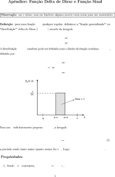 Apêndice: Função Delta de Dirac e Função Sinal Observação: use e abuse, mas em hipótese alguma mostre estas notas para um matemático. Definição: para uma função f(x) qualquer regular, definimos a "função generalizada"' ou "distribuição"' delta de Dirac (δ(x− a)) através da integral: c∫ b f(x)δ(x− a)dx = f(a) se a ∈ (b, c)0 se a /∈ (b, c) A distribuição δ(x−a) tambem pode ser definida como o limite da função contínua δε(x−a), definida por: δε(x− a) = 0, se x < a− ε 1 2ε , se a− ε < x < a+ ε 0, se x > a+ ε Para um ε suficientemente pequeno (ε¿ 1), a integral: c∫ b f(x)δε(x− a)dx ' ( f(a) 1 2ε ) 2ε ' f(a), (1) a precisão sendo tanto maior quanto menor for o ε. Logo: limε→0 δε(x− a)→ δ(x− a). Propriedades 1. Sendo a e b constantes, δ(ax− b) = 1|a|δ(x− ba). 1 2. ∫ dx f(x) d dx δ(x− a) = − ∫ dx d dx f(x) δ(x− a) 3. Transformada de Fourier δε(x− a) = ∫ dk√ 2pi δε(k, a)e ikx (2) δε(k, a) = ∫ dx√ 2pi δε(x− a)e−ikx (3) δε(k, a) = a+ε∫ a−ε dx√ 2pi 1 2ε e−ikx = 1 2ε √ 2pi 1 −ik ( e−ik(a+ε) − e−ik(a−ε) ) = e−ika√ 2pi sin(kε) kε Agora, observe que δε(x− a) = +∞∫ −∞ dk√ 2pi [ e−ika√ 2pi sin(kε) kε ] eikx = ∫ dk ( eik(x−a) 2pi )( sin(kε) kε ) Assim, tomando o limite ε→ 0, obtemos a representação de Fourier do delta de Dirac: δ(x− a) = 1 2pi +∞∫ −∞ dkeik(x−a). (4) Função degrau e Função Sinal 2 θ(x− a) .= 1 se x > a0 se x < a θ(a− x) .= 1 se a > x0 se a < x θ(x− a) + θ(a− x) = 1 ε(x− a) .= x− a|x− a| = 1 se x > a−1 se x < a ε(a− x) .= a− x|a− x| = 1 se a > x−1 se a < x ε(a− x) = −ε(a− x) ε(x− a) = θ(x− a)− θ(a− x) A função "generalizada" θ(x− a) é o limite de função contínua θε(x− a) tal que: θε(x− a) = 0 se x < a− ε 1 2 + x−a 2ε se a− ε < x < a+ ε 1 se x > a+ ε Derivando esta função, vemos que: d dx θε(x− a) = 0 se x < a− ε 1 2ε se a− ε < x < a+ ε 0 se x > a+ ε 3 ≡ δε(x− a) De onde (após tomar o limite) seguem os resultados: d dx θ(x− a) = δ(x− a) d dx ε(x− a) = 2δ(x− a) d dx ε(a− x) = −2δ(x− a) d dx θ(a− x) = −δ(x− a) Representação de Fourier de θ(x− a) Definindo: θη(x − a) = e−η(x−a)θ(x − a), podemos calcular sua transformada de Fourier e escrever sua transformada inversa (representação de Fourier) como θ(x− a) = lim η→0+ θη(x− a) = 1 2pi +∞∫ −∞ dk i k + iη eik(x−a) Observação: a função contínua δε(x − a) usada acima para definir o δ(x − a) é um ex- emplo dentre muitas diferentes funções que podem ser usadas para o mesmo fim. Outras interessantes (que além de serem contínuas, tem tb derivadas contínuas) são: δε(x− a) = 1√ ε2pi e−(x−a) 2/ε2 , (ε→ 0) δε(x− a) = 1 pi ε (x− a)2 + ε2 , (ε→ 0) δη(x− a) = 1 pi sen[(x− a)η] (x− a) , (η →∞). 4